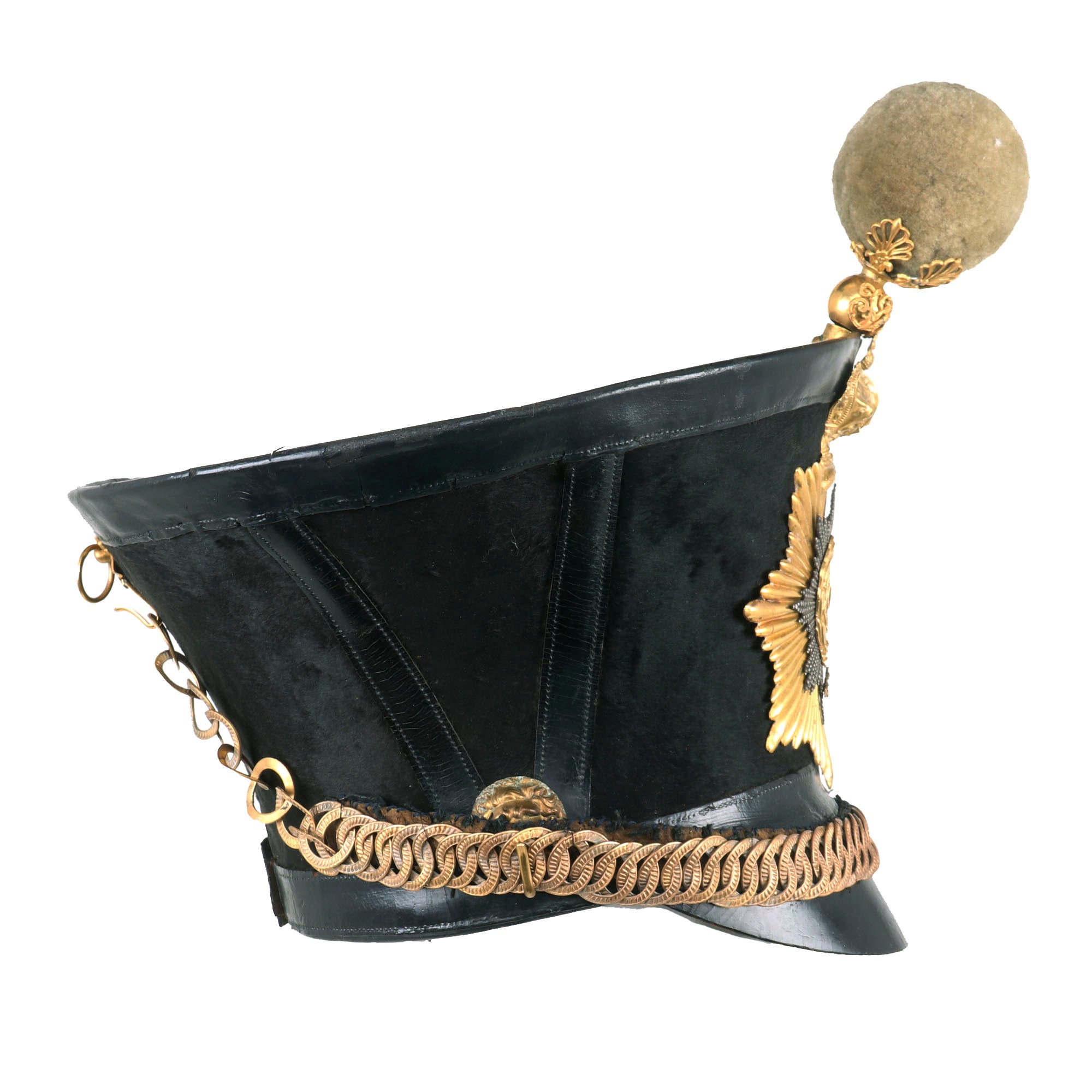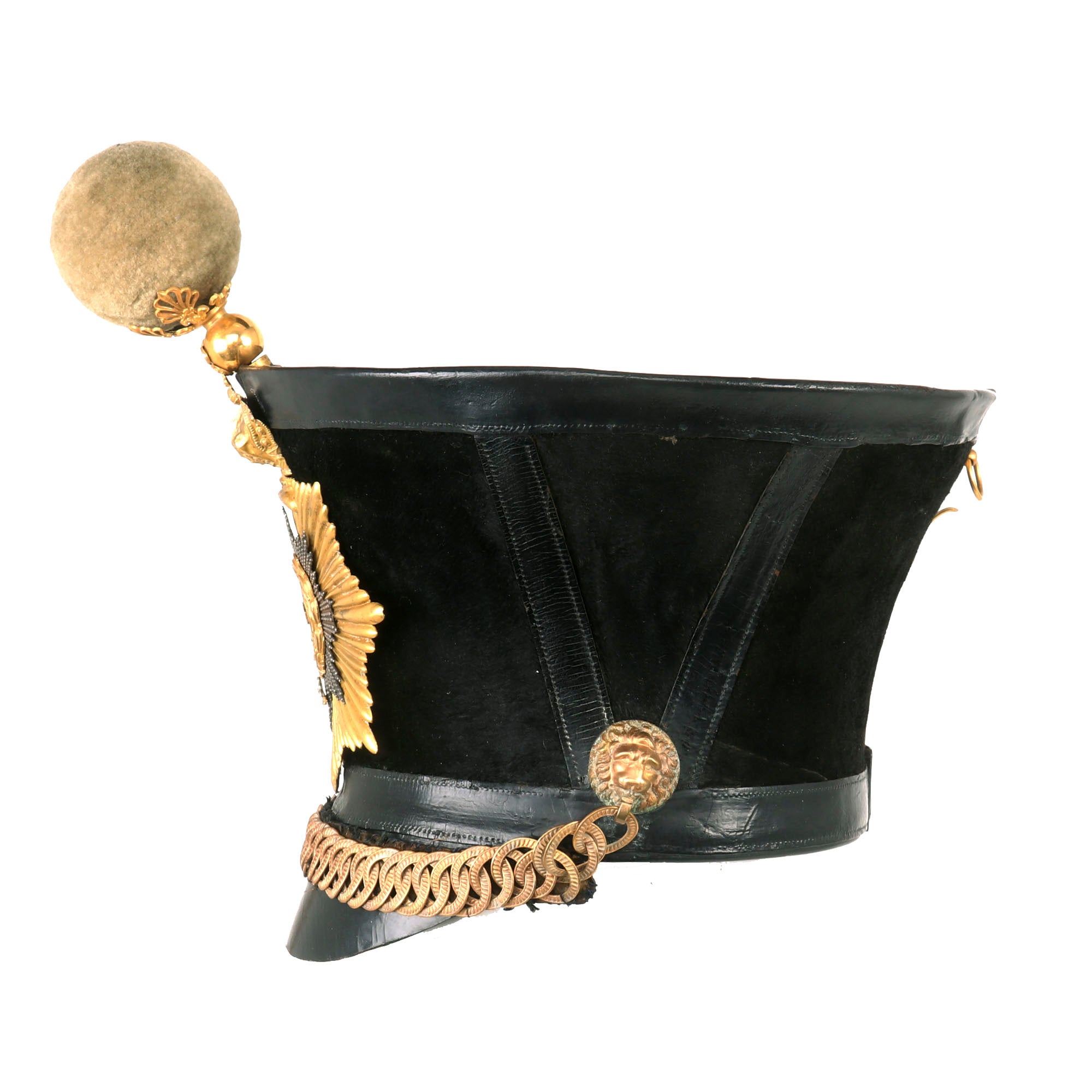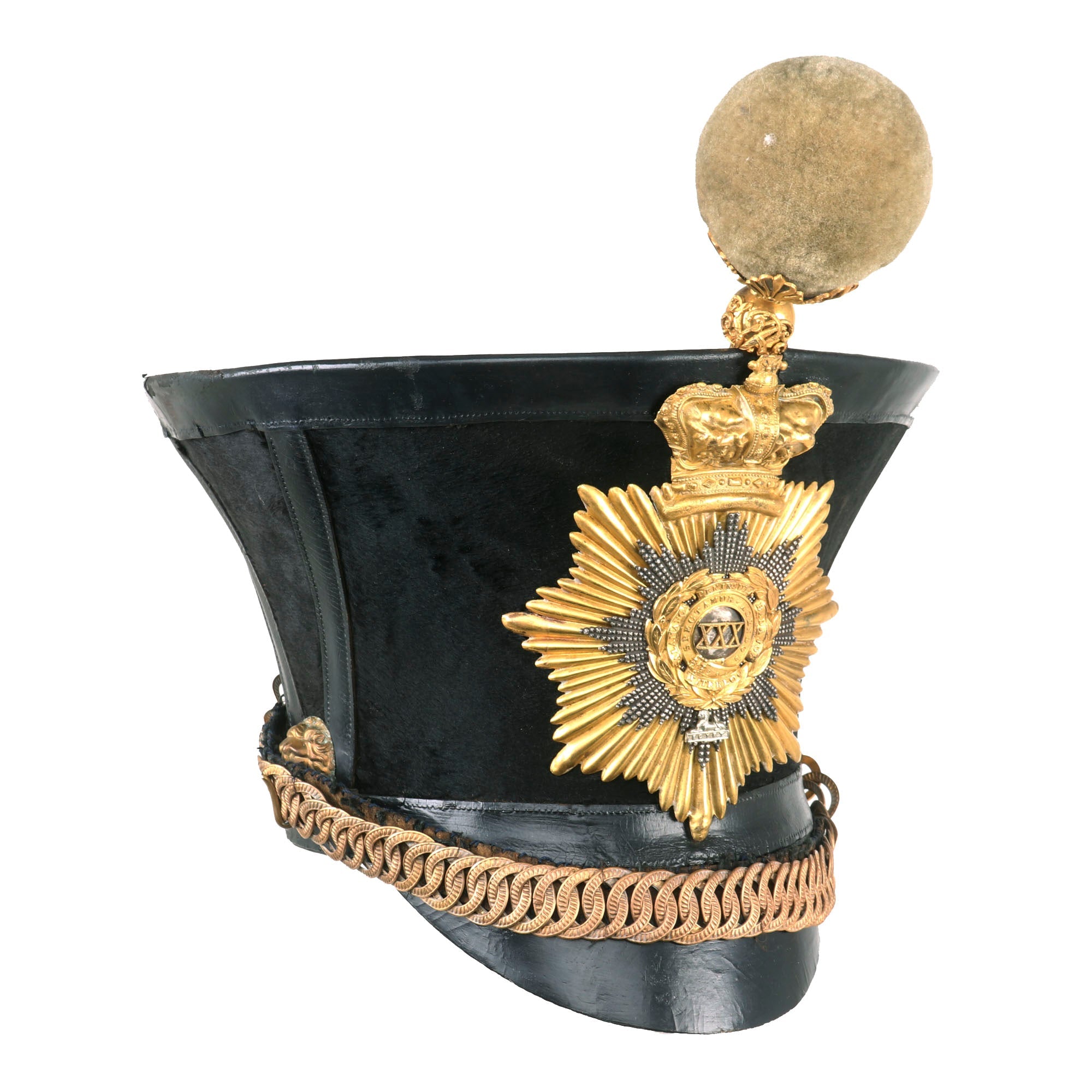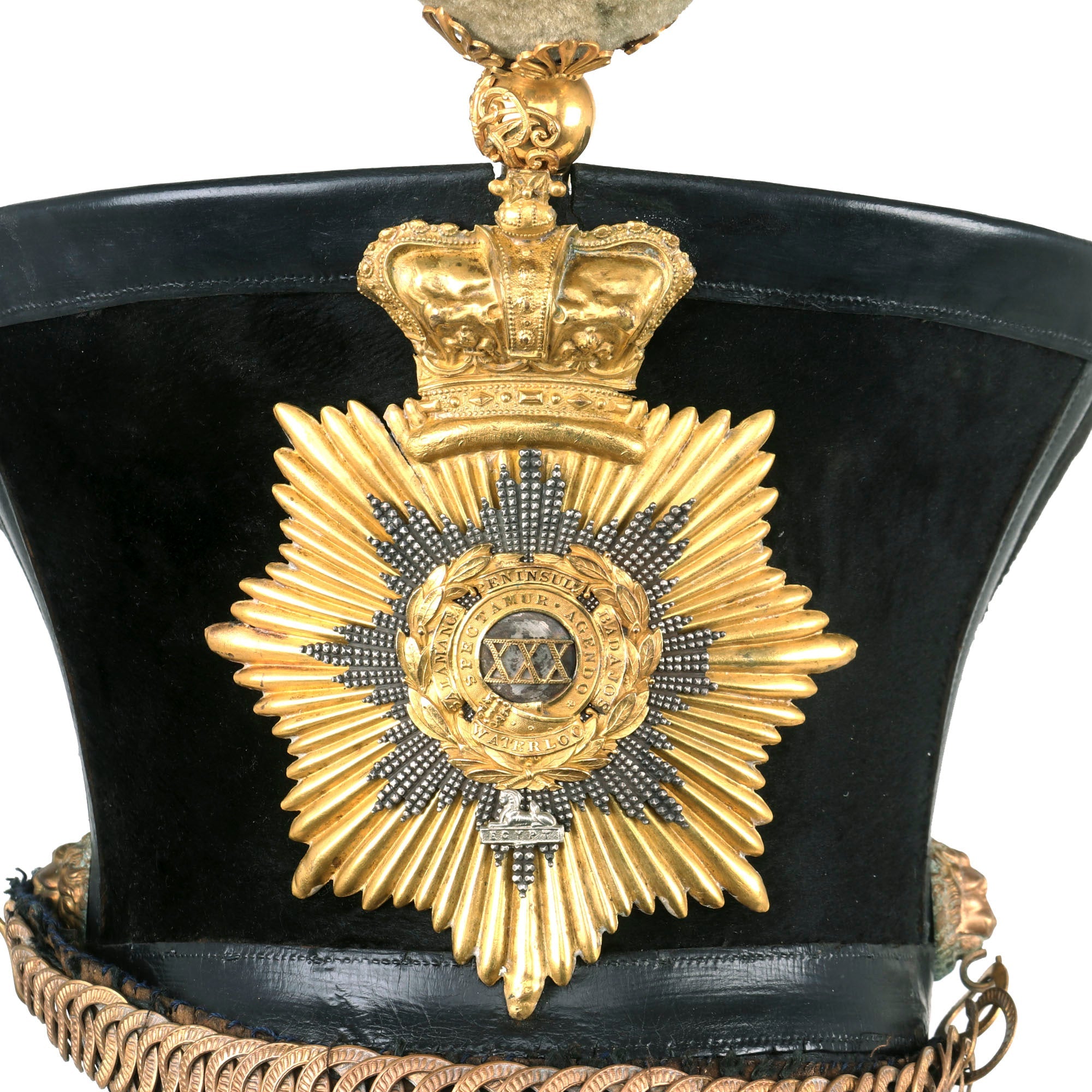 Original Item. Only One Available. This is the most tremendous example of a “Bell Top” shako we have ever offered, fully complete with a gilt plate of the 30th (Cambridgeshire) Regiment of Foot, a regiment which served with distinction during the Battle of Waterloo in June 1815. The shako has retained its Bell Top shape very well, and still retains much of the felt finish on the exterior, as well as the complete sweatband on the interior. The plate even fully retains its white ball tuft which protrudes from the tip of the crown. This model of shako would have been worn by Officers of the regiment from the late 1820s up until 1843, when the Bell Top was replaced by the Albert shako.