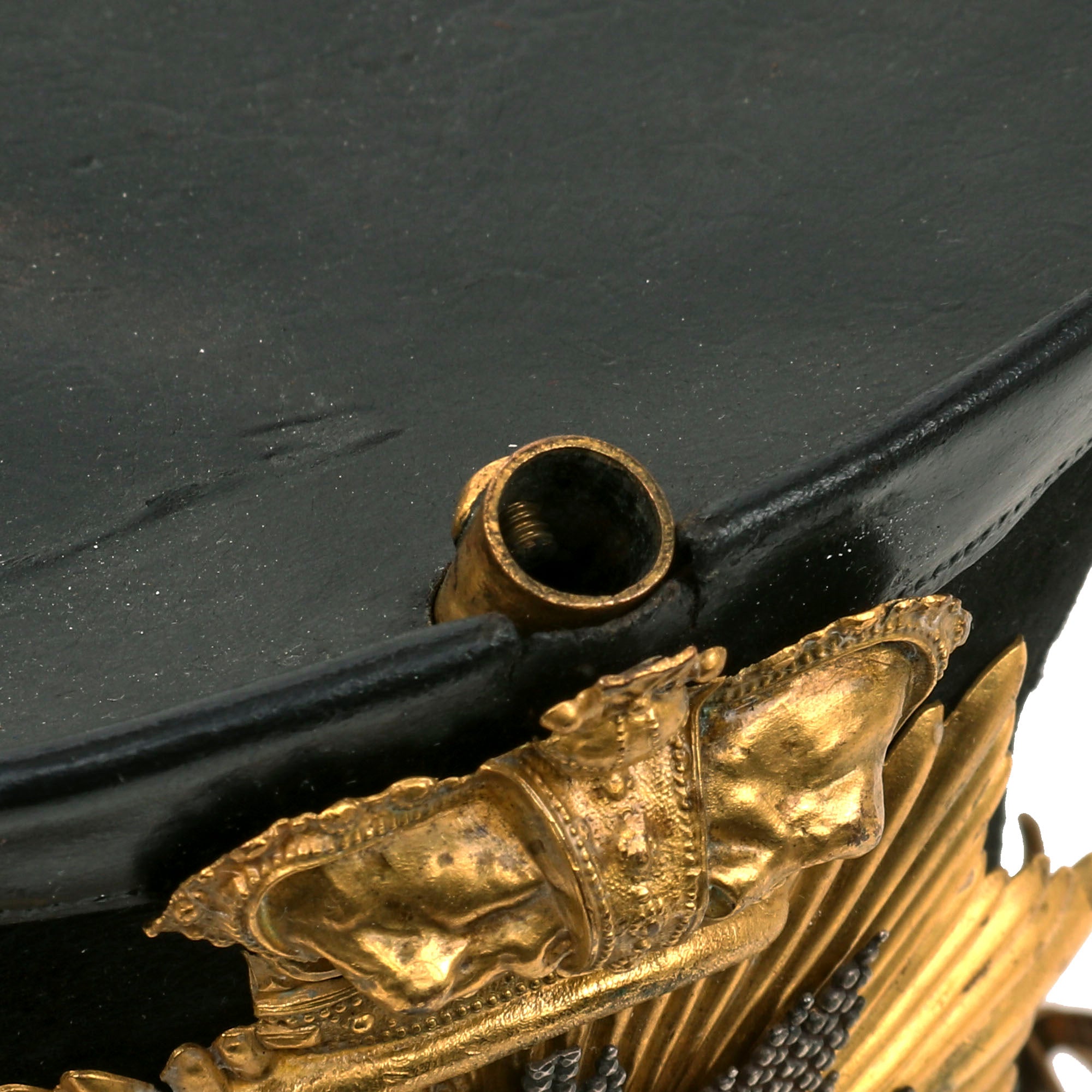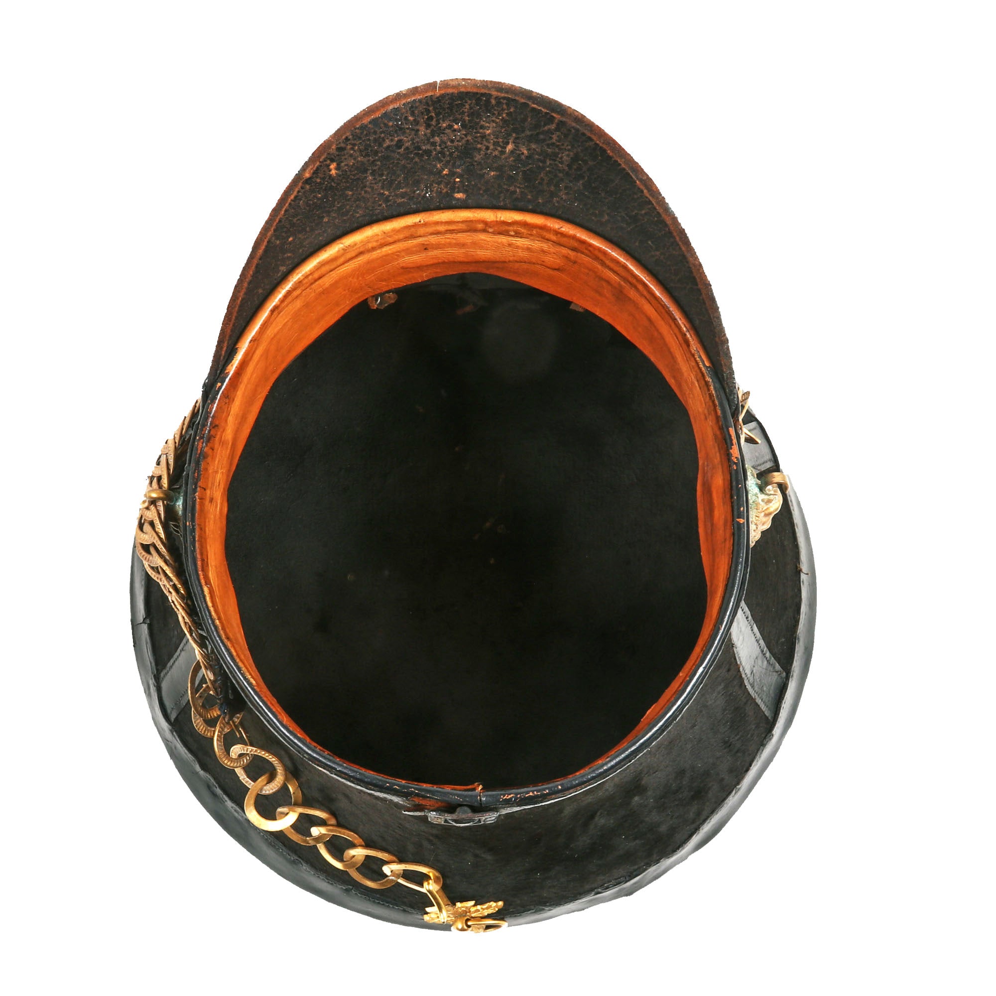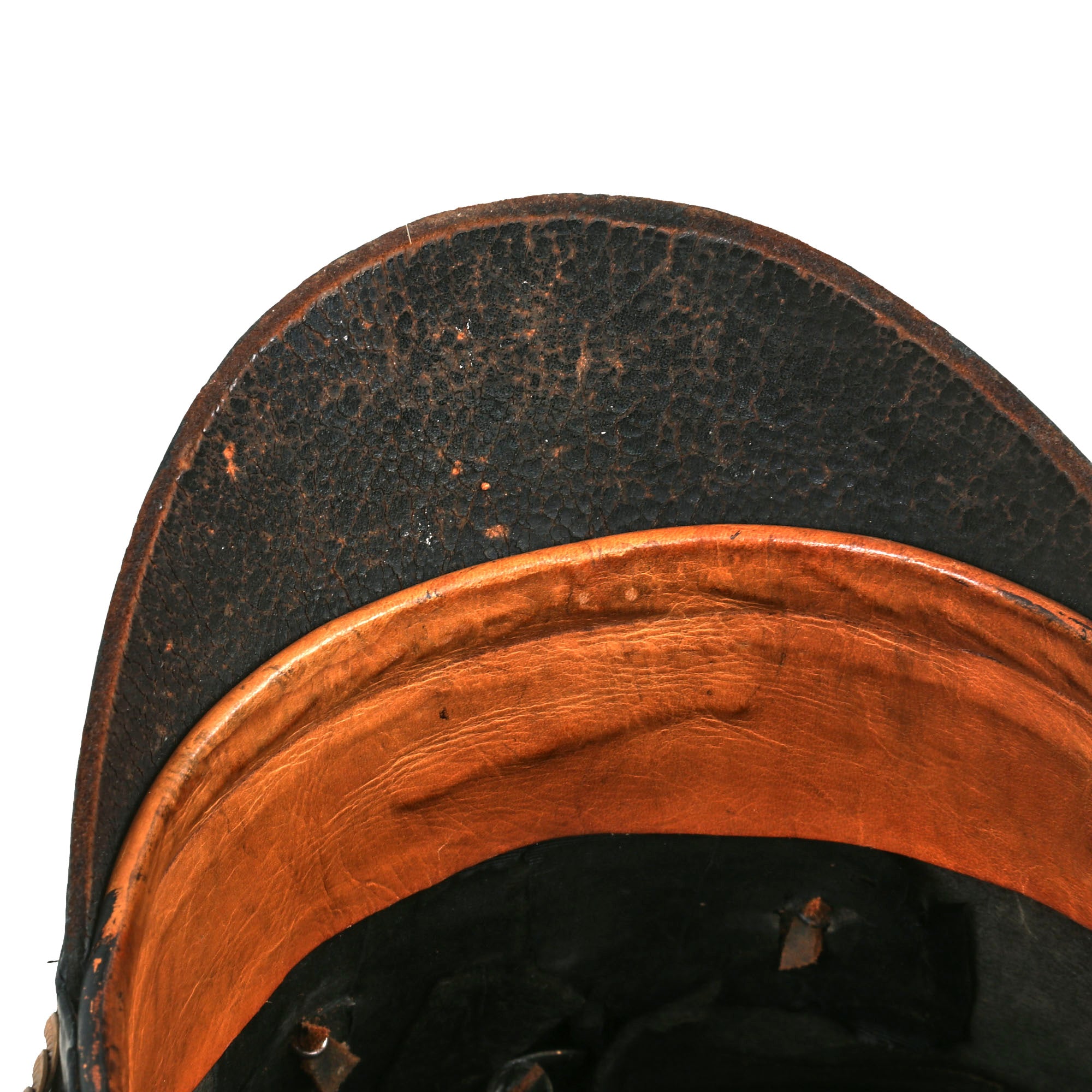 Both sides of the shako are adorned with a Lion’s head chinstrap bale which holds the chinscales, which do miraculously retain their leather strap, although it is fraying a bit as shown. The chinscales correctly surround most of the hat and are hung from the floral post at the back of the shako. The buckle at the back of the shako appears to have been in its current position for over a century, so we have left it as is. The crown of the shako does display some level of warping which is well-known to happen to these Bell Top shakos over time, and is a testament to its age and authenticity. The front visor of the shako is also very well-retained and the stitching is still strong. The sweatband on the interior of the shako is also complete and displays very beautifully.