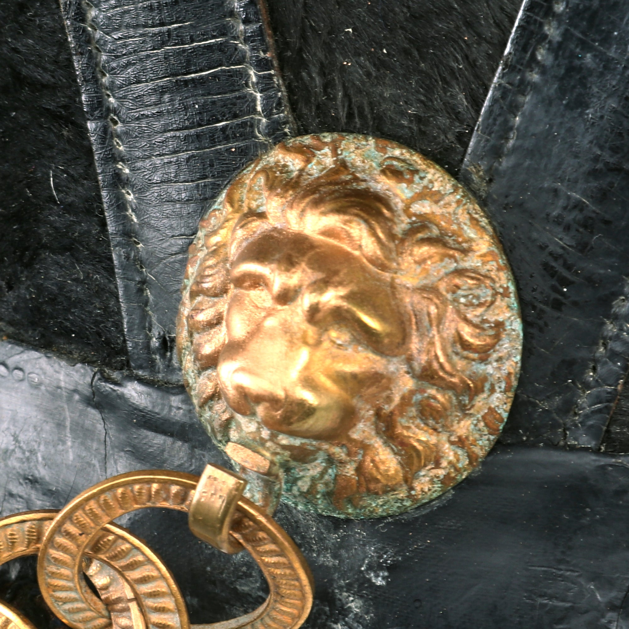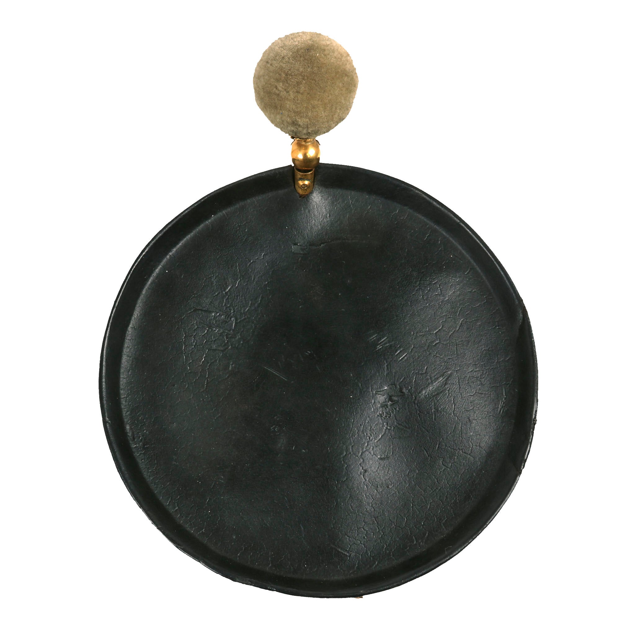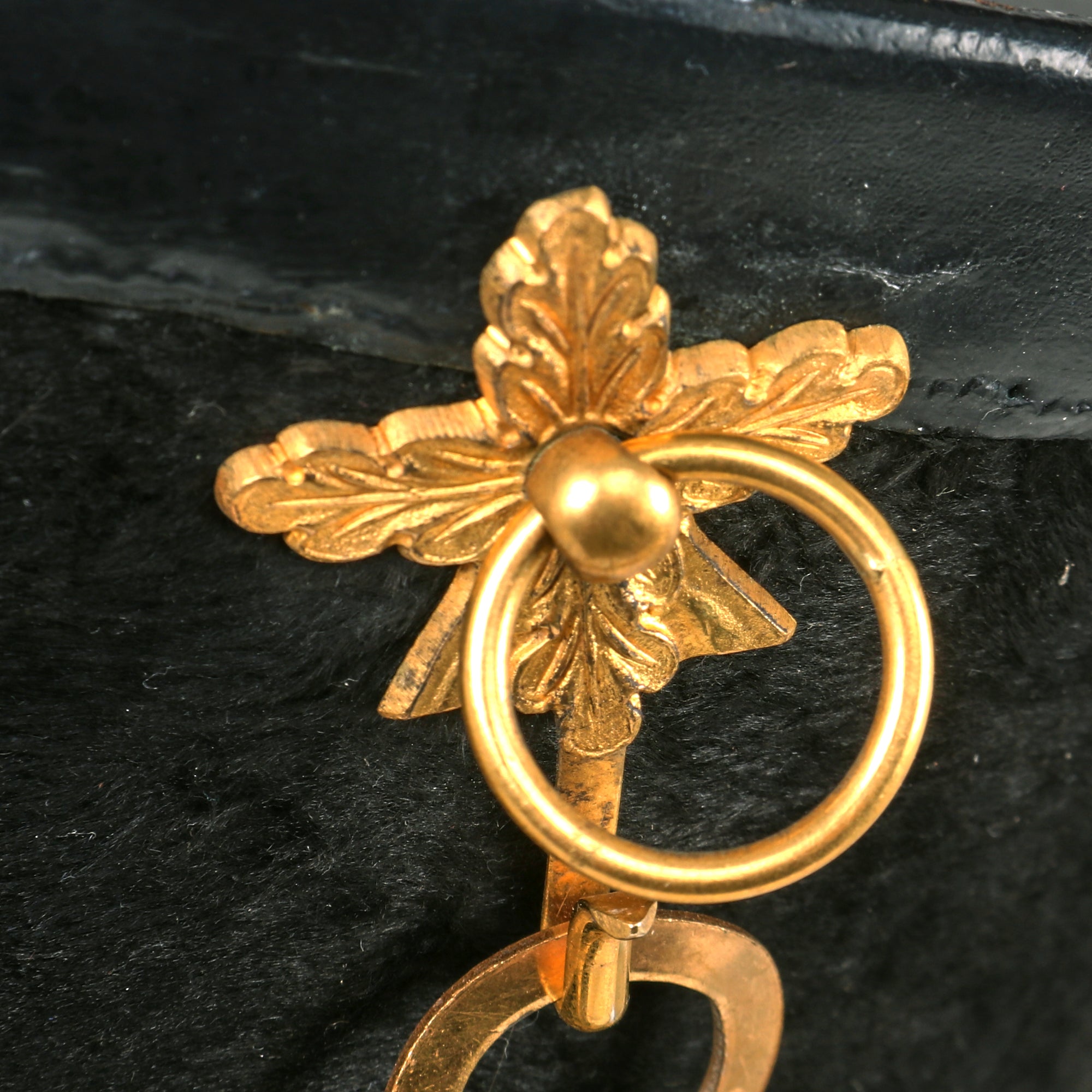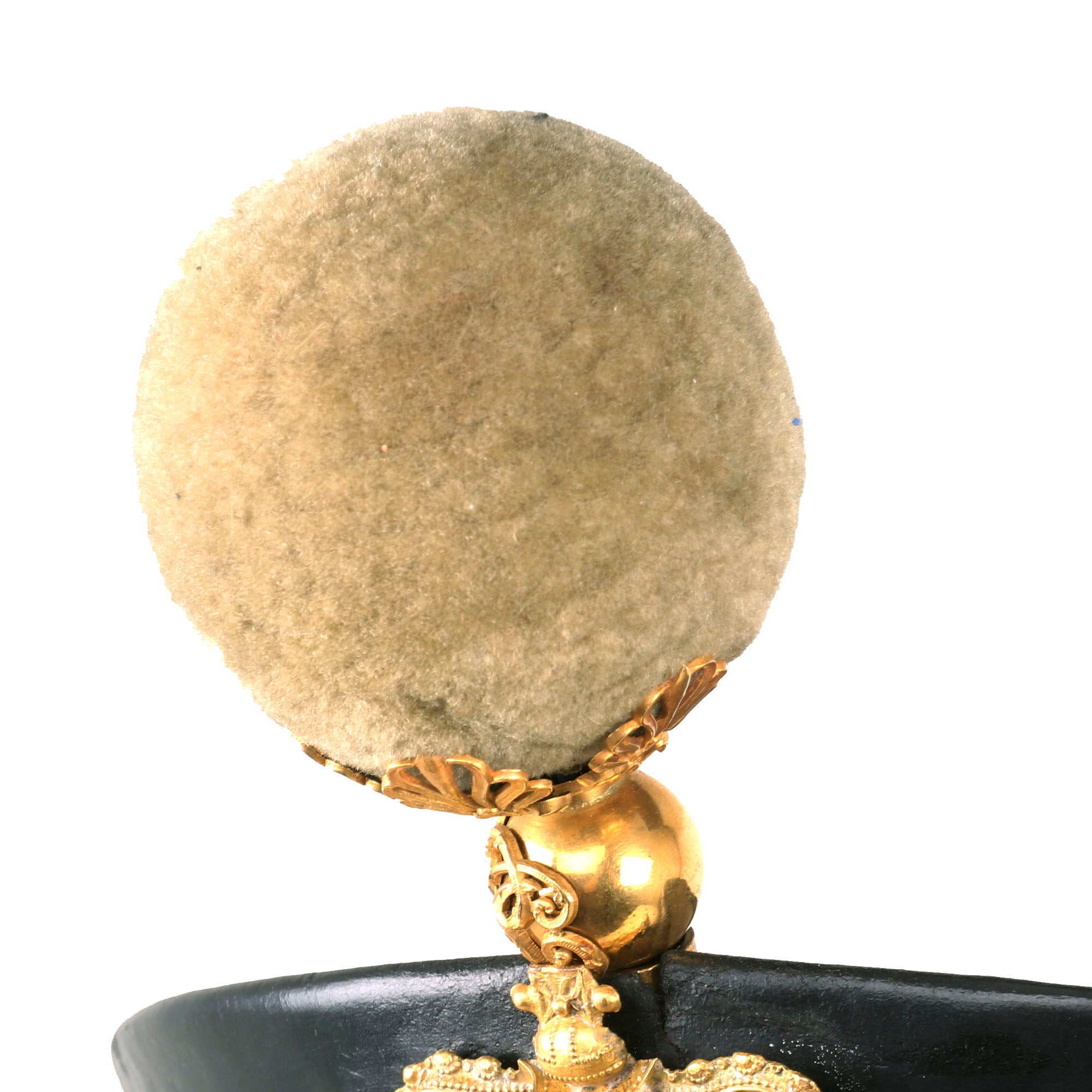Both sides of the shako are adorned with a Lion’s head chinstrap bale which holds the chinscales, which do miraculously retain their leather strap, although it is fraying a bit as shown. The chinscales correctly surround most of the hat and are hung from the floral post at the back of the shako. The buckle at the back of the shako appears to have been in its current position for over a century, so we have left it as is. The crown of the shako does display some level of warping which is well-known to happen to these Bell Top shakos over time, and is a testament to its age and authenticity. The front visor of the shako is also very well-retained and the stitching is still strong. The sweatband on the interior of the shako is also complete and displays very beautifully.