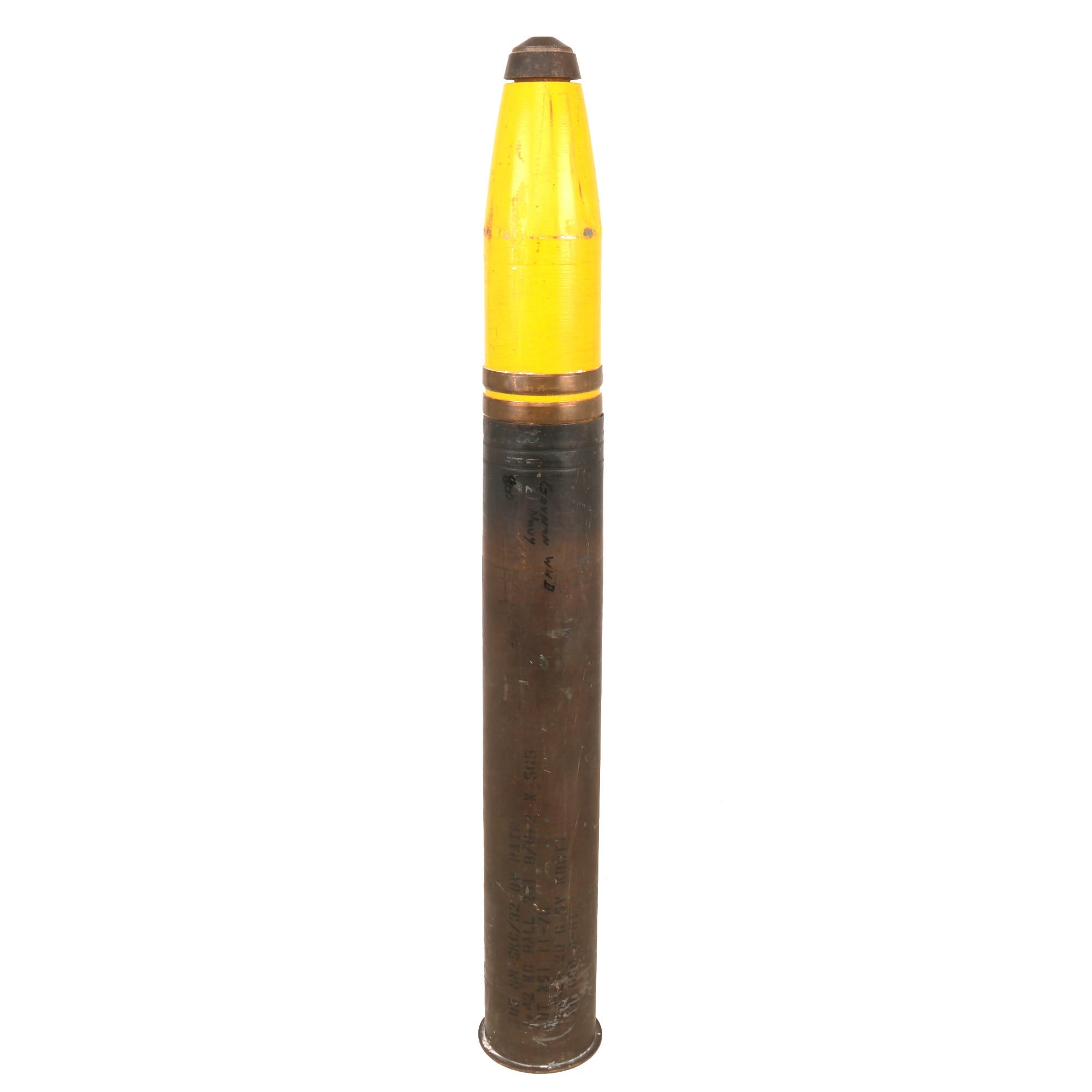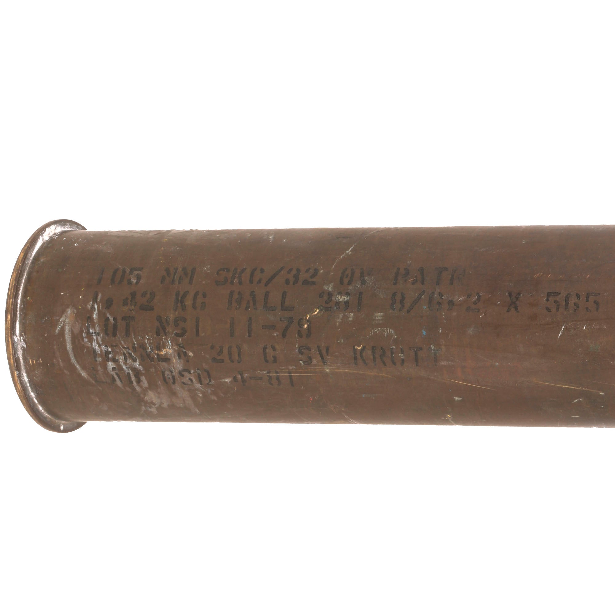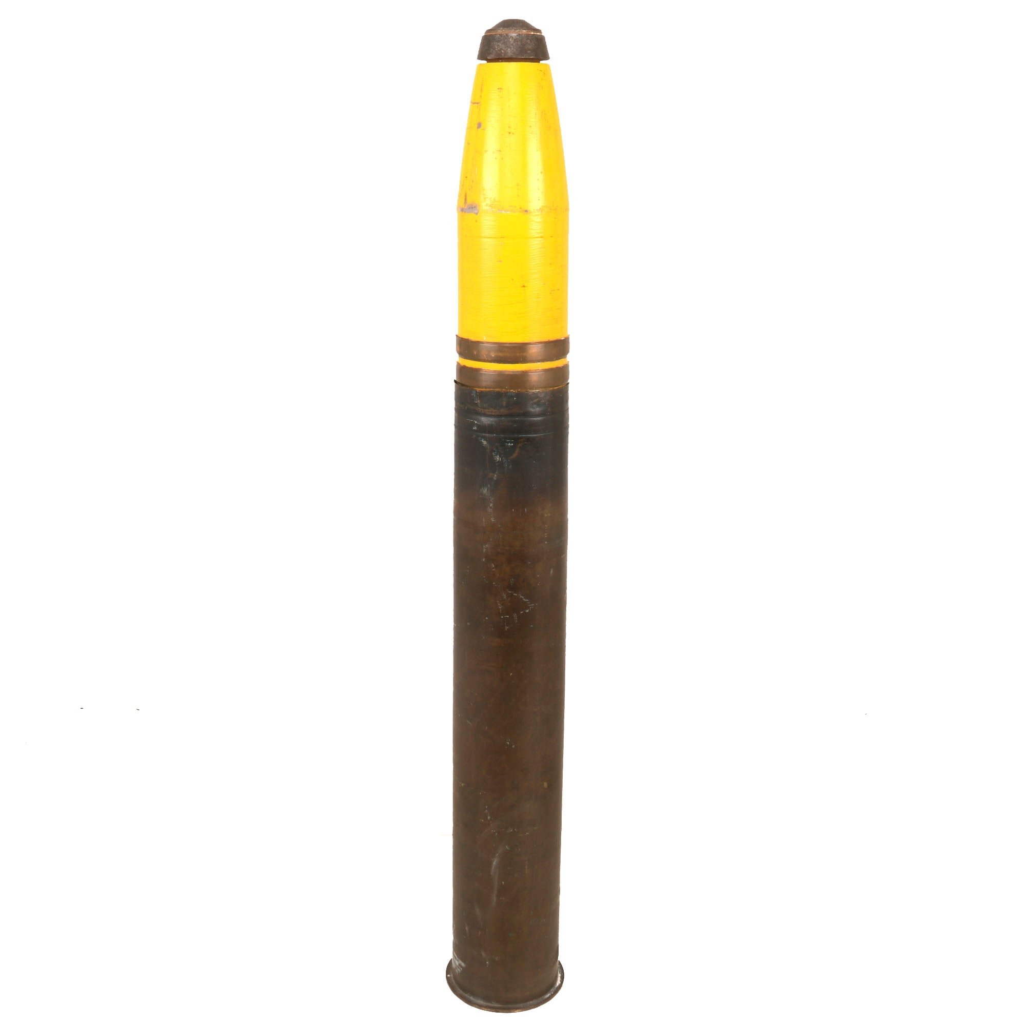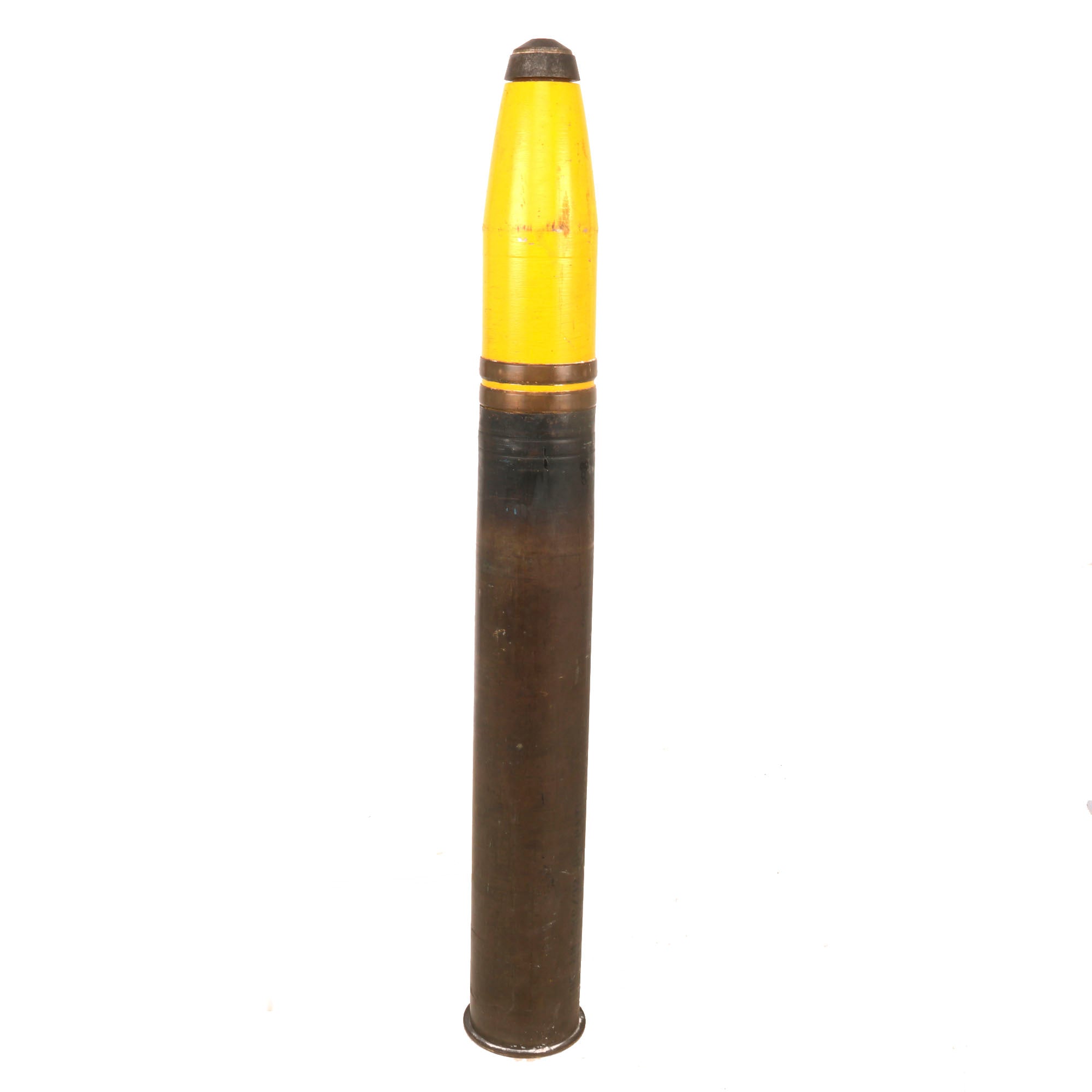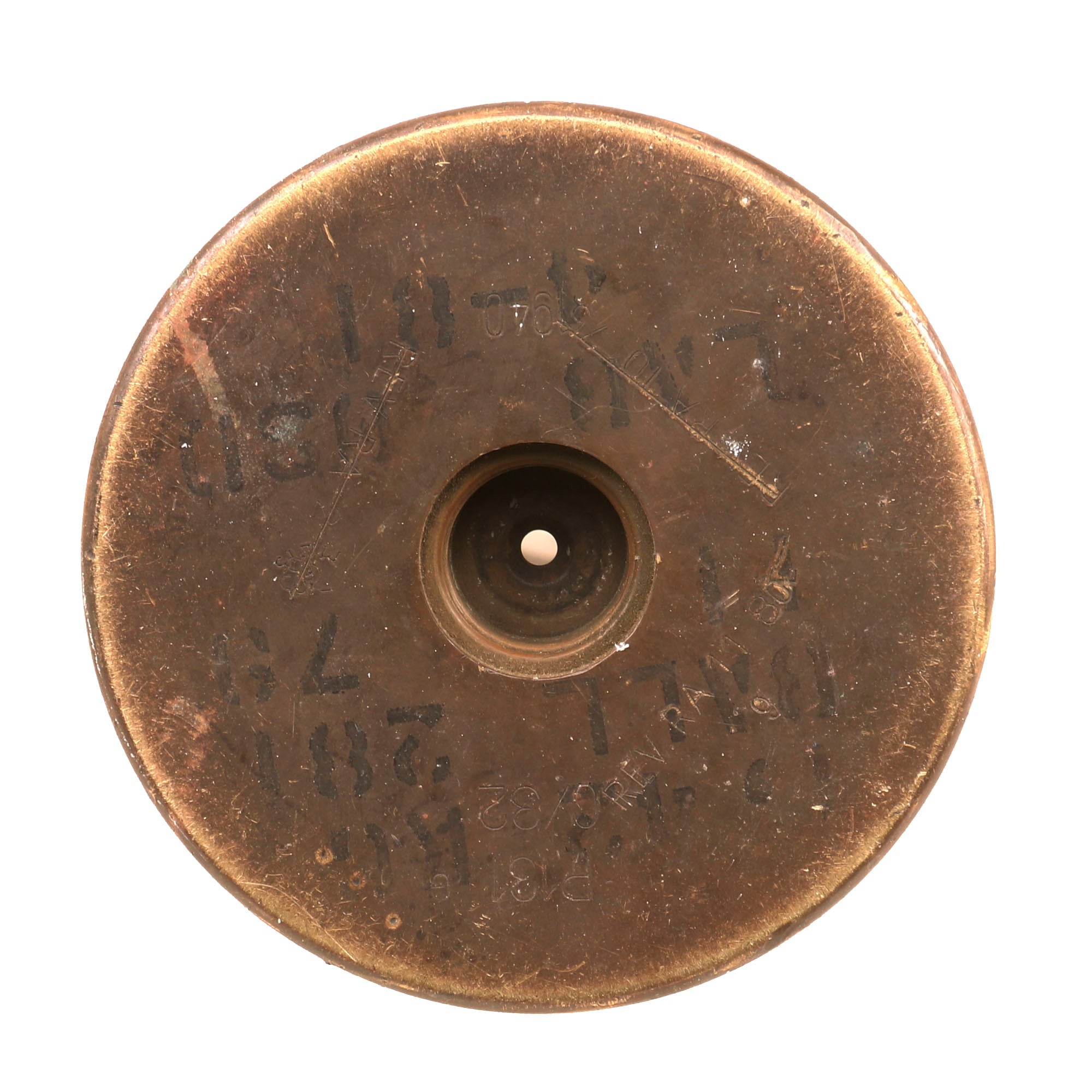 Original Item. Only One Available. The 10.5 cm SK C/32 (SK - Schiffskanone (ship board cannon) C - Construktionsjahr (year of design), was a widely used German naval gun on a variety of Kriegsmarine ships during World War II. Originally designed as a surface weapon, it was used in a number of other roles such as anti-aircraft and coastal defence; wet-mounts were developed for U-boats. On the base of the round are the German Navy acceptance stamps, with the well-known Eagle M Kriegsmarine proof. Like all deactivated ordnance, this projectile is Not Available for Export.