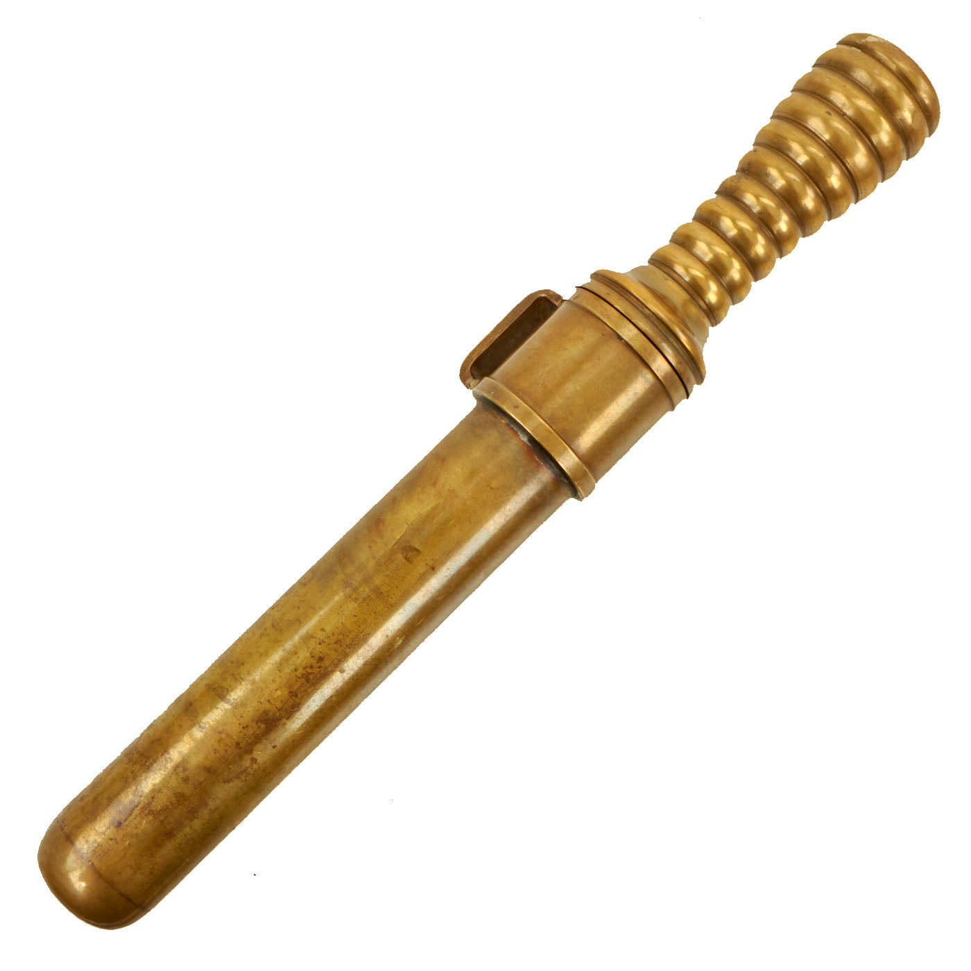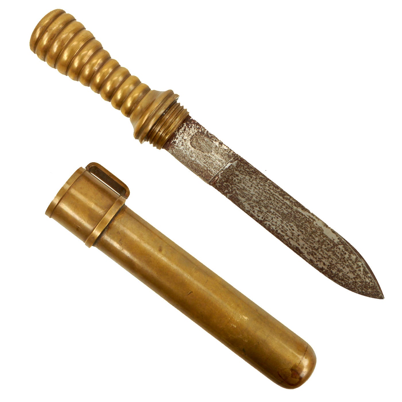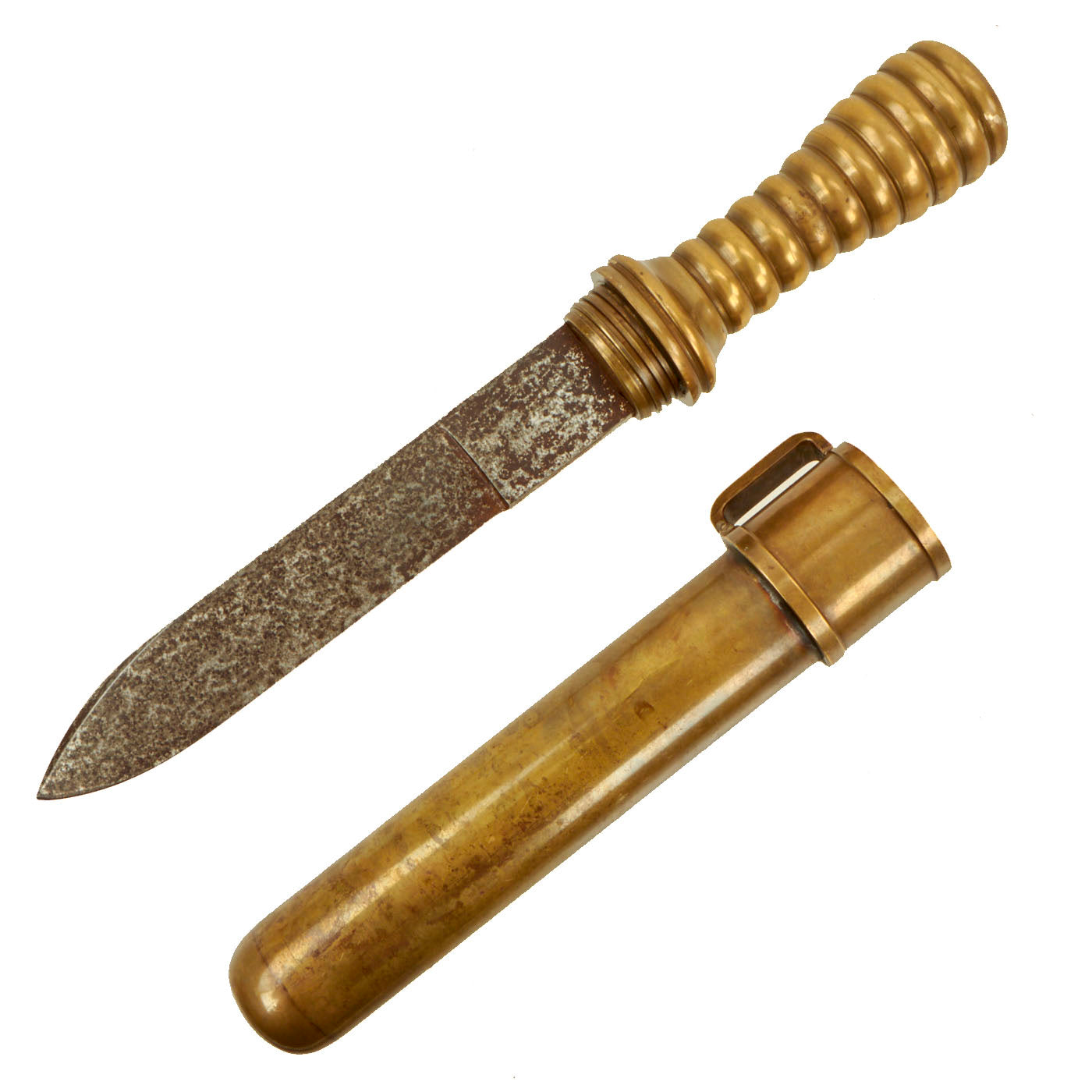 Original Item: One of a Kind. This is a rare example of an early 20th Century French Navy Diver's Knife, complete with the original brass scabbard. We have consulted many historical photographs, and the style of the handle and the type of securing nut on the end of the pommel definitely match the French style. They are similar to those used by Germany, however the shape of the handle and scabbard are different from the more angular German design. Originals are almost never seen on the market, as most were lost long ago during a dive or melted down for the brass. This example is completely correct and genuine, with a lovely aged patina on the exterior.