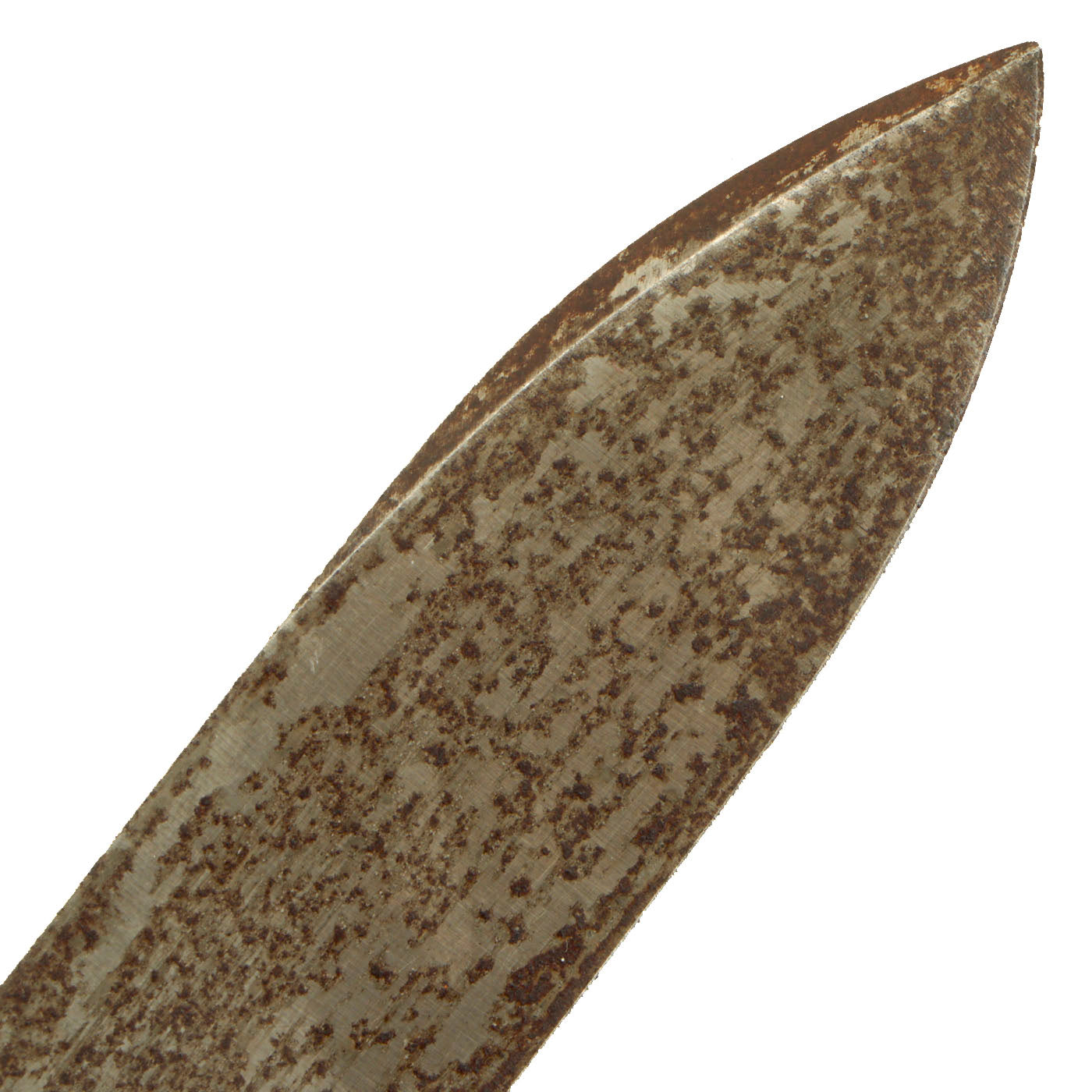Condition is very good, and the blade does not appear to have been sharpened, or used much, though it unfortunately has stained and oxidized over the years. The original factory final grind marks can still be seen between the rust stains. The sealing washer for the scabbard is missing. The bottom of the scabbard is rounded, correct for French diver's knives.