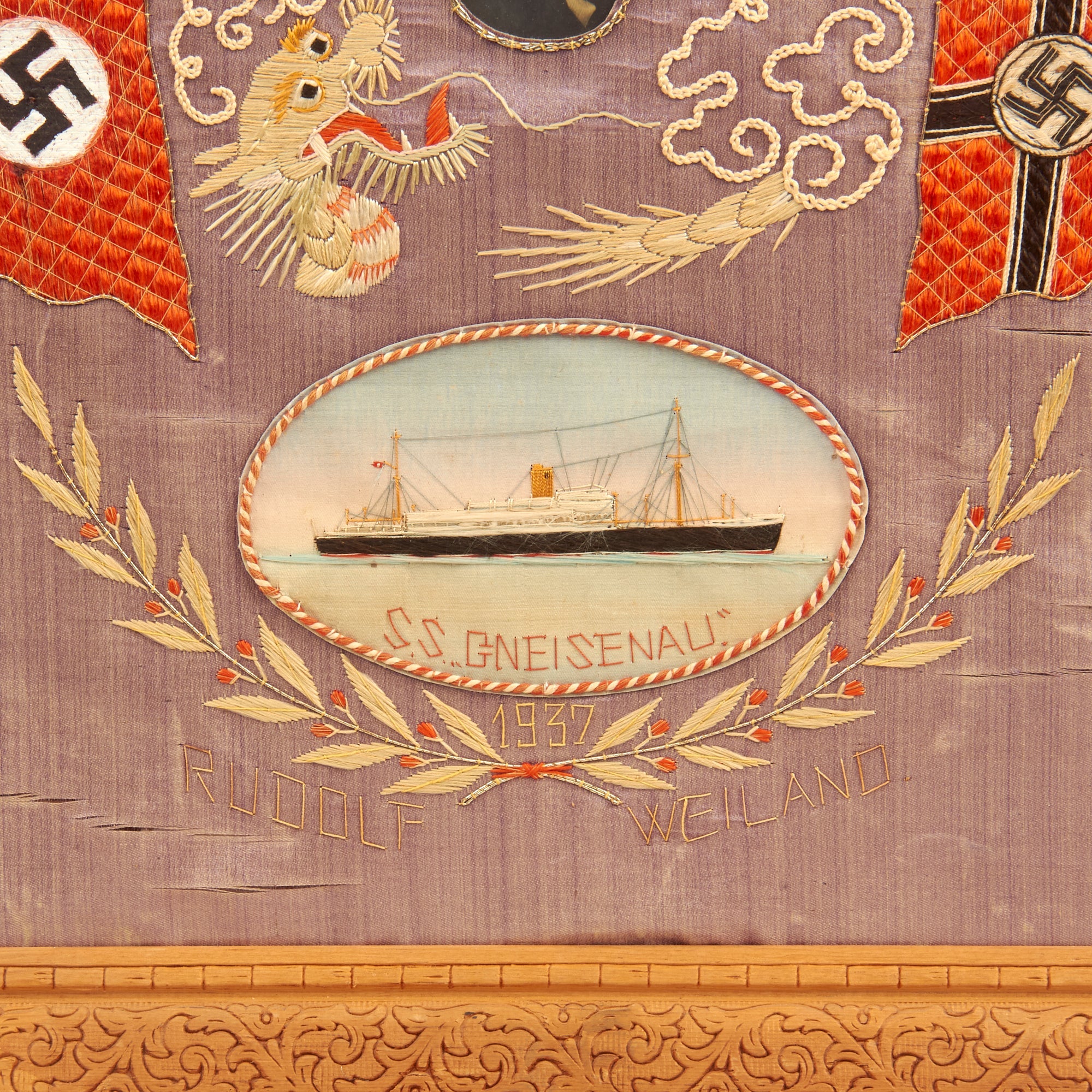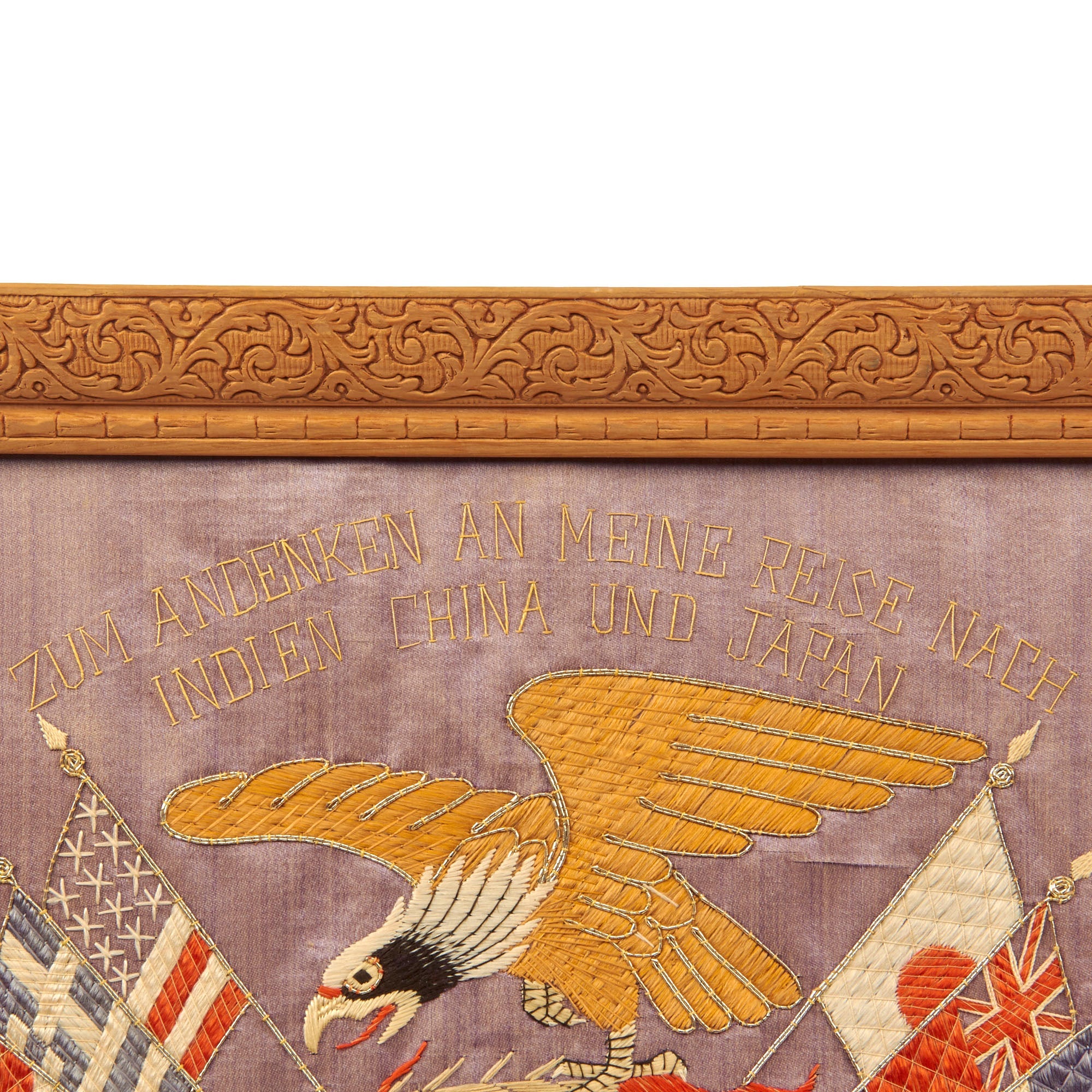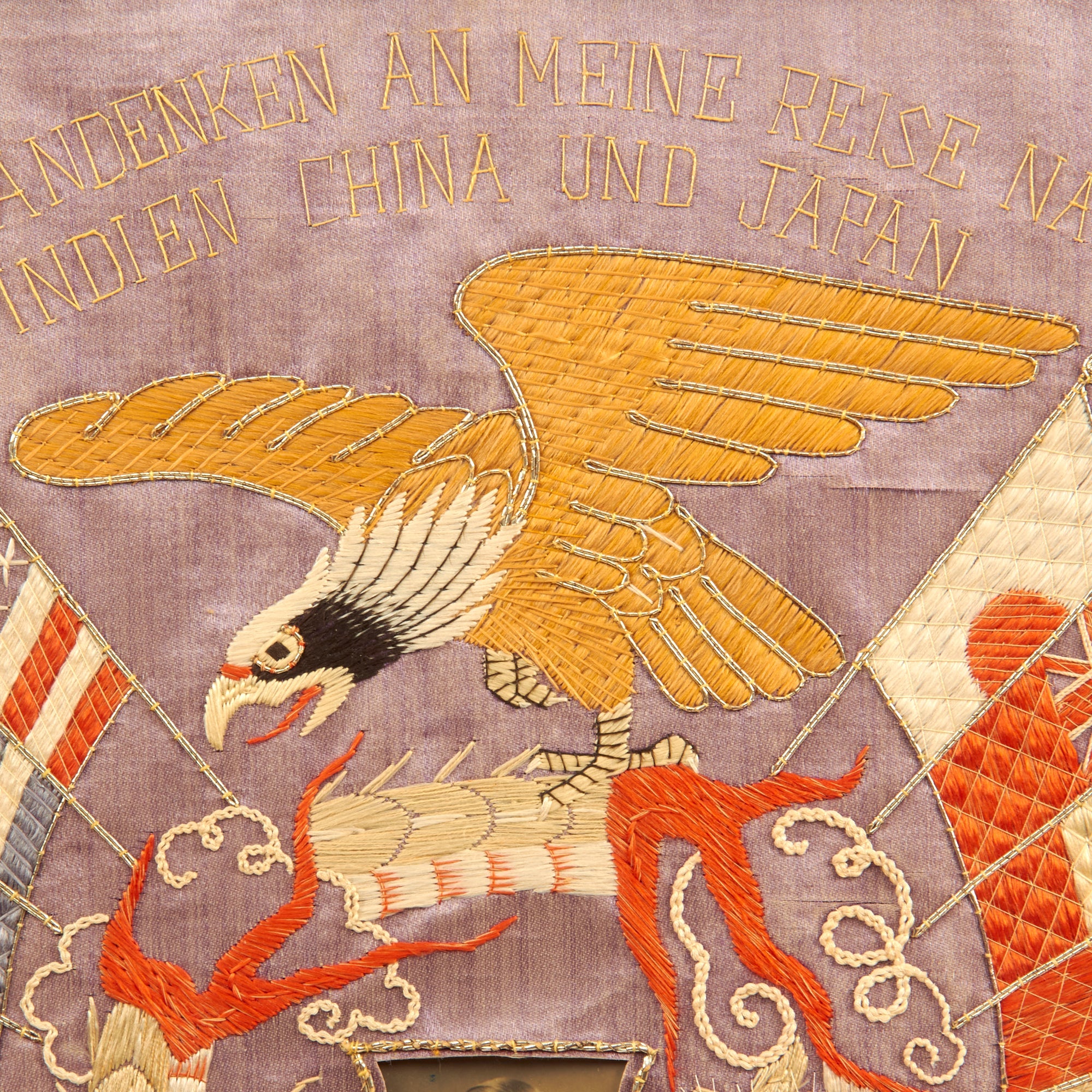 During one of these voyages, a German man named Rudolf Weiland was on board, and had this lovely "Tour Flag" made to commemorate all of the different countries he had been to, presumably while on board the ship. The 15 ½" x 19 ½" flag is embroidered with a few painted areas, and has a portrait mounted in the center. There is a really well executed eagle near the top, and embroidered text that reads: