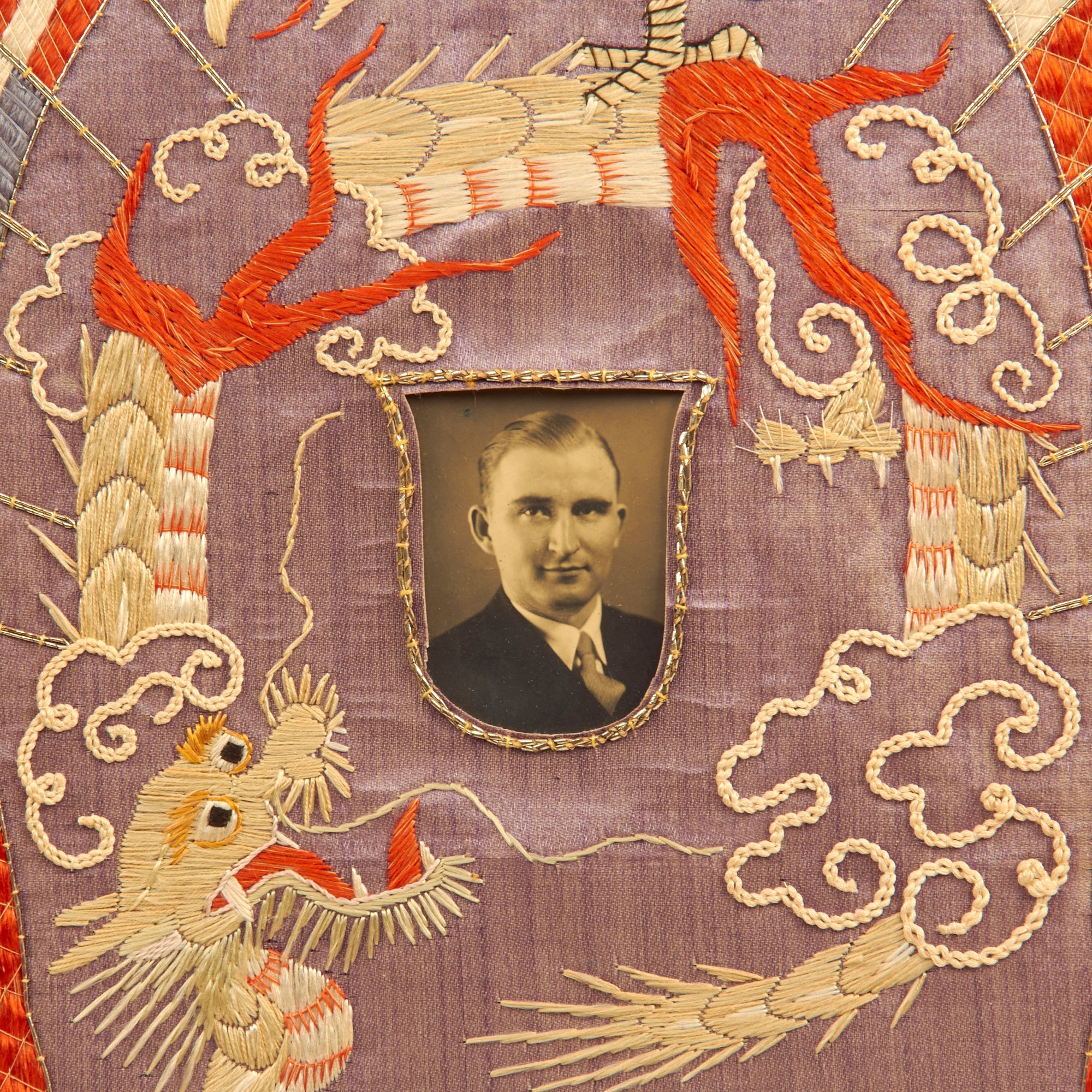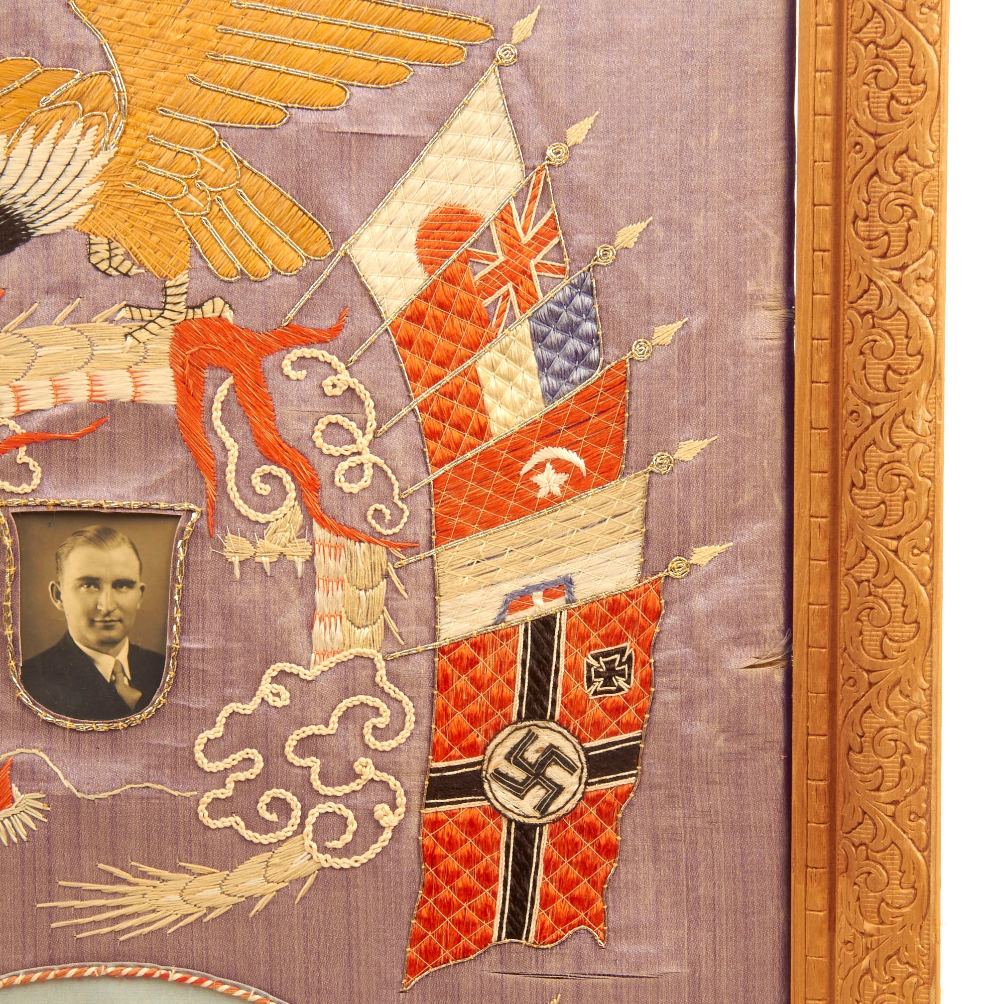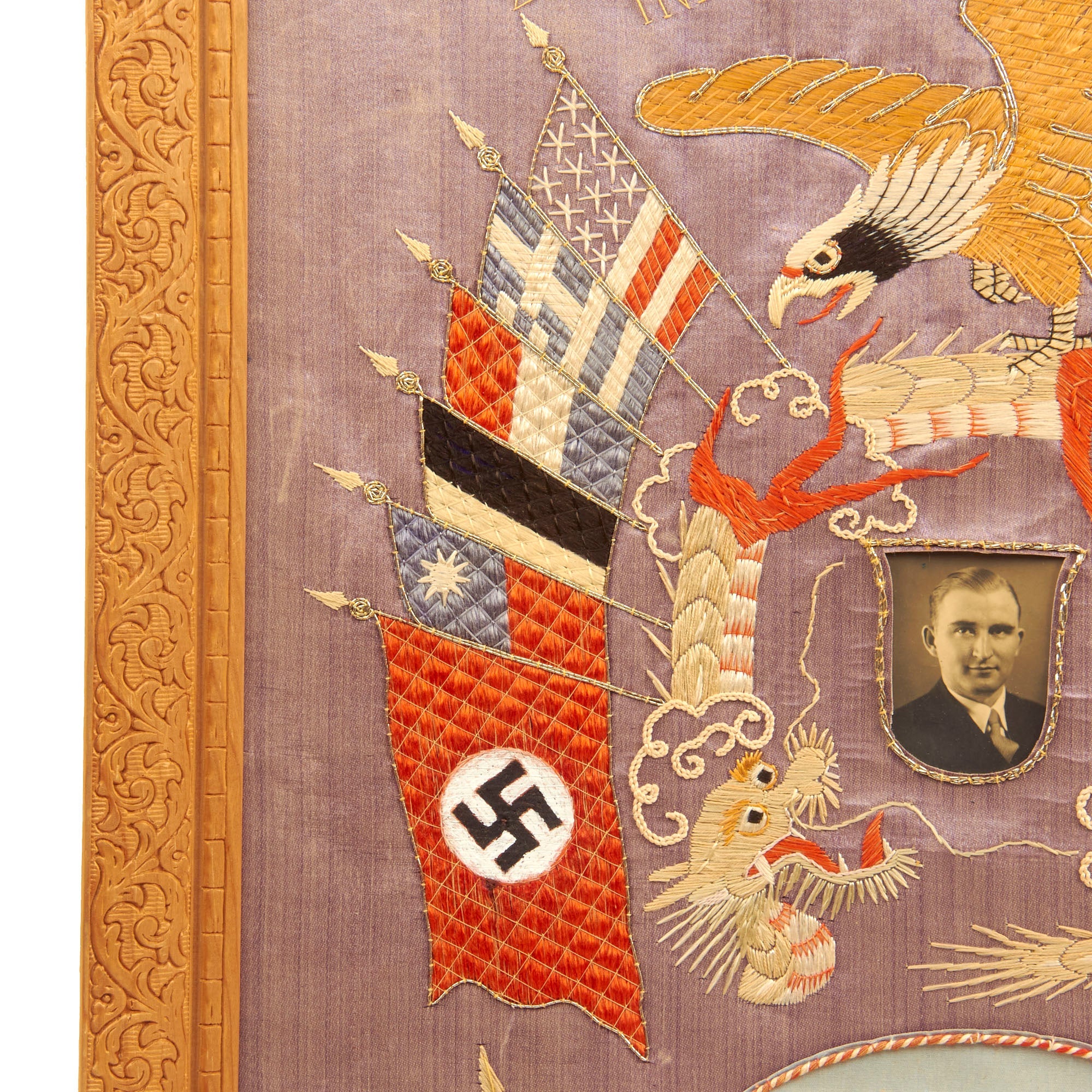 During one of these voyages, a German man named Rudolf Weiland was on board, and had this lovely "Tour Flag" made to commemorate all of the different countries he had been to, presumably while on board the ship. The 15 ½" x 19 ½" flag is embroidered with a few painted areas, and has a portrait mounted in the center. There is a really well executed eagle near the top, and embroidered text that reads: