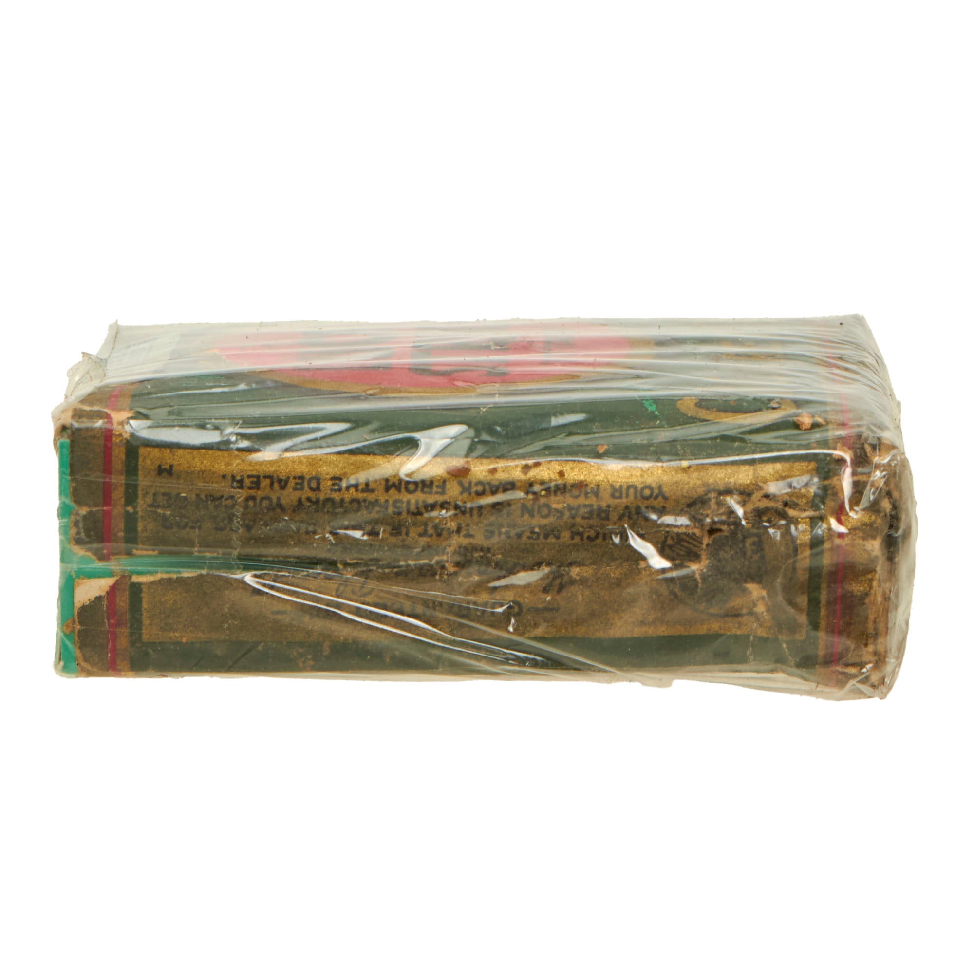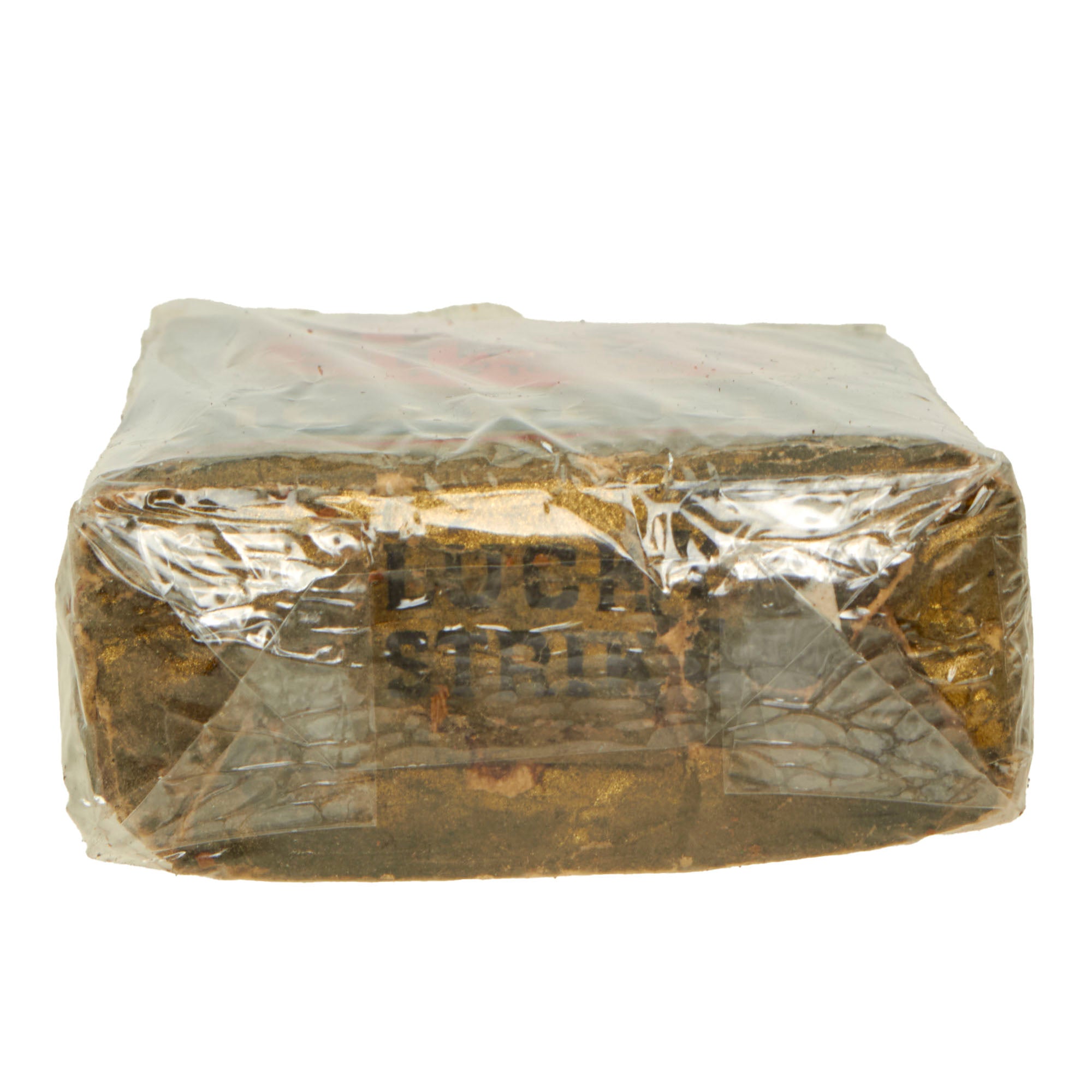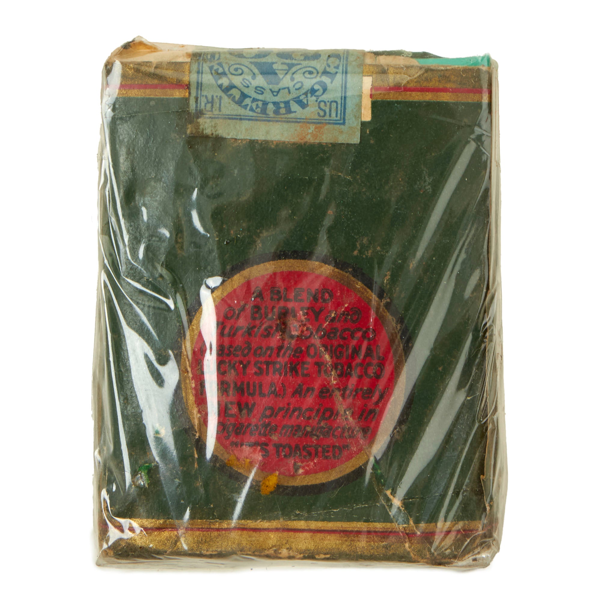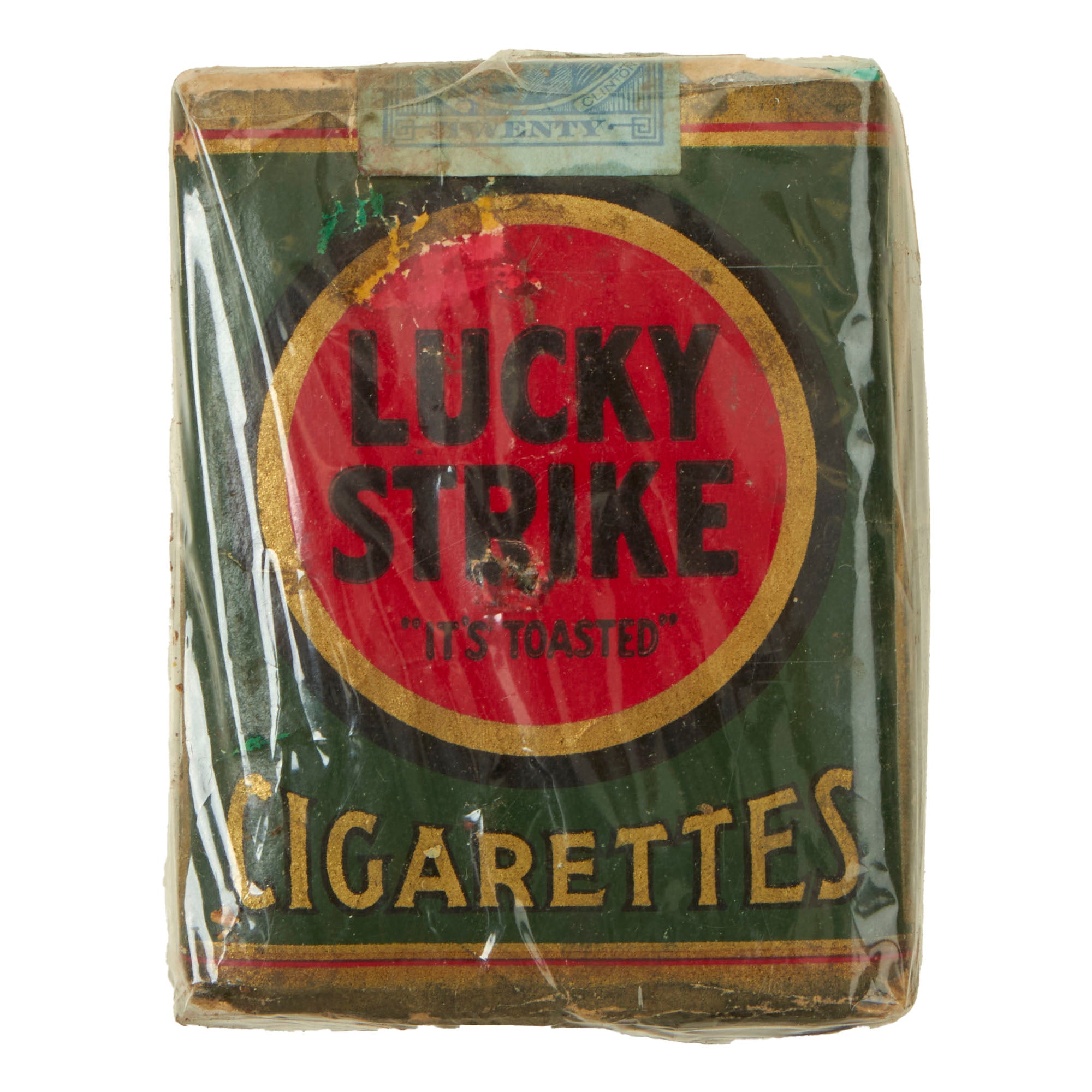 Original Item. Very Few Available We are offering a great selection of empty Lucky Strike Cigarette packs which have been “filled” and re-wrapped in plastic for display purposes. There are no cigarettes in these. The brand was first introduced by R. A. Patterson of Richmond, Virginia, in 1871 as a cut plug and later a cigarette. In 1905, the company was acquired by the American Tobacco Company. Though the package is still sealed, the bottom of the plastic cover has come undone. The green packaging indicates Pre-1942 production.