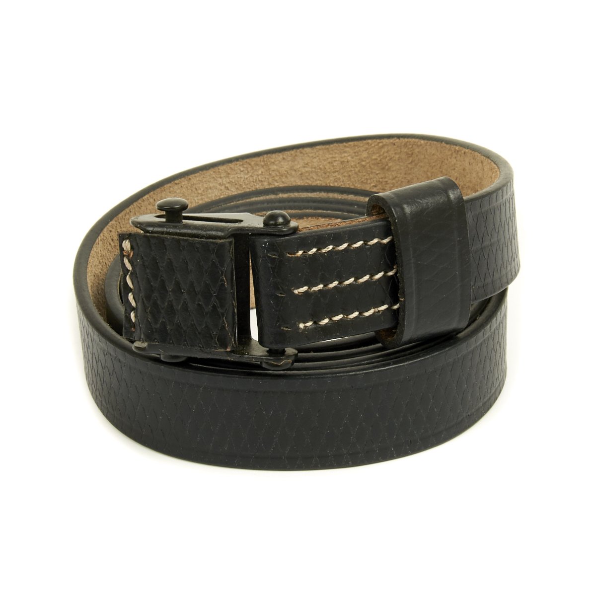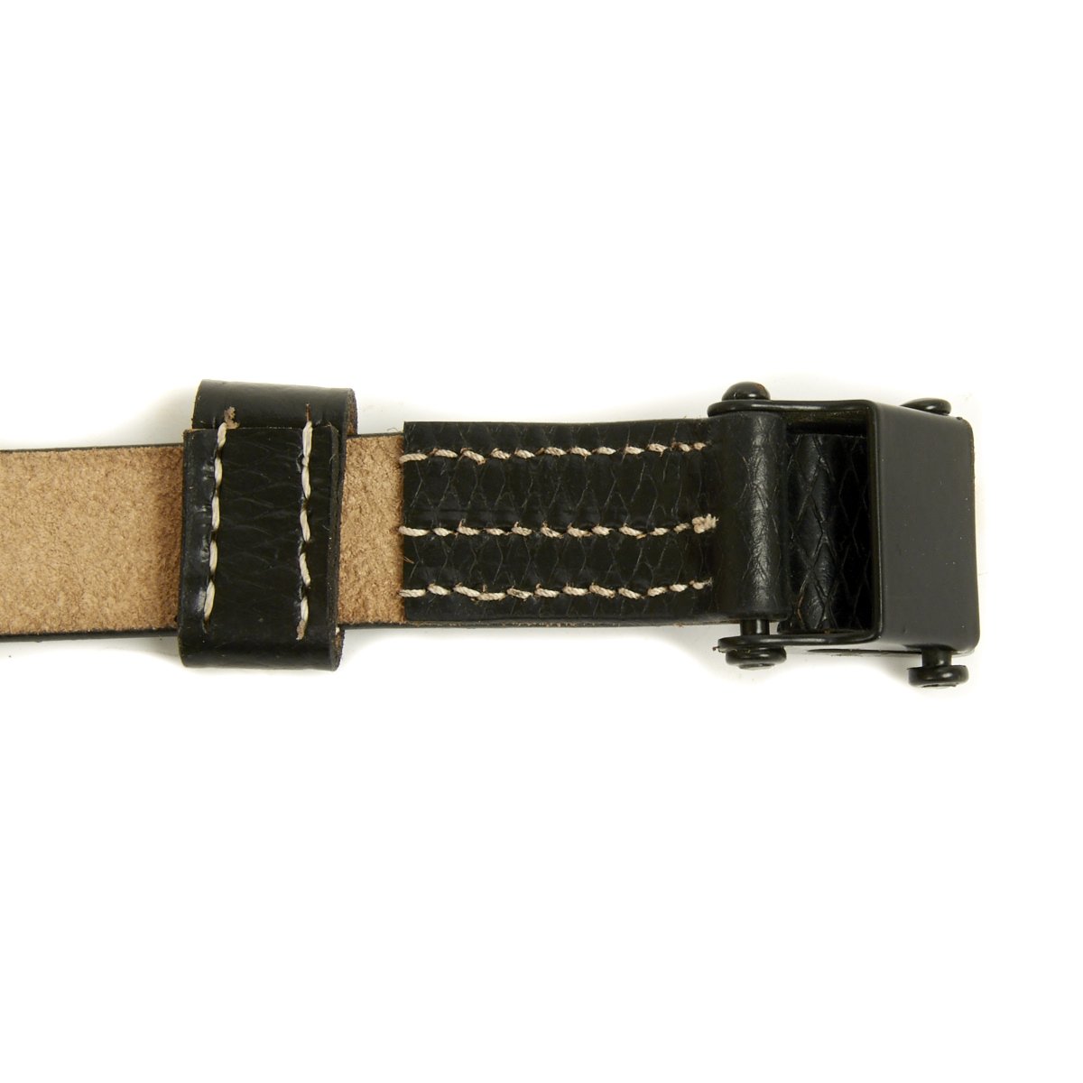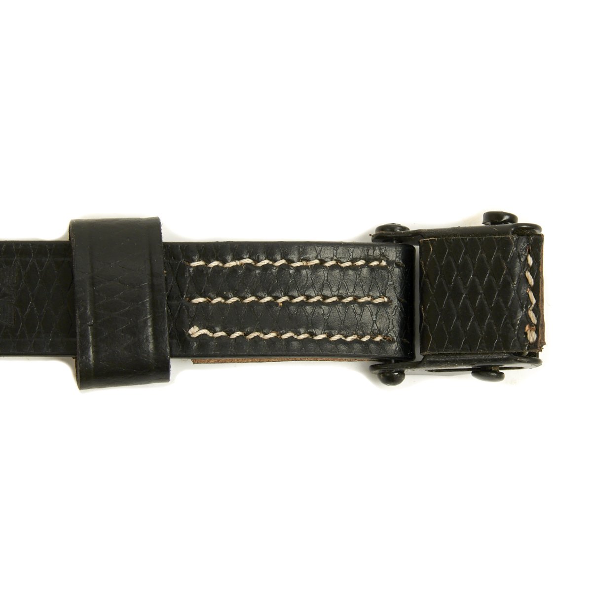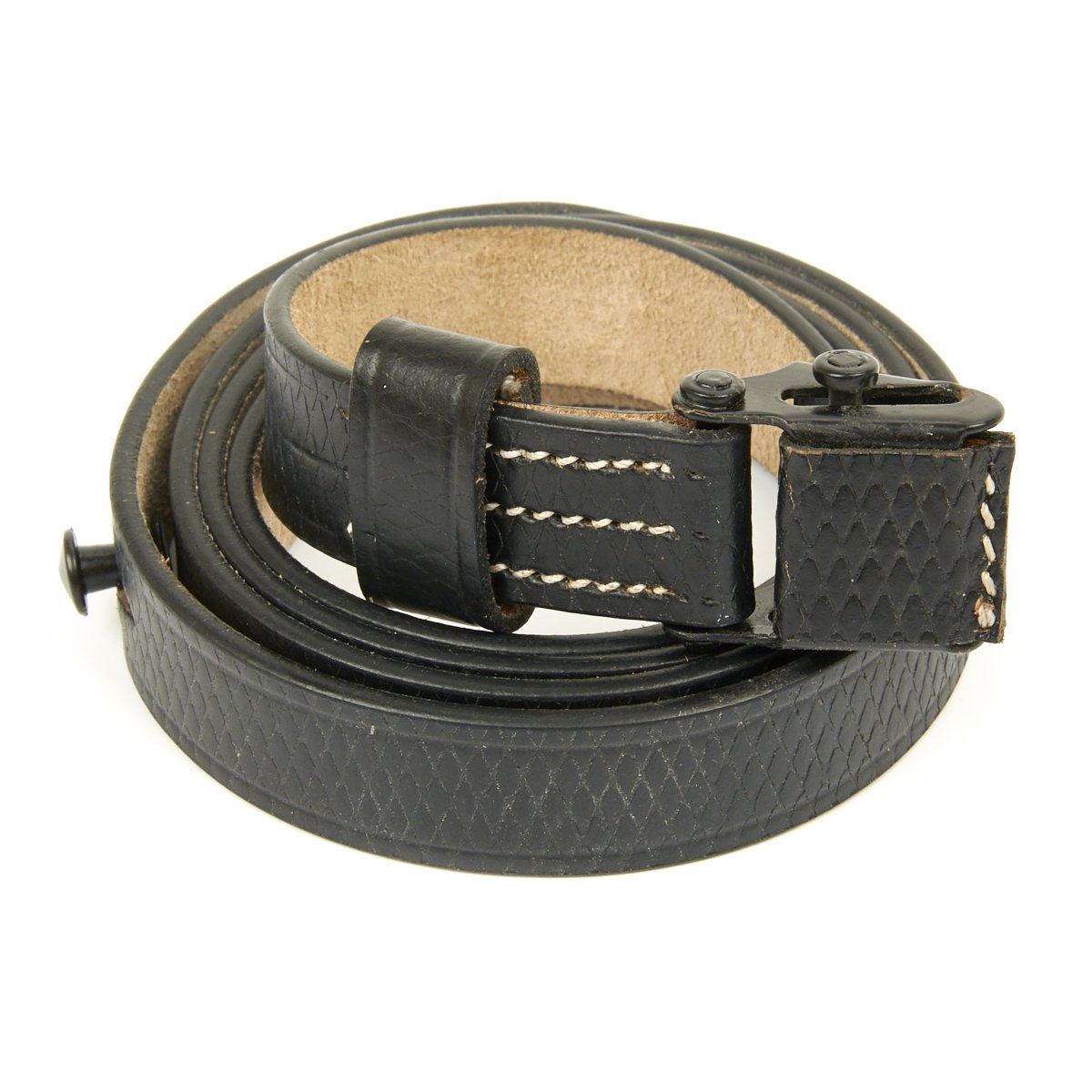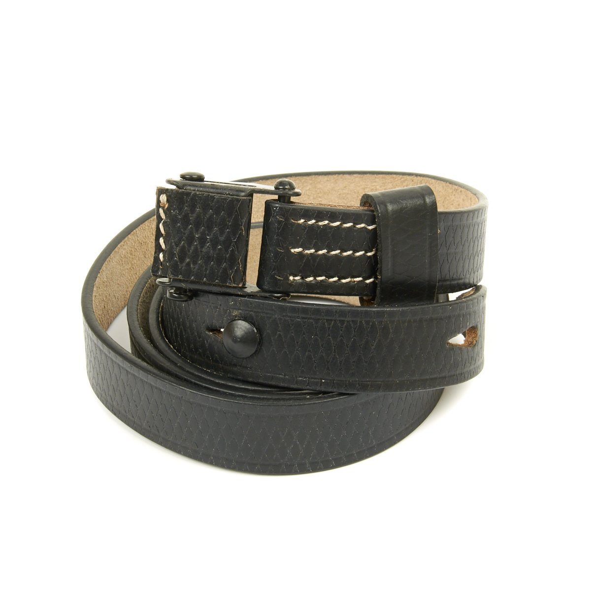 • New Made Item: Always hard to find, we now have manufactured correct two hole MP40 sling complete with cross-hatching in SS German black leather. Comes with proper steel slide buckle, collar stud steel button and single leather keeper. Stamped with replicated maker and date markings.