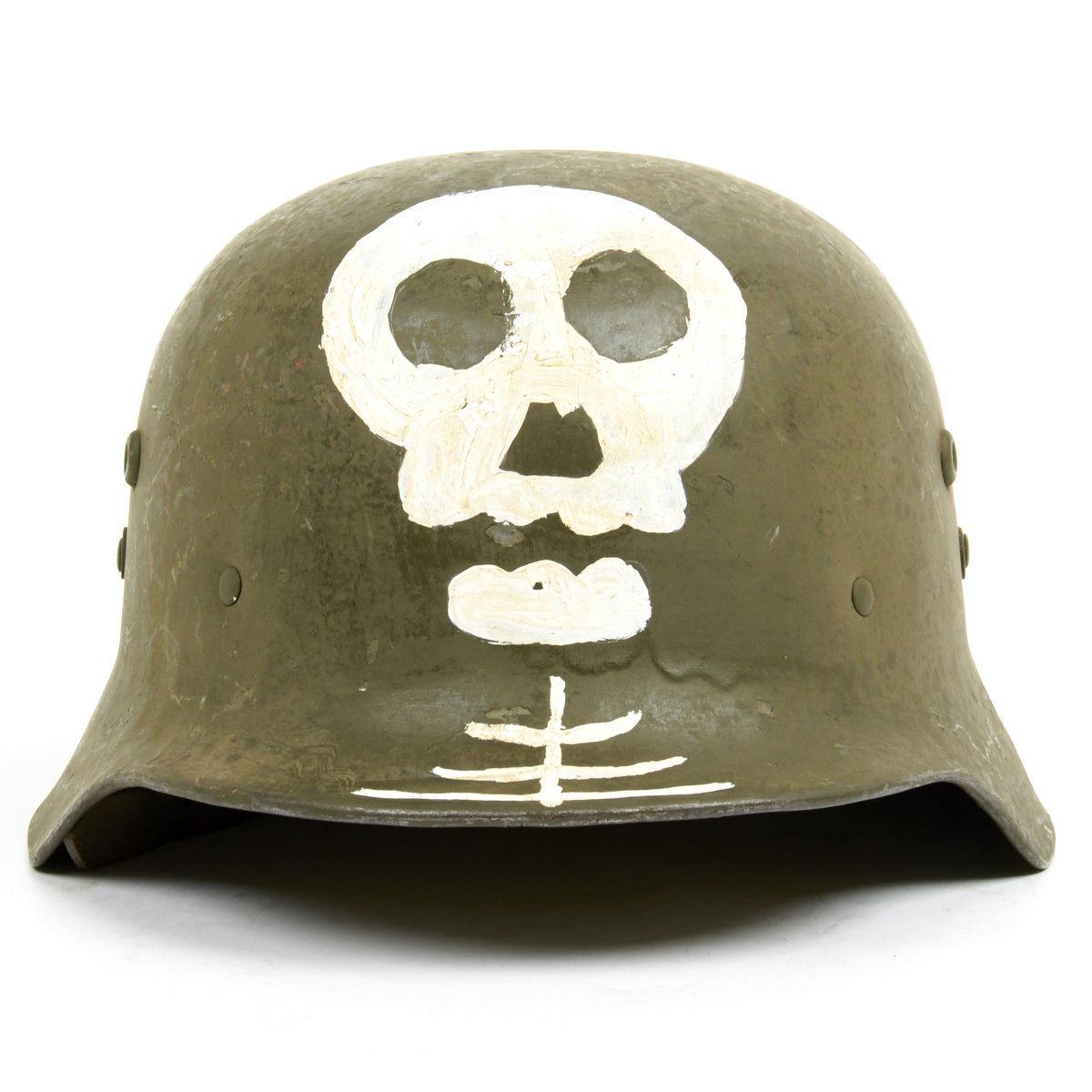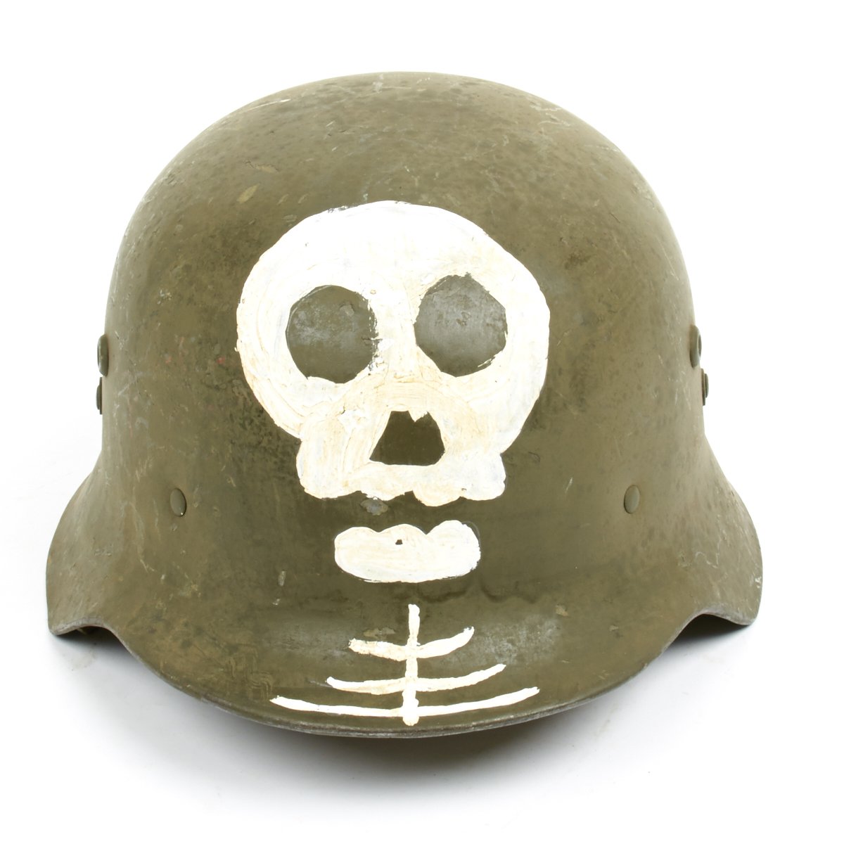 While the helmets are totally genuine the painted skull and bones have been newly replicated. Be sure to see the period photograph of Finnish JR46 soldiers with the skull painted on their helmets.