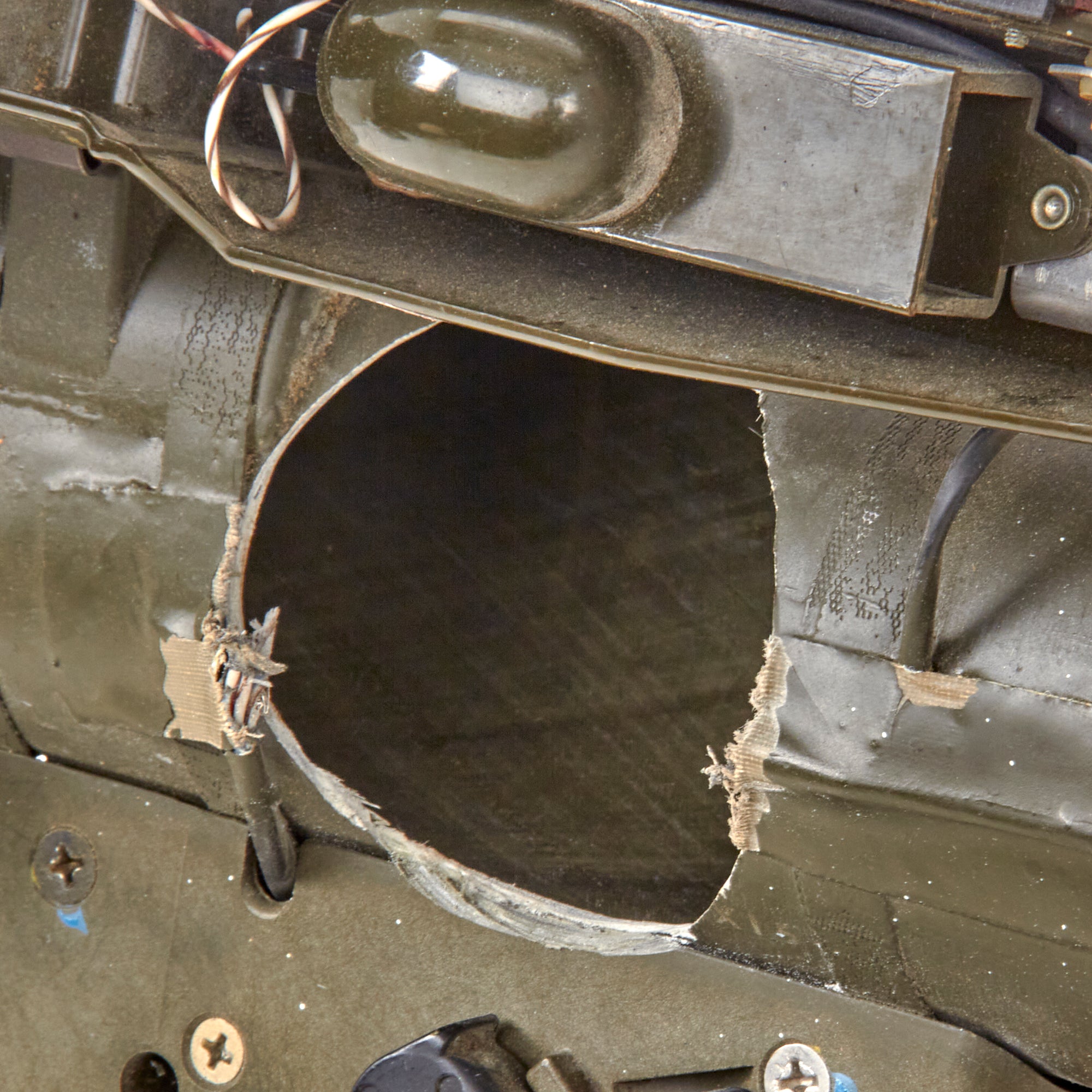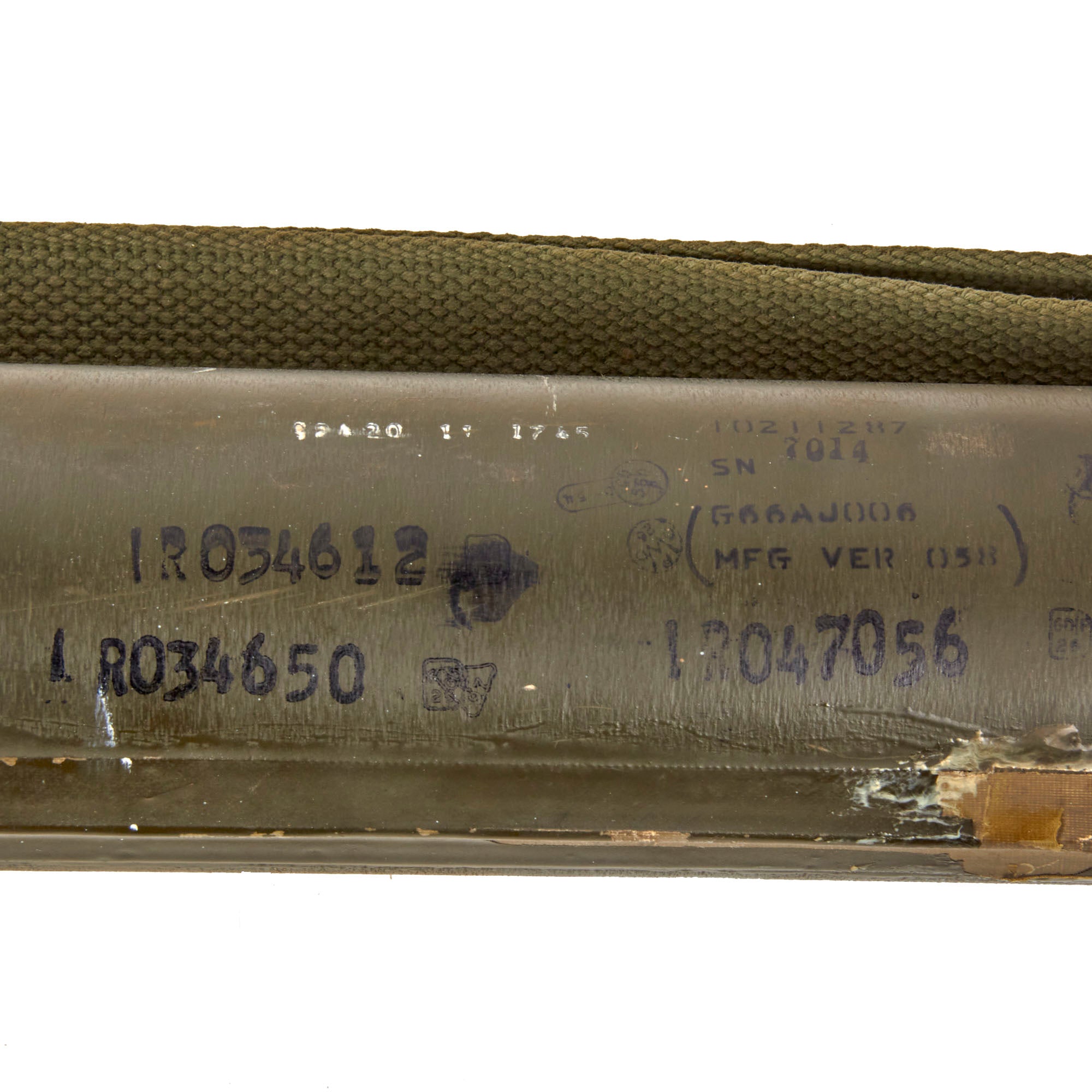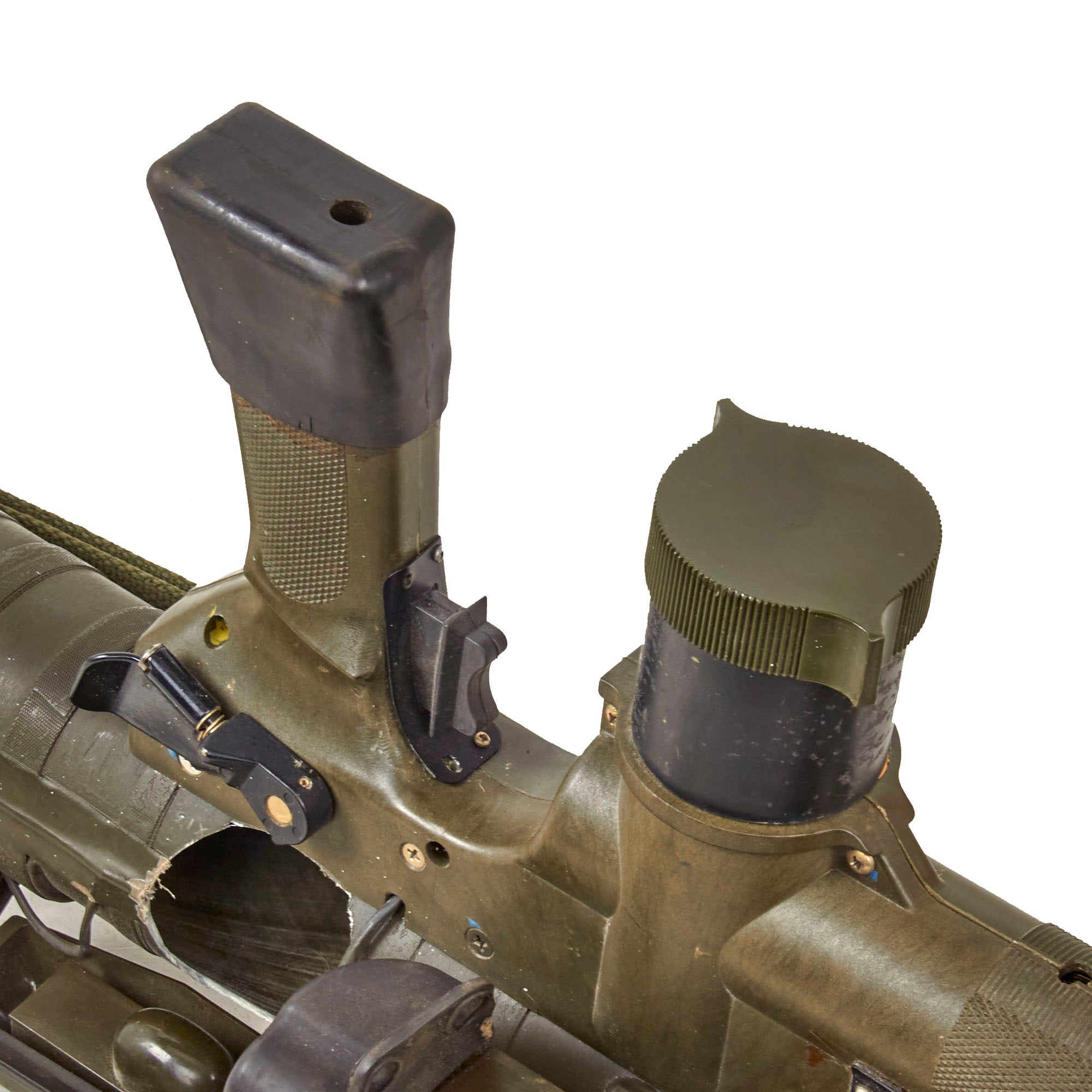This example is offered in great condition and still retains markings on the launcher tube itself, but there are not markings on the flip up cover. It retains the original sling on the left hand side, and the rear pad can still be removed from the unit. The front cover is also intact. There is a small rubber pad next to the hole in the tube, which is now very loose as the screws have nearly broken away from the plastic. It should sit well for display, but the piece can fall out.