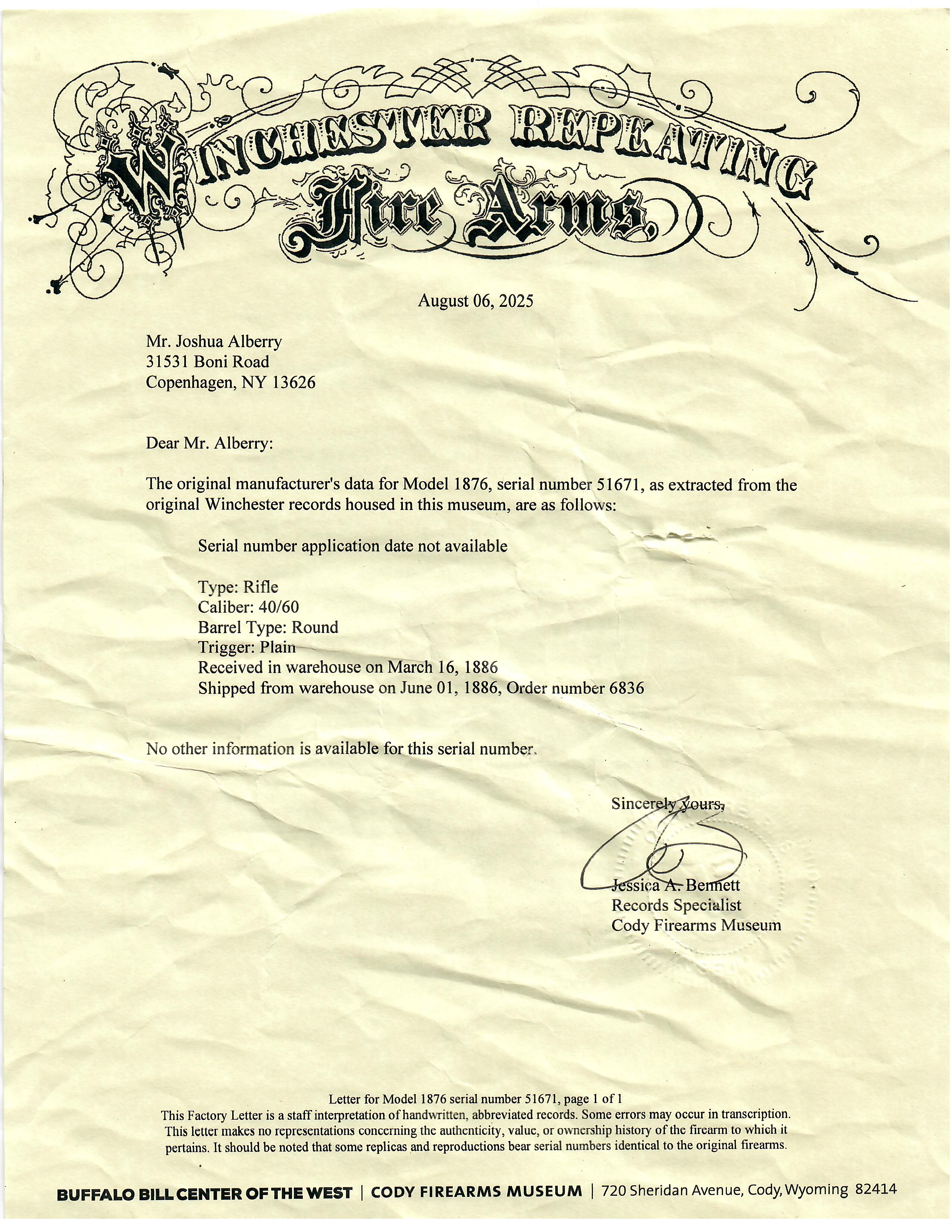 This rifle also comes with an original factory letter from the Buffalo Bill Center of the West at the Cody Firearms Museum, which now houses the original Winchester factory records. This is printed on WINCHESTER REPEATING Fire Arms letterhead, and dated August 06, 2025. It indicates that it is a Model 1876 Rifle in 40/60 caliber with a Round barrel. There is no indication of barrel length, which means it was made with the standard 28 inch "Sporting Rifle" barrel, so this rifle is still in the original configuration as shipped! The letter also indicates that the order for this rifle was received in the warehouse March 16, 1886, and shipped on June 01, 1886 as part of order 6836. There is no other information available for the serial number, but that is not uncommon for a rifle that did not see customization. The letter is signed by records specialist Jessica A. Bennett and still bears the correct raised seal.