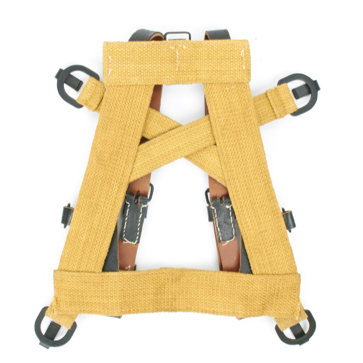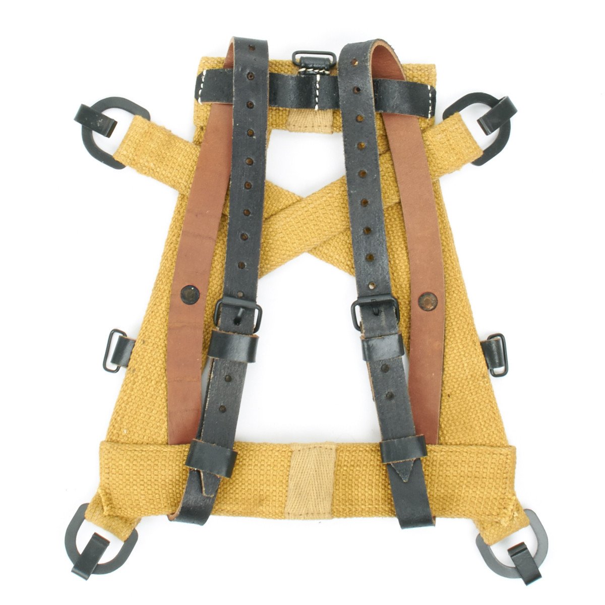 New Made Item: German WW2 M.31 Canvas and leather A Frame designed for carrying personal field equipment by each infantryman; this included Zeltbahn, mess kit and battle pack. A high quality new made WWII German Accessory complete with replicated German WWII markings, in DAK Afrika Korps Tan.