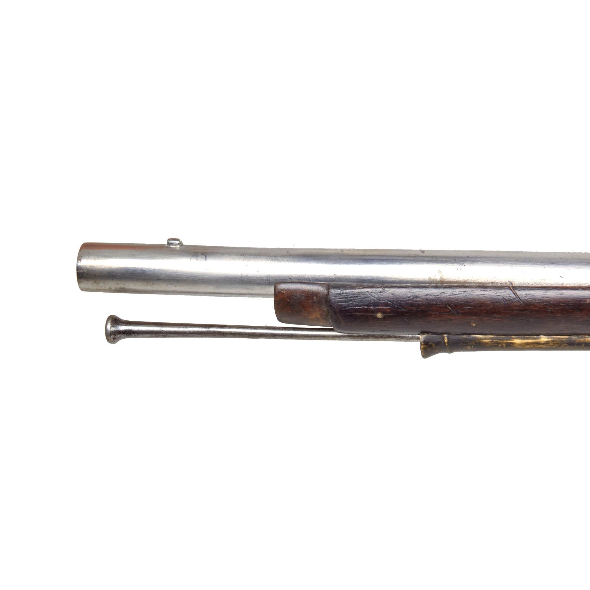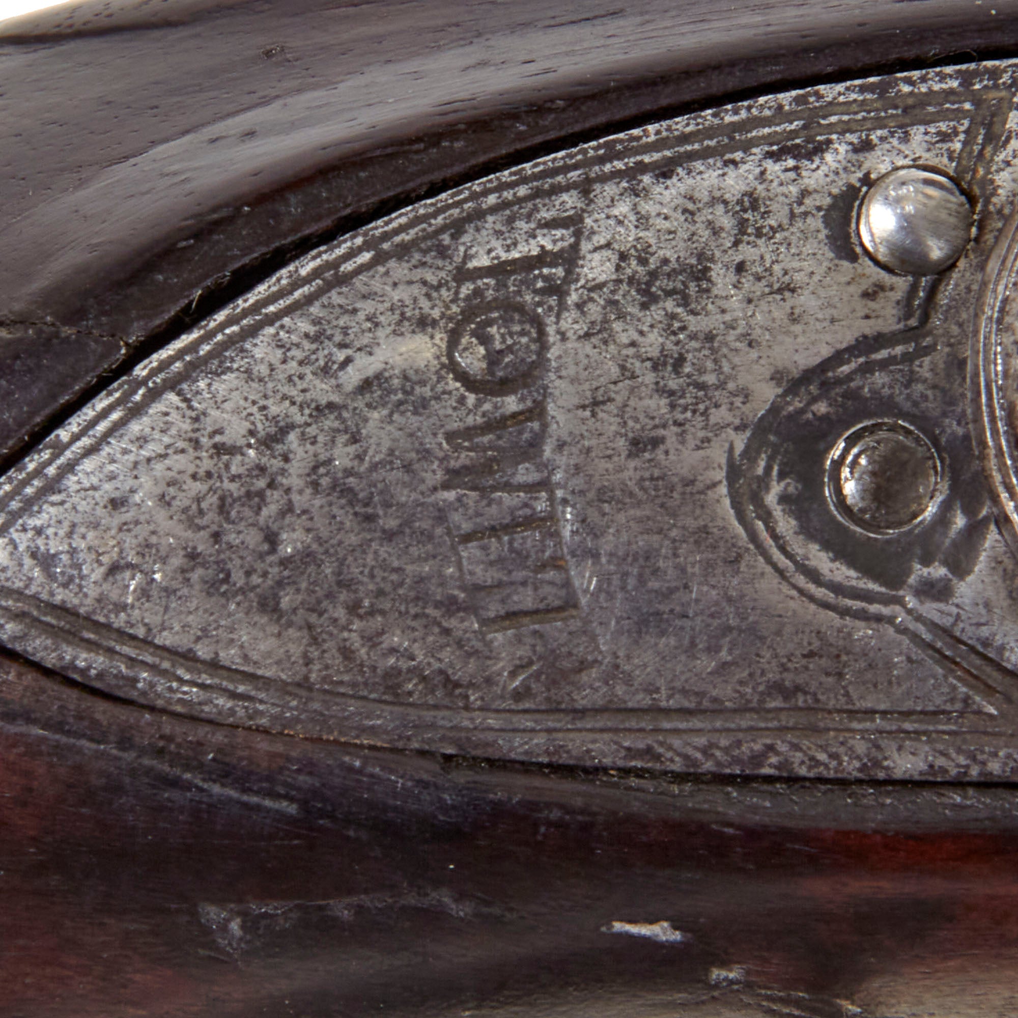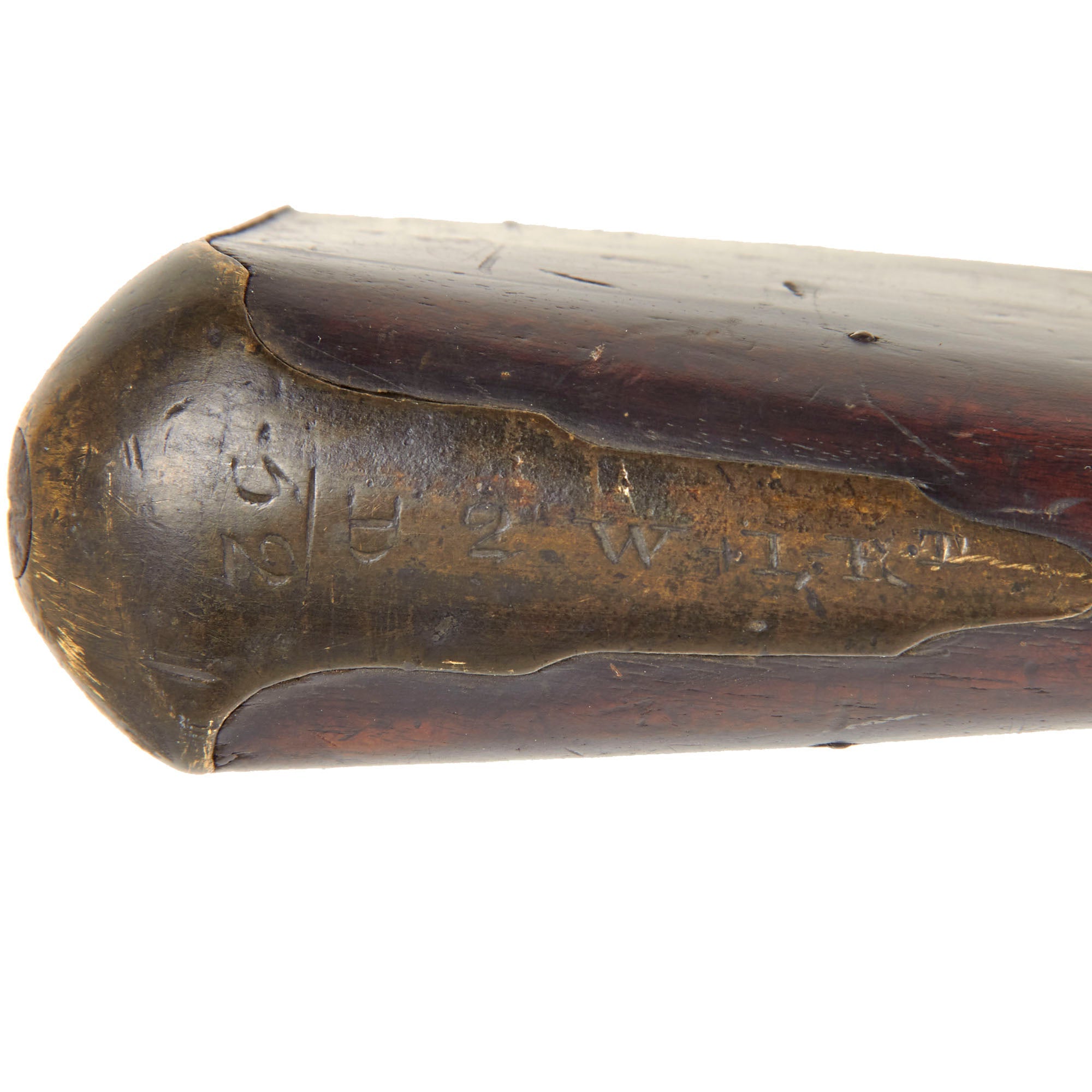 The tang of the butt plate is marked with 2 W - I - R'T, with D / 62 to the rear, indicating issue to the 24th (The 2nd Warwickshire) Regiment of Foot. The "D / 62" would indicate the company and weapon number. The lovely all original walnut stock is complete with sling swivels and the correct iron ramrod. It has the correct "swell" just rear of the first ramrod pipe. We can see however that it has had a somewhat rough life, as there are numerous repaired cracks throughout the fore stock area, and some on the comb of the butt stock. There is also one through the wrist by the escutcheon. All of these have been expertly repaired, probably long ago, as this looks like it was probably in some British collection for a long time, where it was cleaned repeatedly to keep it looking great.