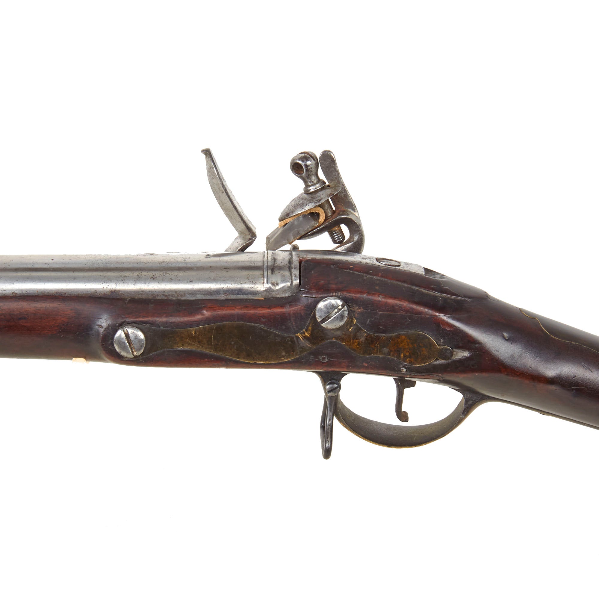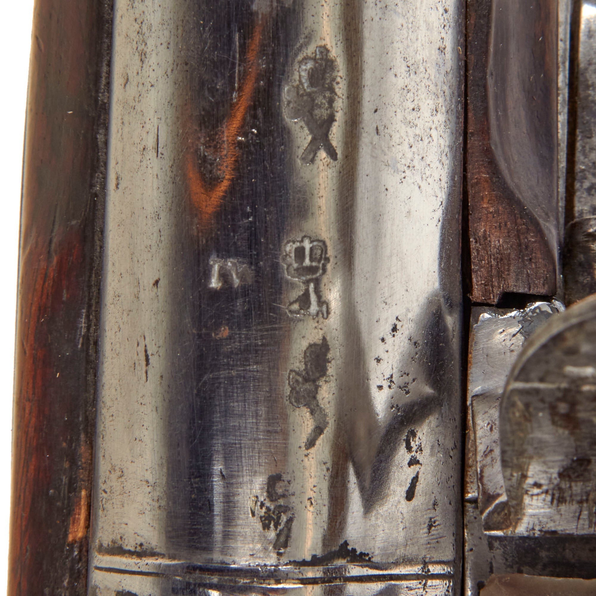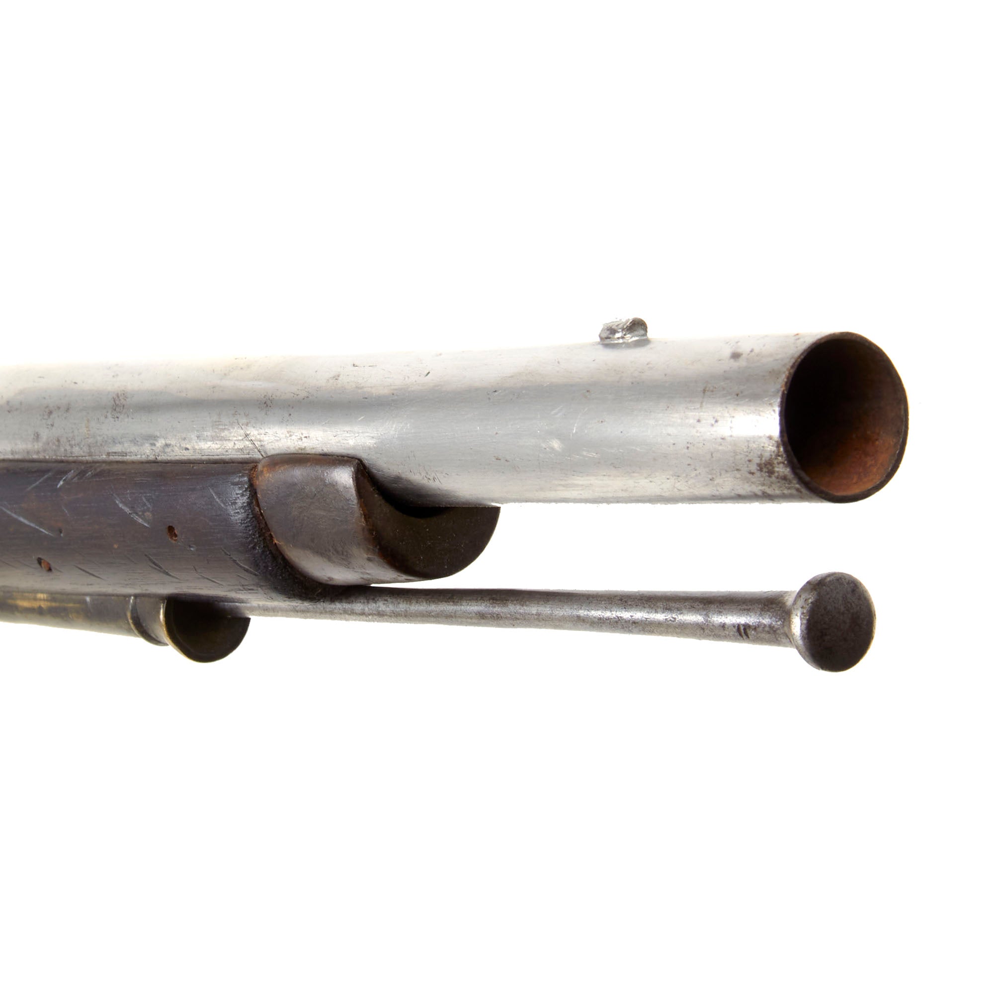 The musket has a full 42" regulation length, .75" smoothbore iron barrel bearing the correct British Proof Marks, which are still mostly clear. They include a CROWN / CROSSED SCEPTERS and a partial British CROWN / GR / Broad Arrow, indicating Pre-1813 military inspection at the Ordnance Proof house on Tower Wharf close to the Tower of London. We also see additional markings such as an IW and maybe another set of Tower proofs. The barrel was definitely given the "continental clean" at some point, and now is polished bright, which unfortunately has made the markings faint. The stock is fitted with the correct FOUR ramrod pipes and correct all brass mounts.