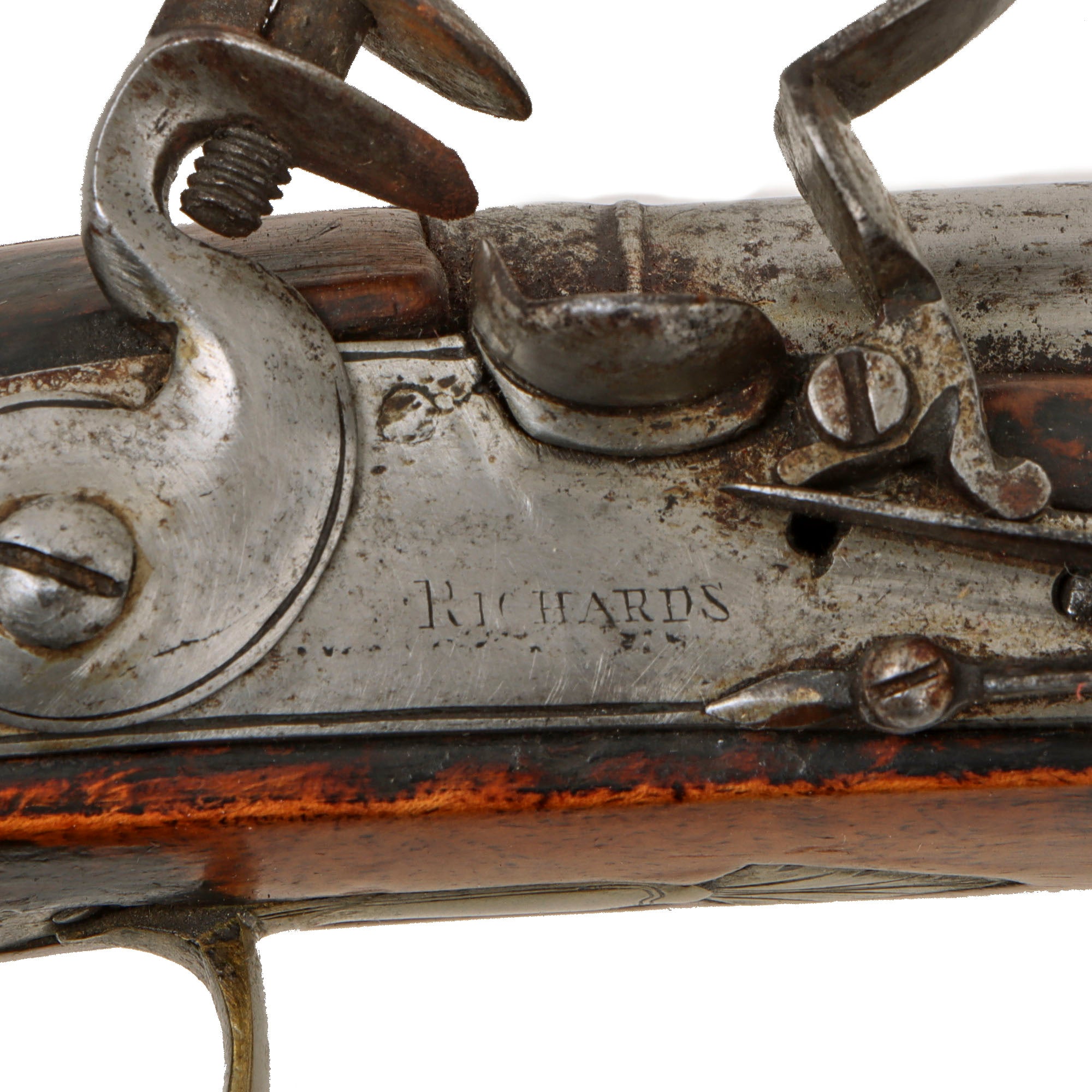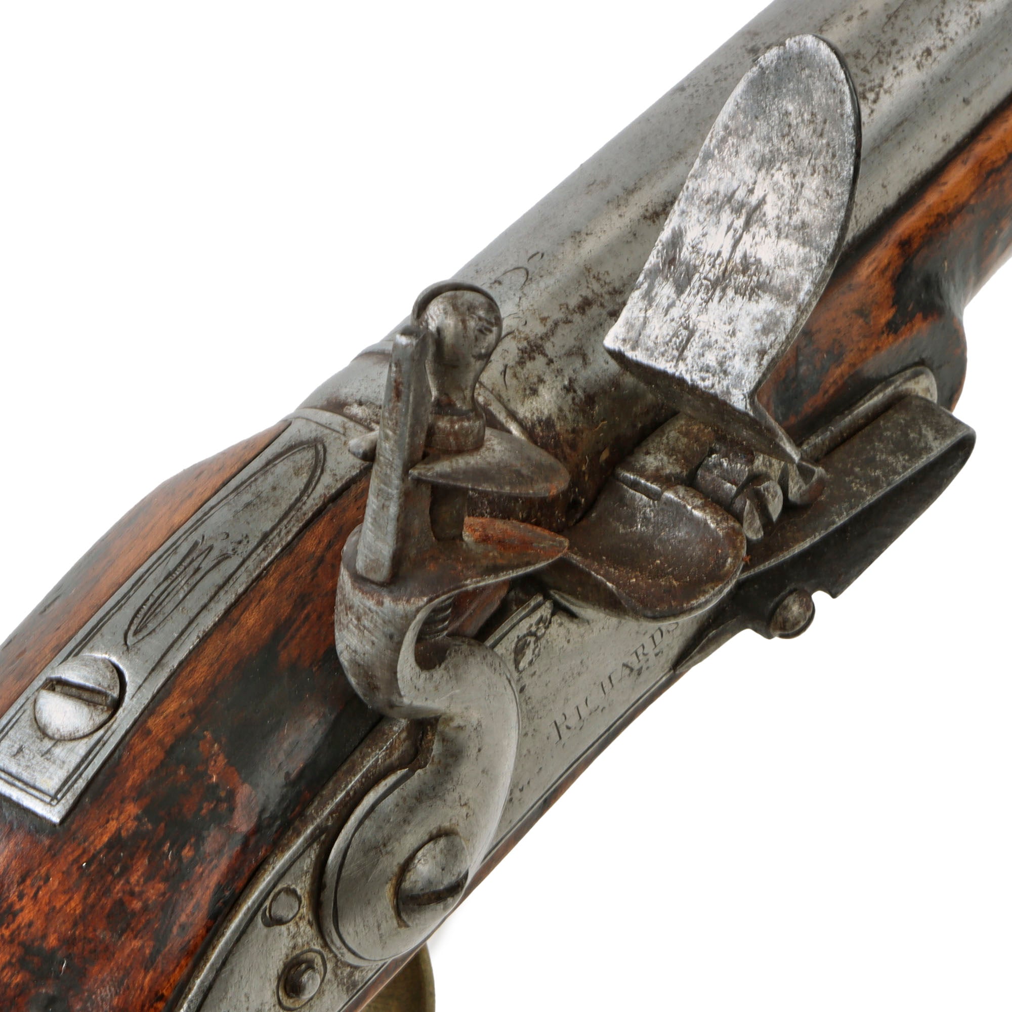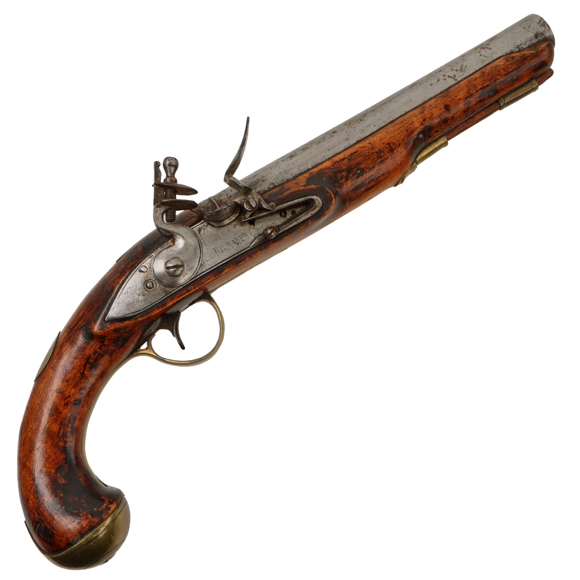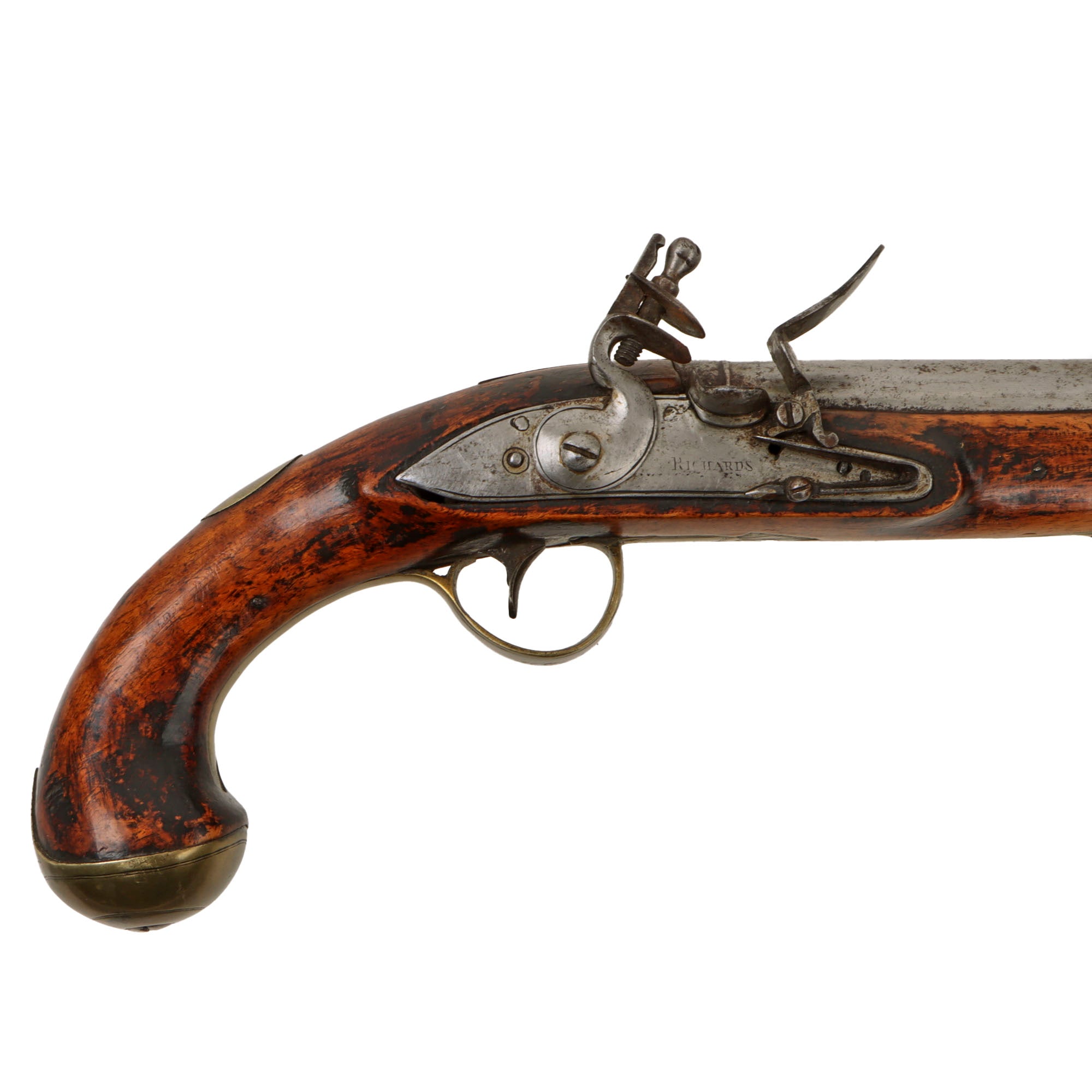 Original Item: Only One Available. This is a lovely British Flintlock "Holster" Pistol, marked on the lock with RICHARDS, though unfortunately the marking is worn, so we cannot see any initials before the name. There were various makers with the last name "Richards" working in London during the early 19th century, including John Richards, William Richards, Theophilus Richards, and others. Many of these were related and worked in various partnerships over the years, so needless to say, this was a well-known and respected name in the London gun trade.