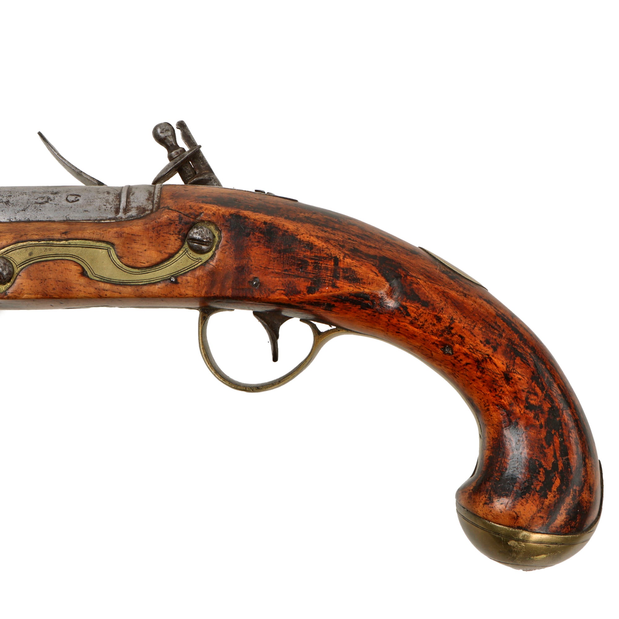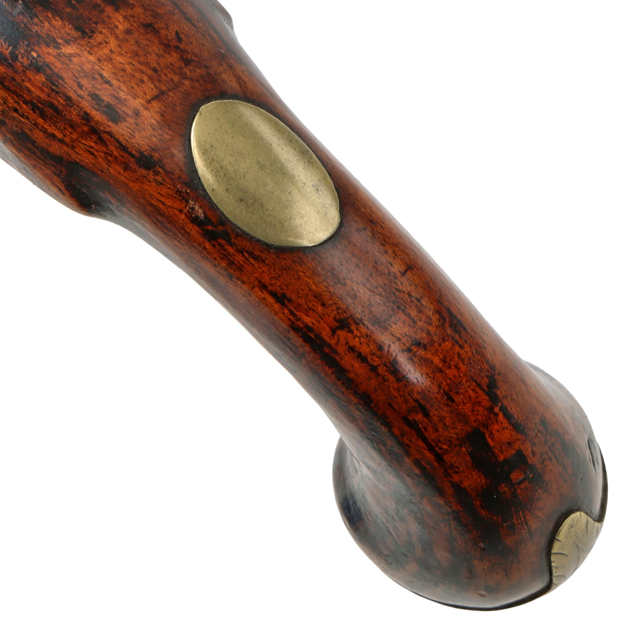 The pistol is full-stocked, with lovely engraved brass fittings and an round brass escutcheon on the back of the grip. The butt plate has some lovely engravings as well, matching the design on the other fittings. The stock is lovely, looking to have some curl to the grain, which was at some point finished with very dark lacquer, now mostly cleaned away. There is a wooden ramrod under the barrel, which looks to be a display replacement.