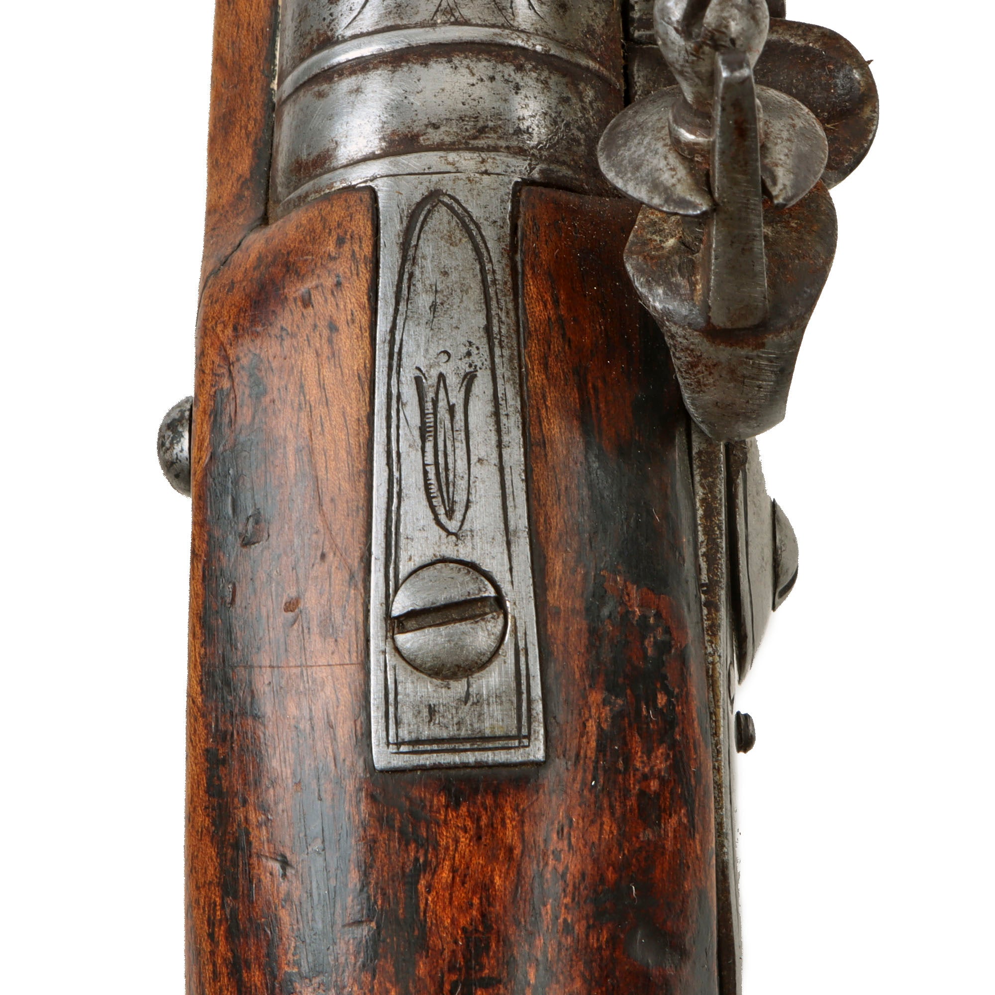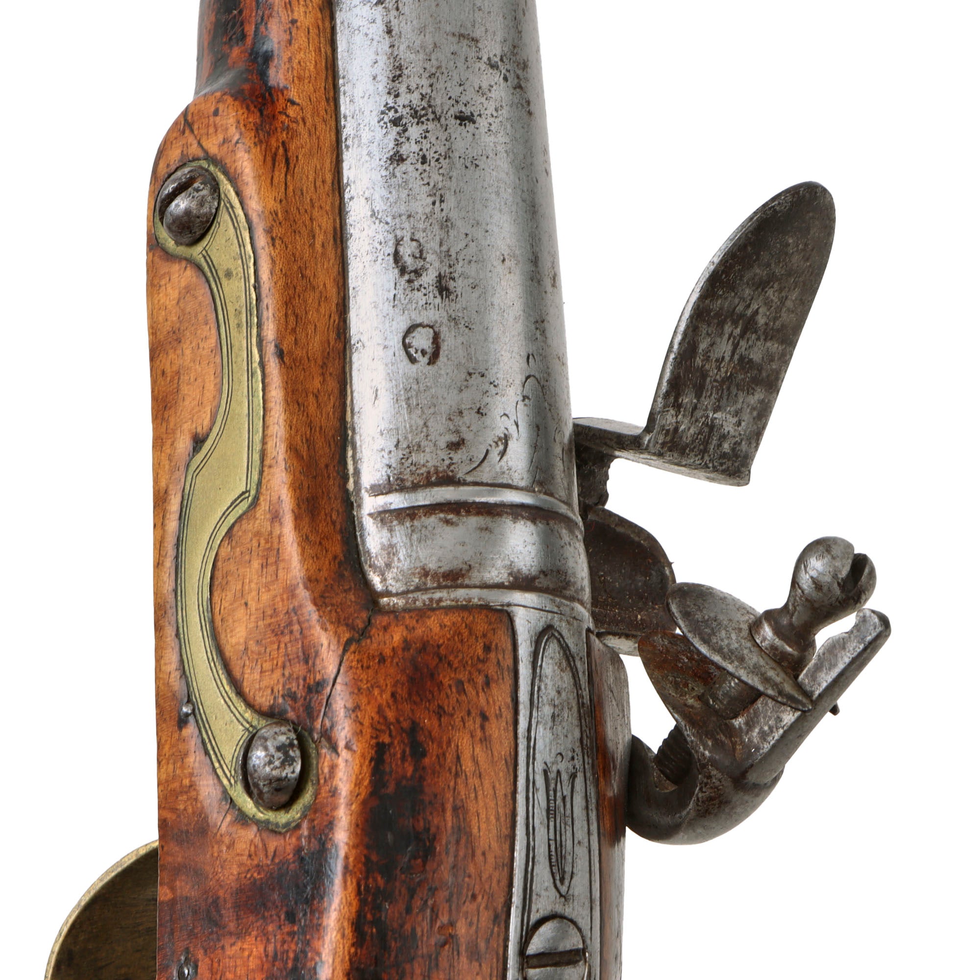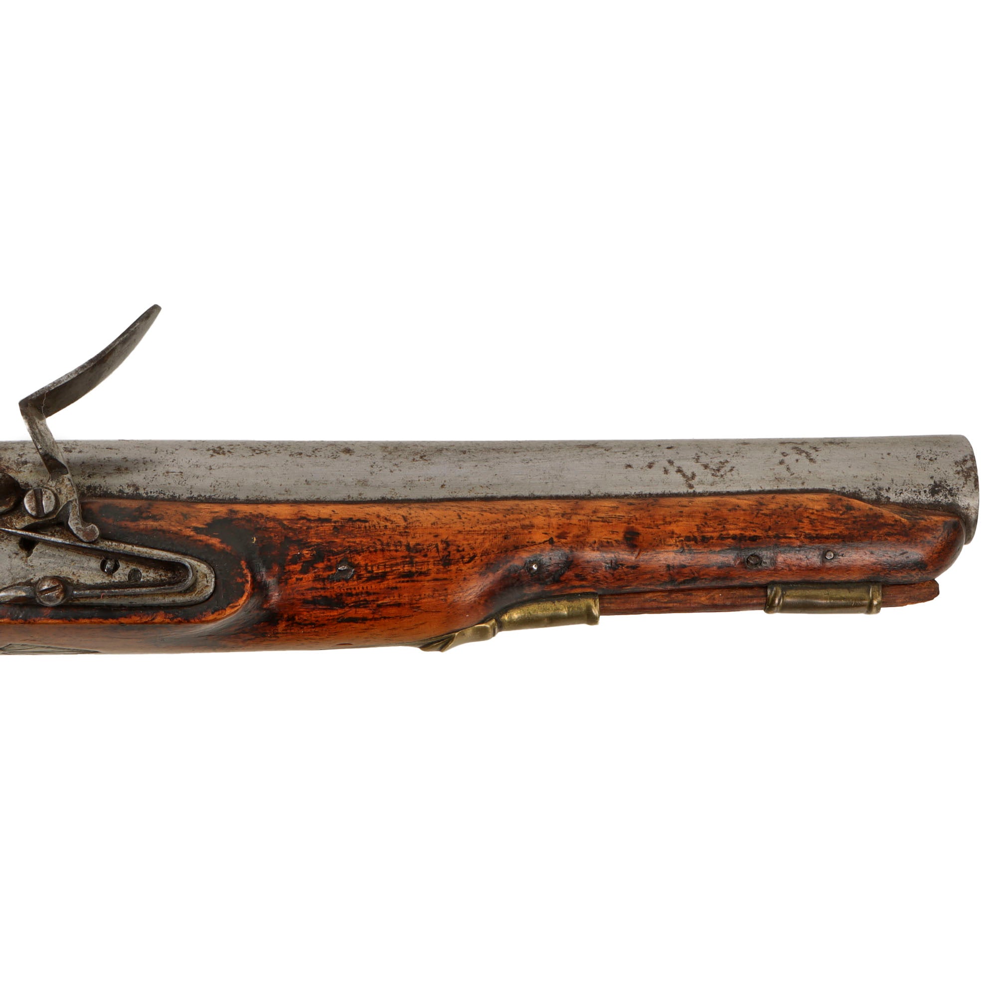 The top of the barrel is definitely worn, but we can still see the traces of the London proof marks: the CROWN / GP "Gunmakers" black powder proof and CROWN / V "viewed" marking from the London Gun Company proof house. The lock is an early design, without a frizzen reinforcement bridle and featuring a lovely "Swan Neck" cocking piece. We checked the lock action, and it is fully functional, holding at half cock and firing at full, however overall the action is a bit slow due to internal wear.