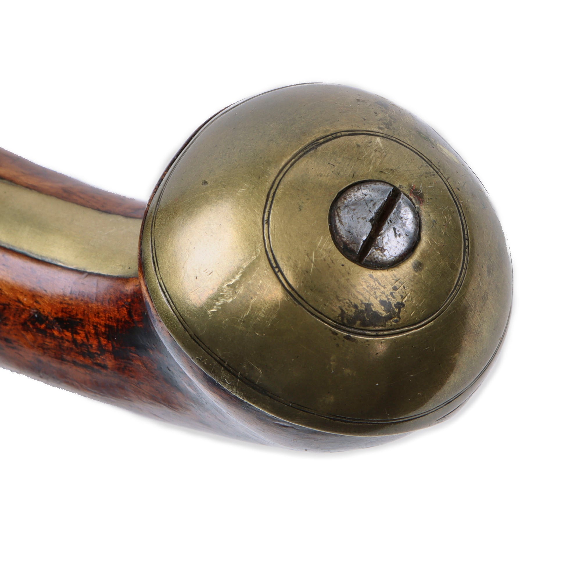 The pistol measures 13 5/8 inches in overall length, and is fitted with a lovely 8 inch long round barre with a bore of about 0.63", about typical for the time. There was originally engraving around the breech end of the barrel and elsewhere, however it is now quite worn, along with any other marks that were present on the barrel. With all brass fittings including an escutcheon on the back of the wrist, this pistol is very typical of those carried during the early 19th century in England.