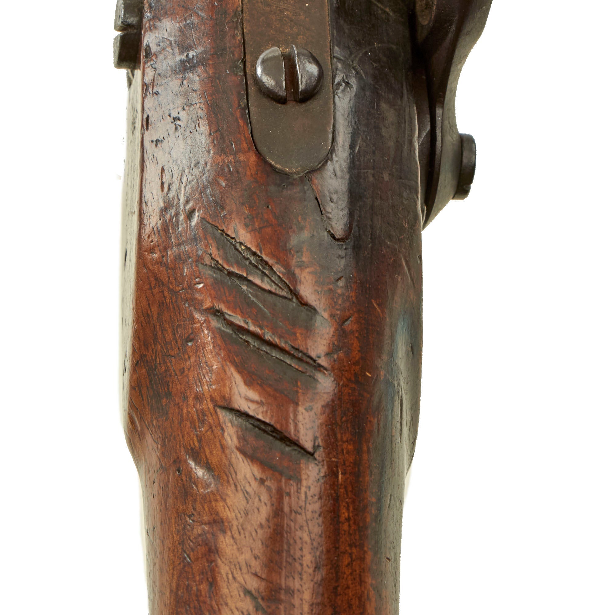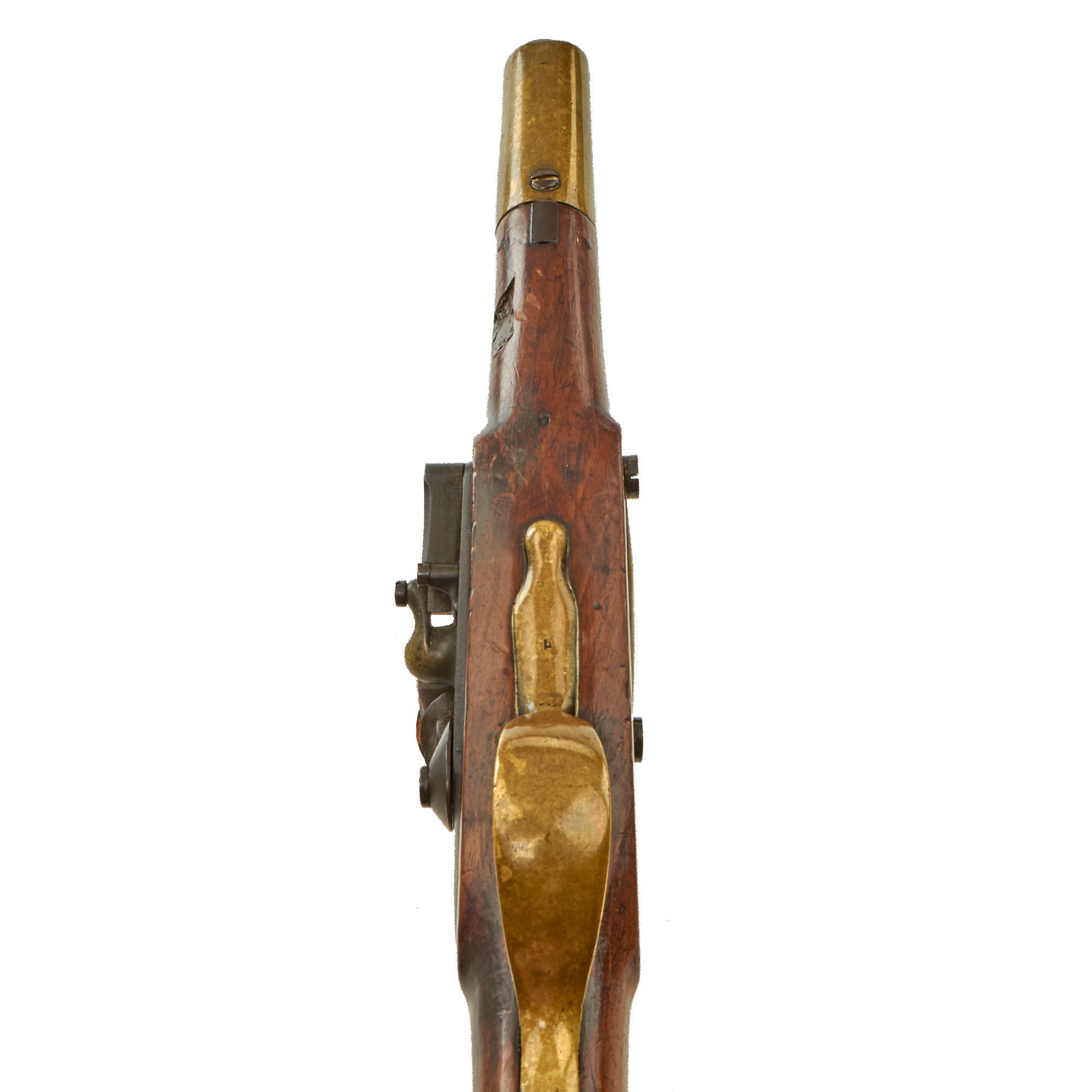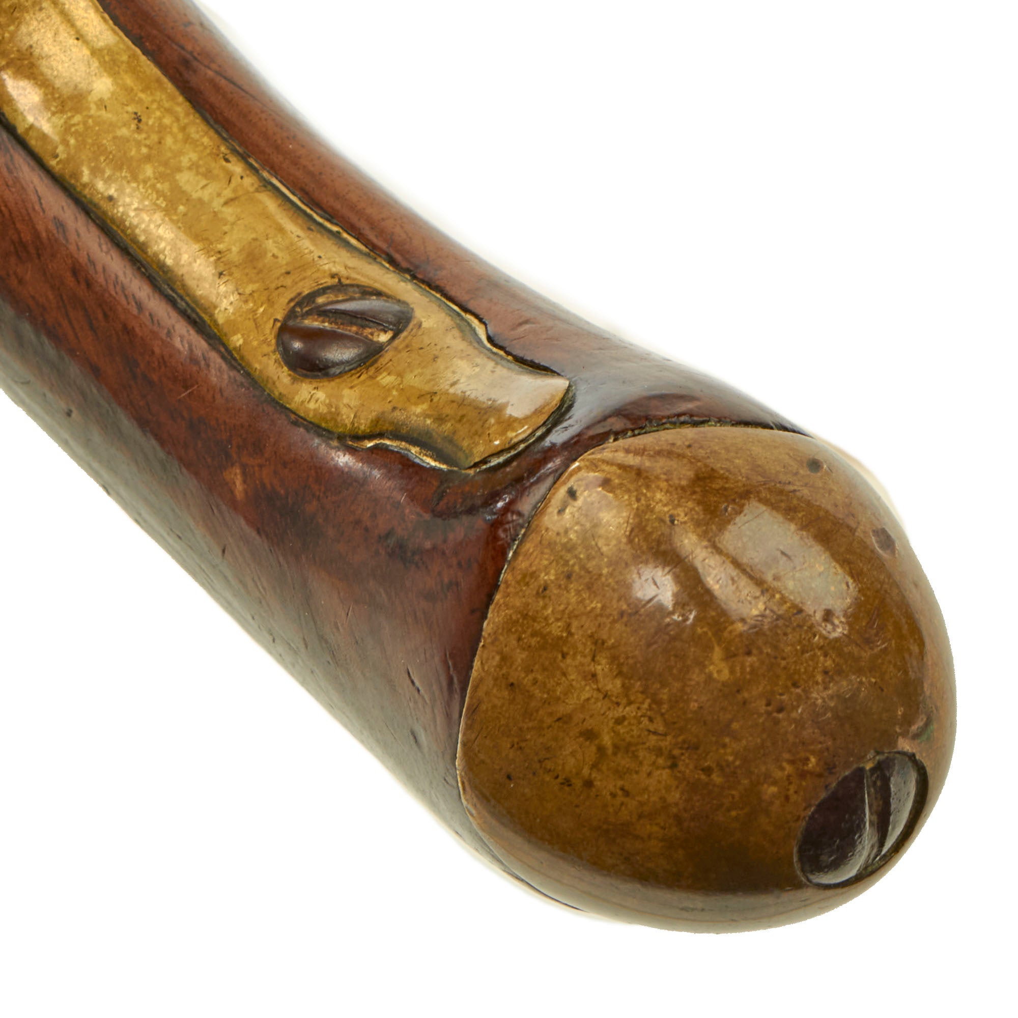 This pistol is brass-mounted throughout, with a beautifully aged patina that perfectly complements its historical appearance. The walnut stock shows period wear and small areas of loss consistent with genuine field use, but remains structurally sound and displays wonderfully. The flintlock mechanism functions but does not properly hold at half-cock due to age-related wear on the tumbler.