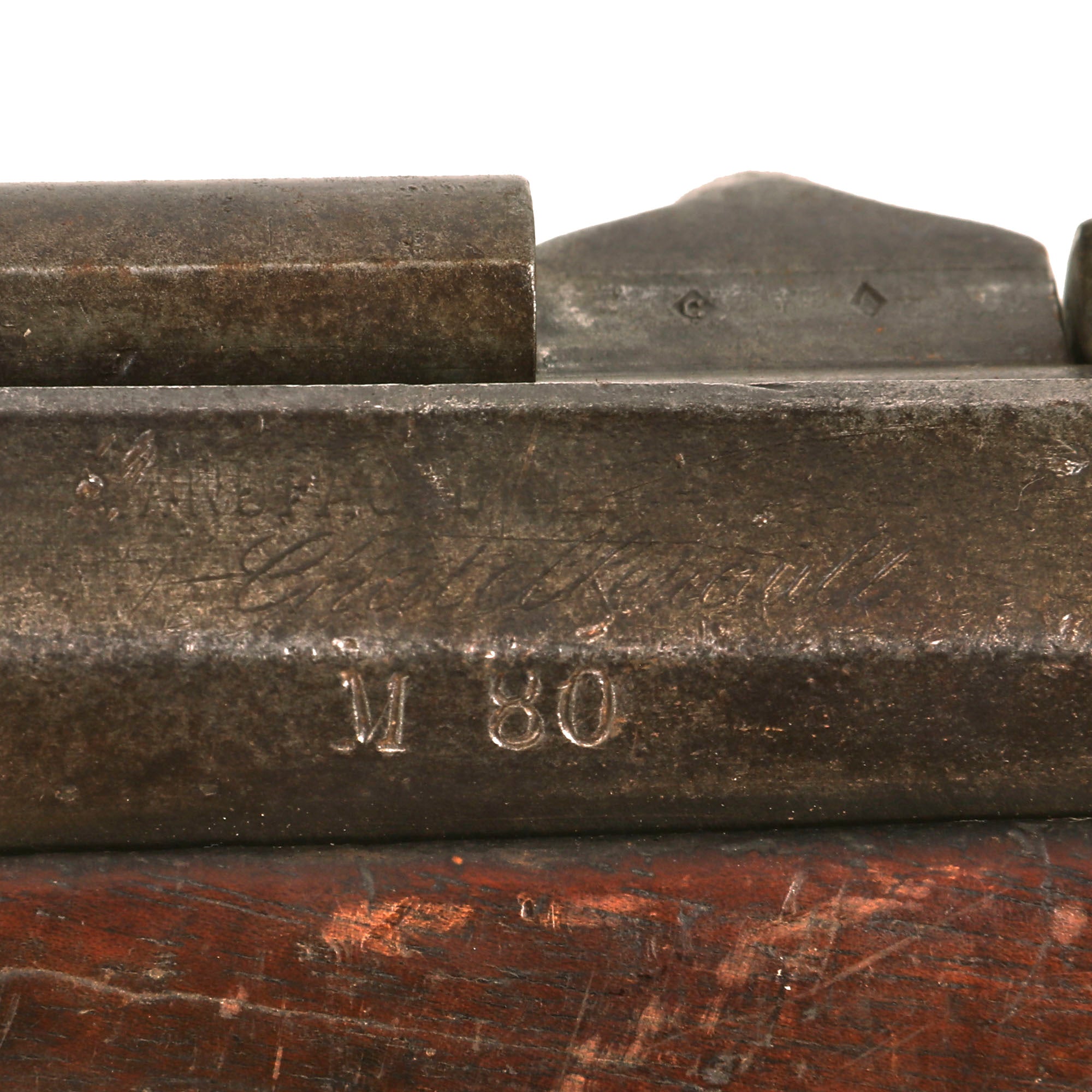 Original Item: Only One Available. This lovely little brass mounted CAMEL CARBINE was issued for "Colonial Service", as indicated by the brass mounts, and it definitely has had a long and interesting history! This carbine was actually originally produced as a Modèle 1866 'Chassepot' Needle Fire rifle, and was then later converted to a Mle 1866-74 'Gras' Rifle. The left side of the receiver is marked MANUFACTURE [D'ARMES] / Châtellerault / M.80 next to MLE 1866-74 indicating manufacture at the government arsenal at St. Étienne. The dated markings on the right side of the barrel have been partly removed, making the dates themselves illegible. All we can see is a relatively clear C for Châtellerault, and to the right an S, indicating it was converted to an Mle 1866-74 Gras Rifle, at St. Étienne. The "M.80" is for a later update to the action that added a channel for gas escape to the bolt and receiver, in the case of a ruptured primer.