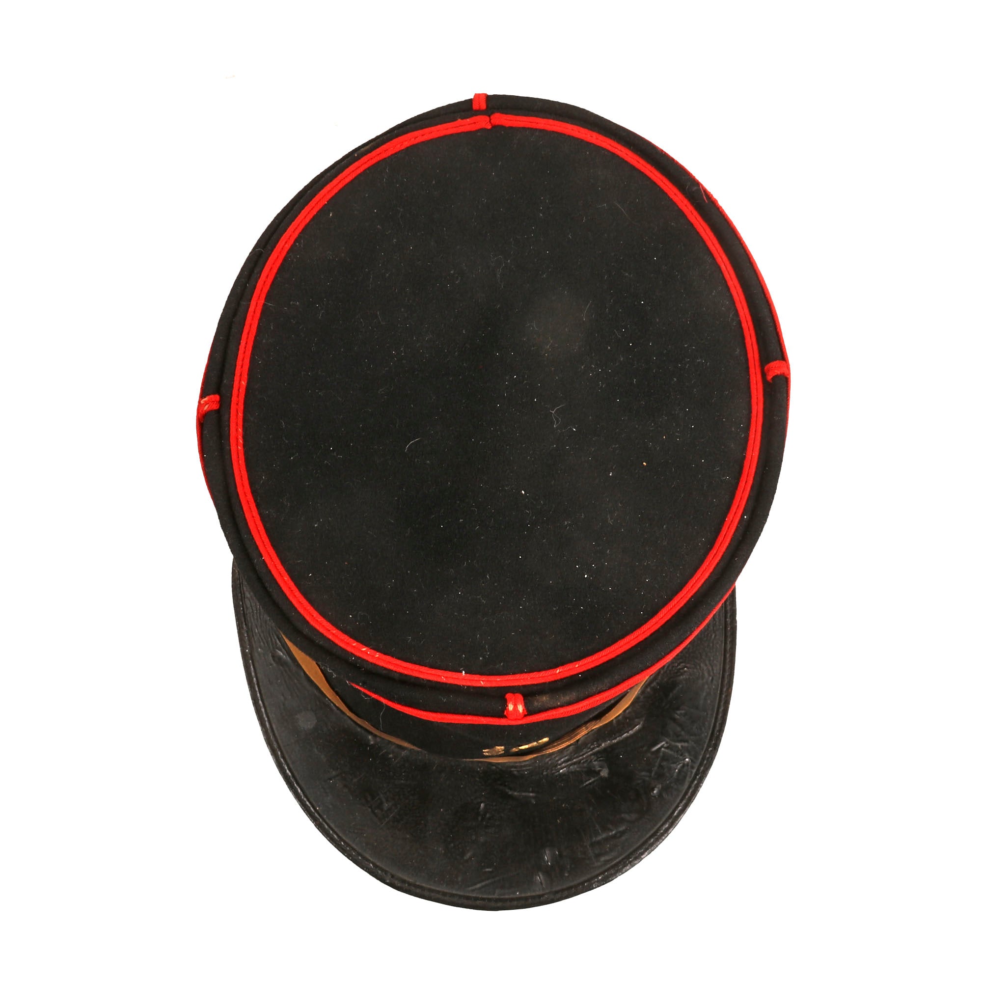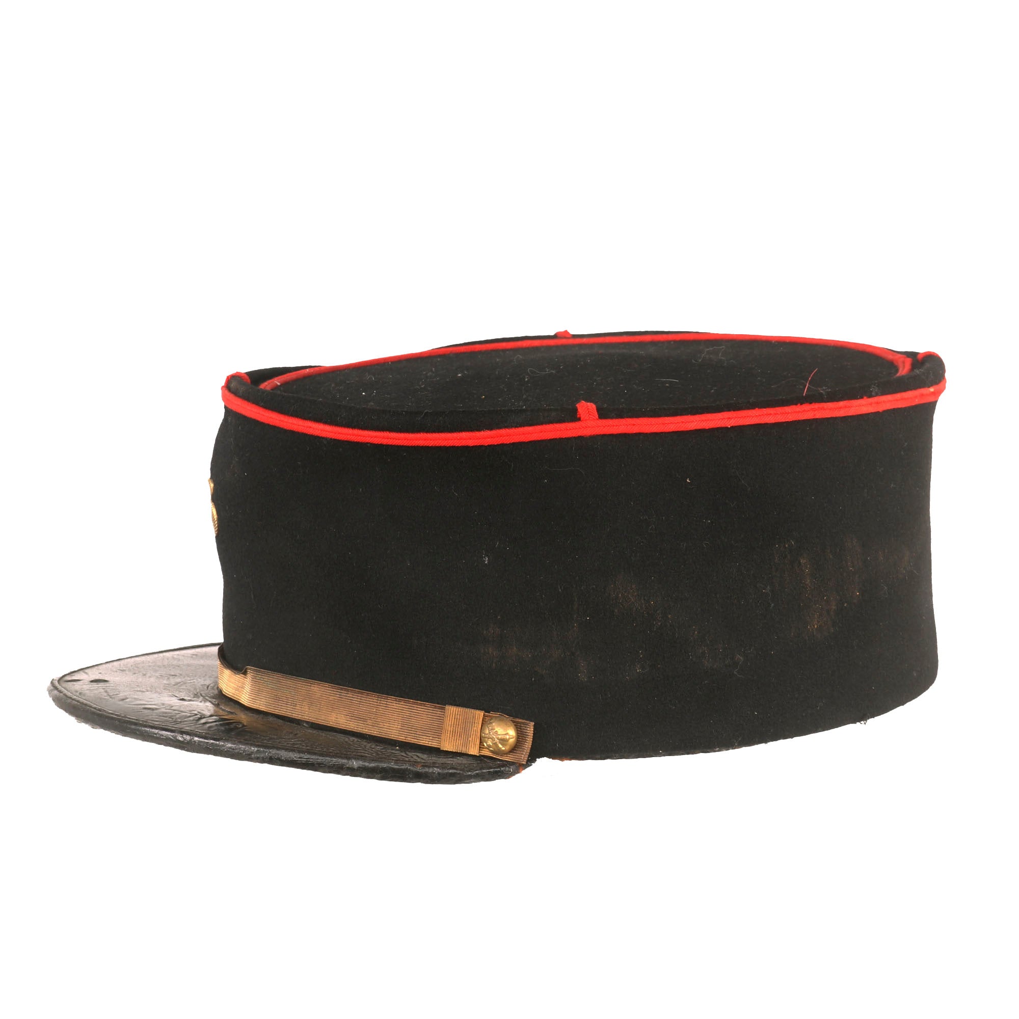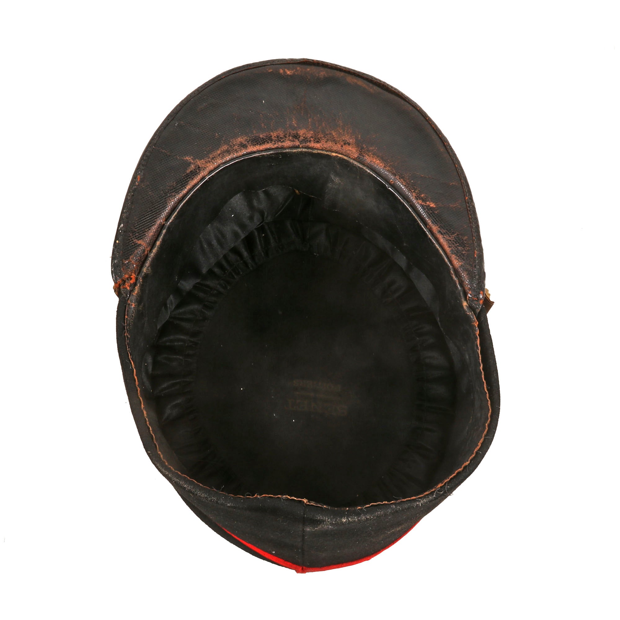 The kepi is high quality in construction and retains markings on the interior crown for manufacture by Senet of Poitiers, a company we couldn’t find much information on. The false chinstrap is still intact, held in place by two artillery buttons. The crown is in great shape with just basic wear. The interior shows that the black oilcloth sweatband is well-retained, but the stitching is coming off in multiple spots. The black lining still looks great with some sweat-staining. The visor shows heavy crazing but the character is still great. The kepi is roughly a size 7.