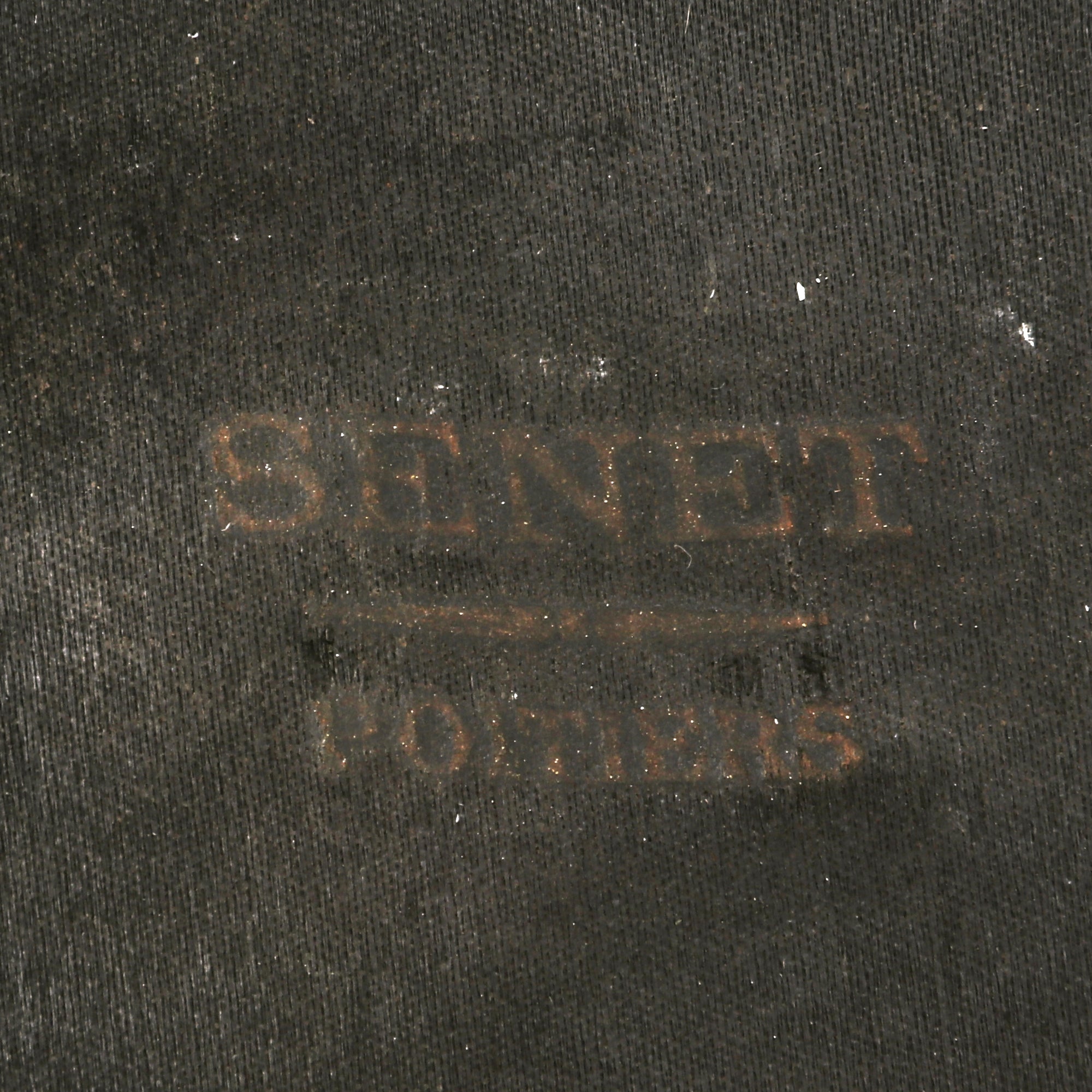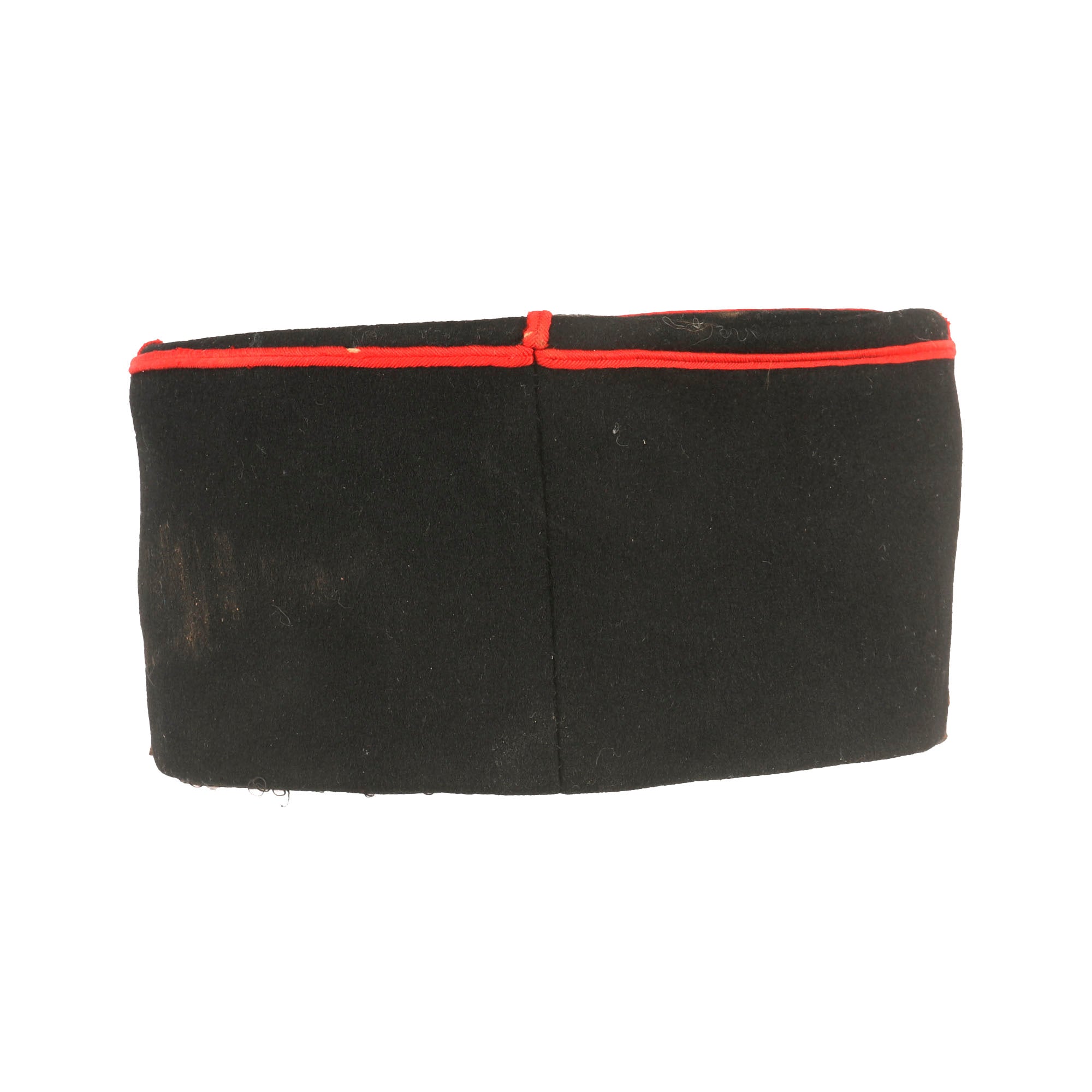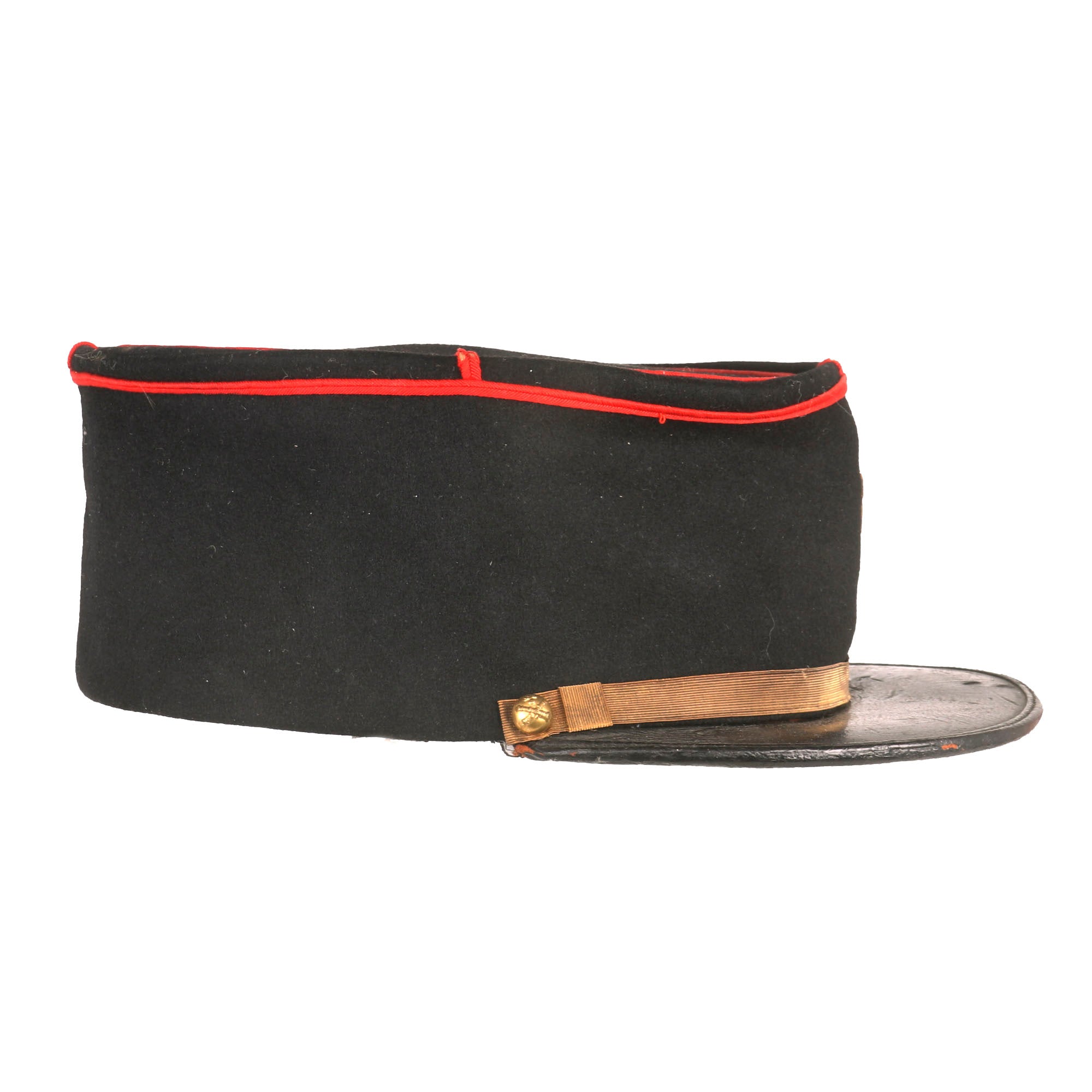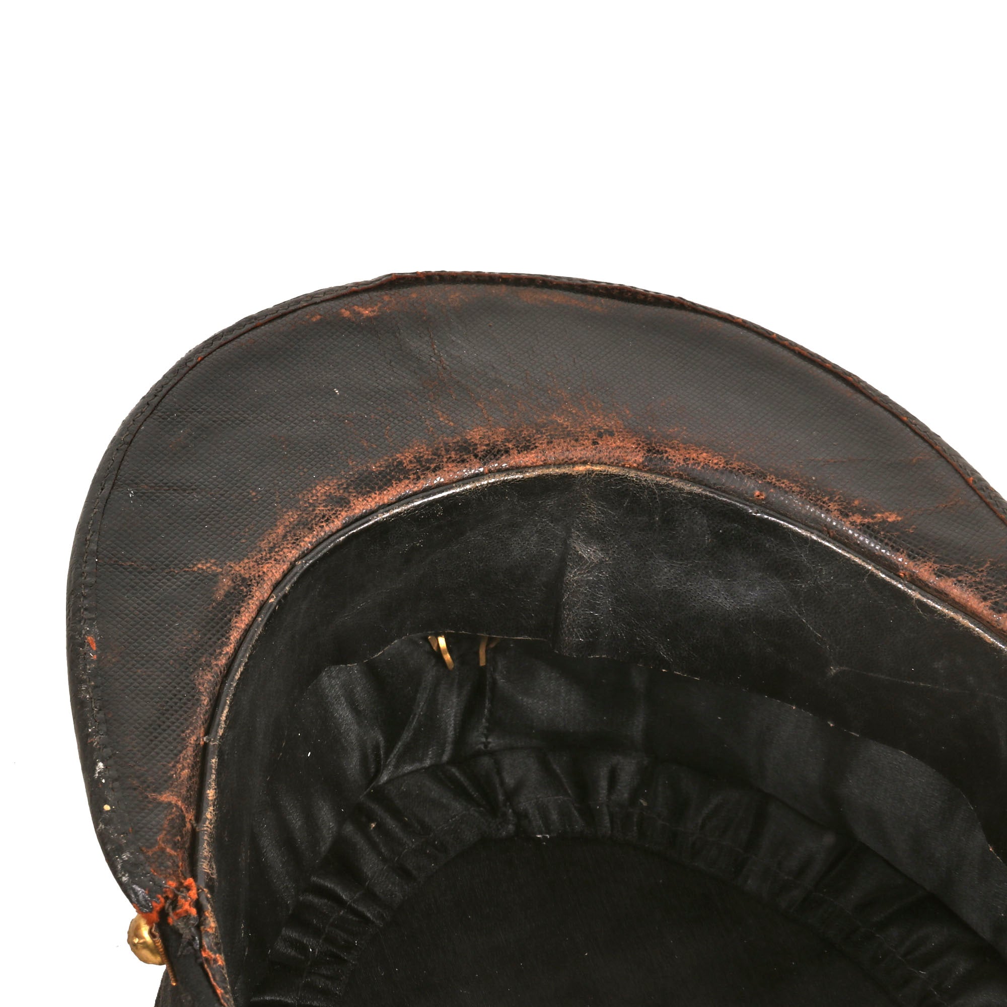 The kepi is high quality in construction and retains markings on the interior crown for manufacture by Senet of Poitiers, a company we couldn’t find much information on. The false chinstrap is still intact, held in place by two artillery buttons. The crown is in great shape with just basic wear. The interior shows that the black oilcloth sweatband is well-retained, but the stitching is coming off in multiple spots. The black lining still looks great with some sweat-staining. The visor shows heavy crazing but the character is still great. The kepi is roughly a size 7.