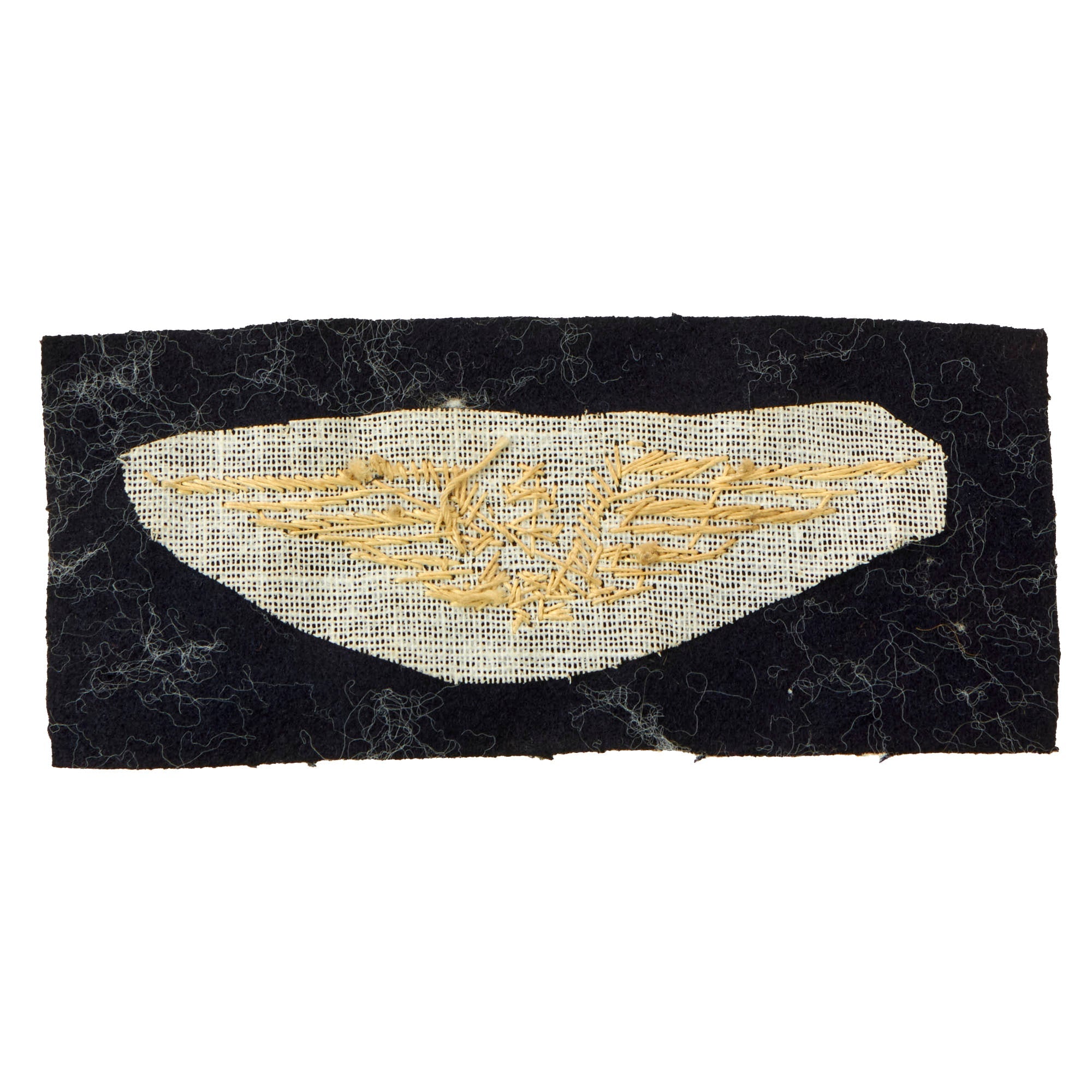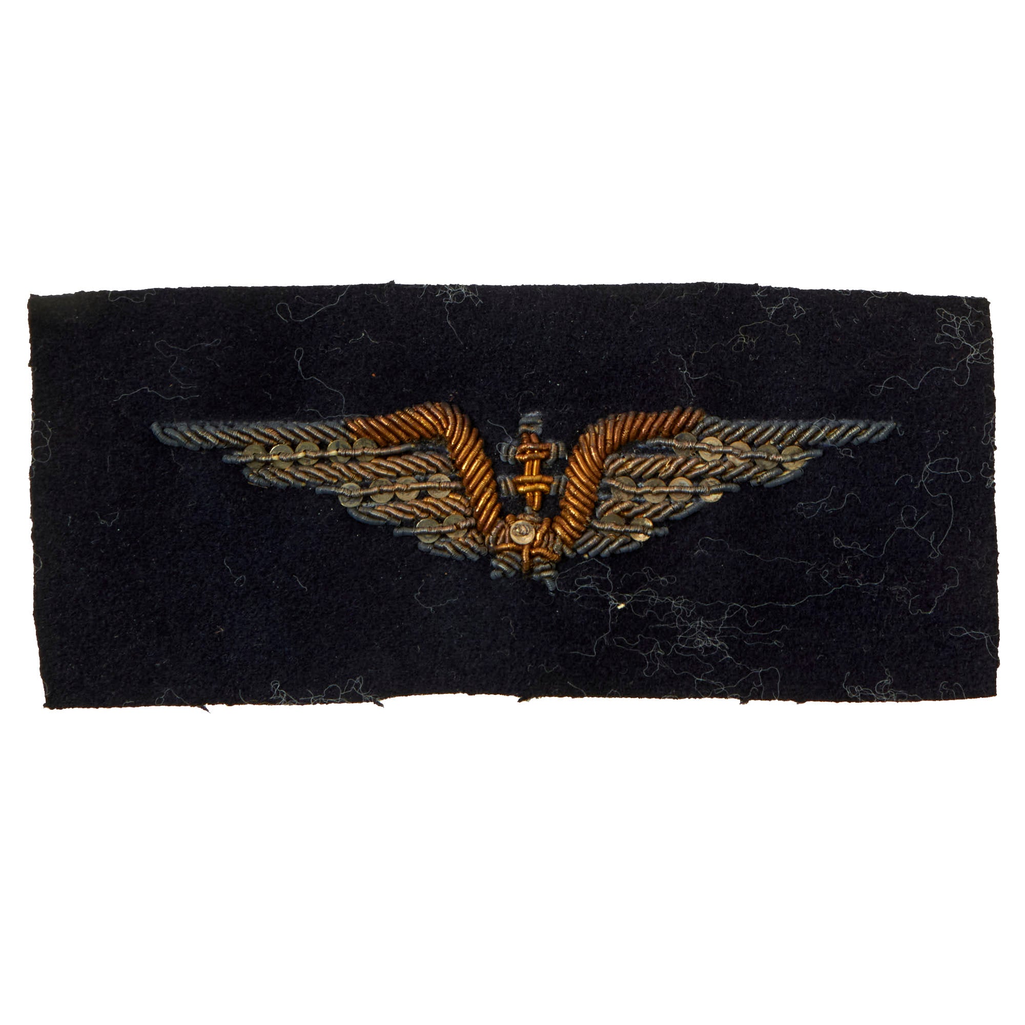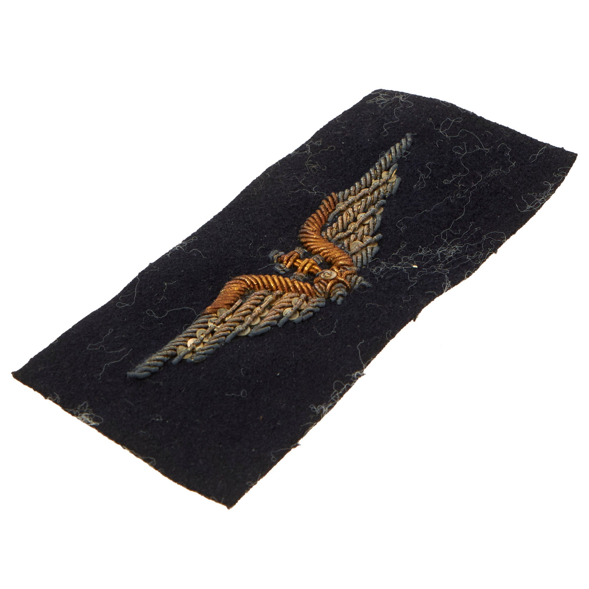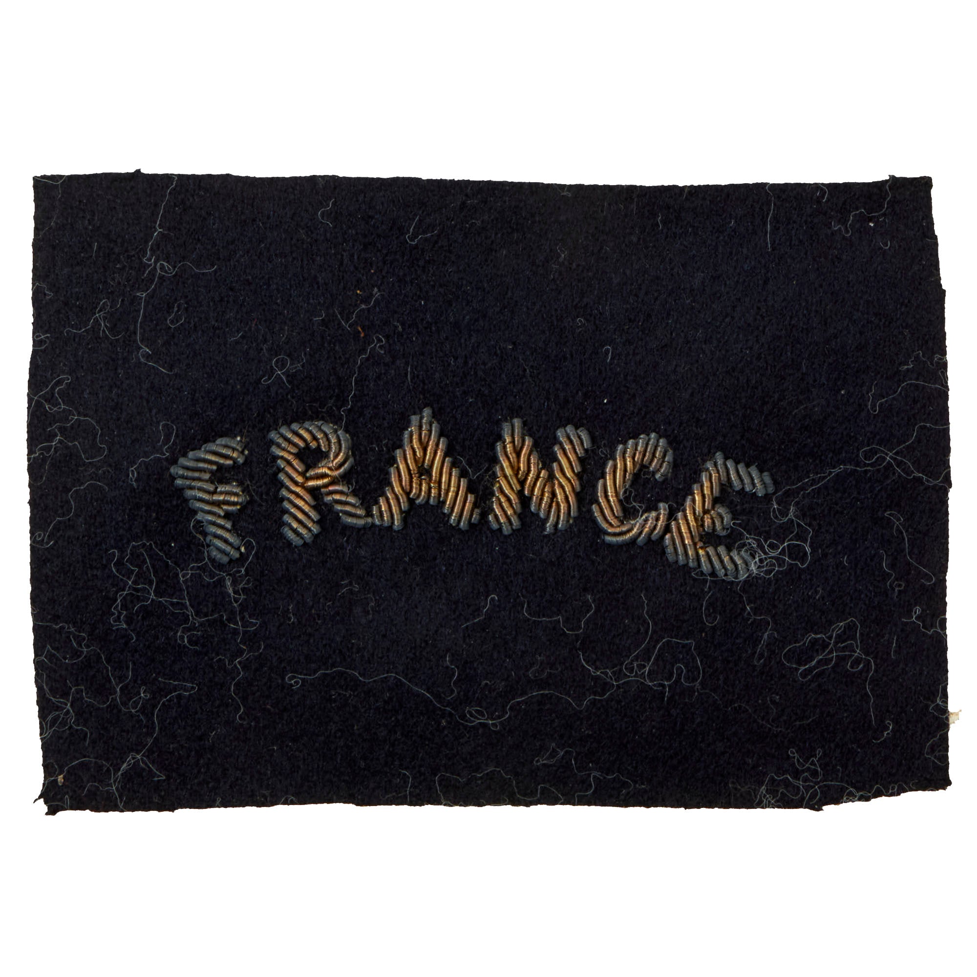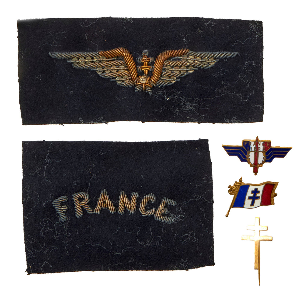 This is a great lot of insignia to a Free French pilot serving with the Royal Air Force during World War II. They include a gorgeous set of bullion FFI Pilot wings with the Cross of Lorraine in the center on a black felt backing, and a bullion FRANCE insignia on a black felt backing.