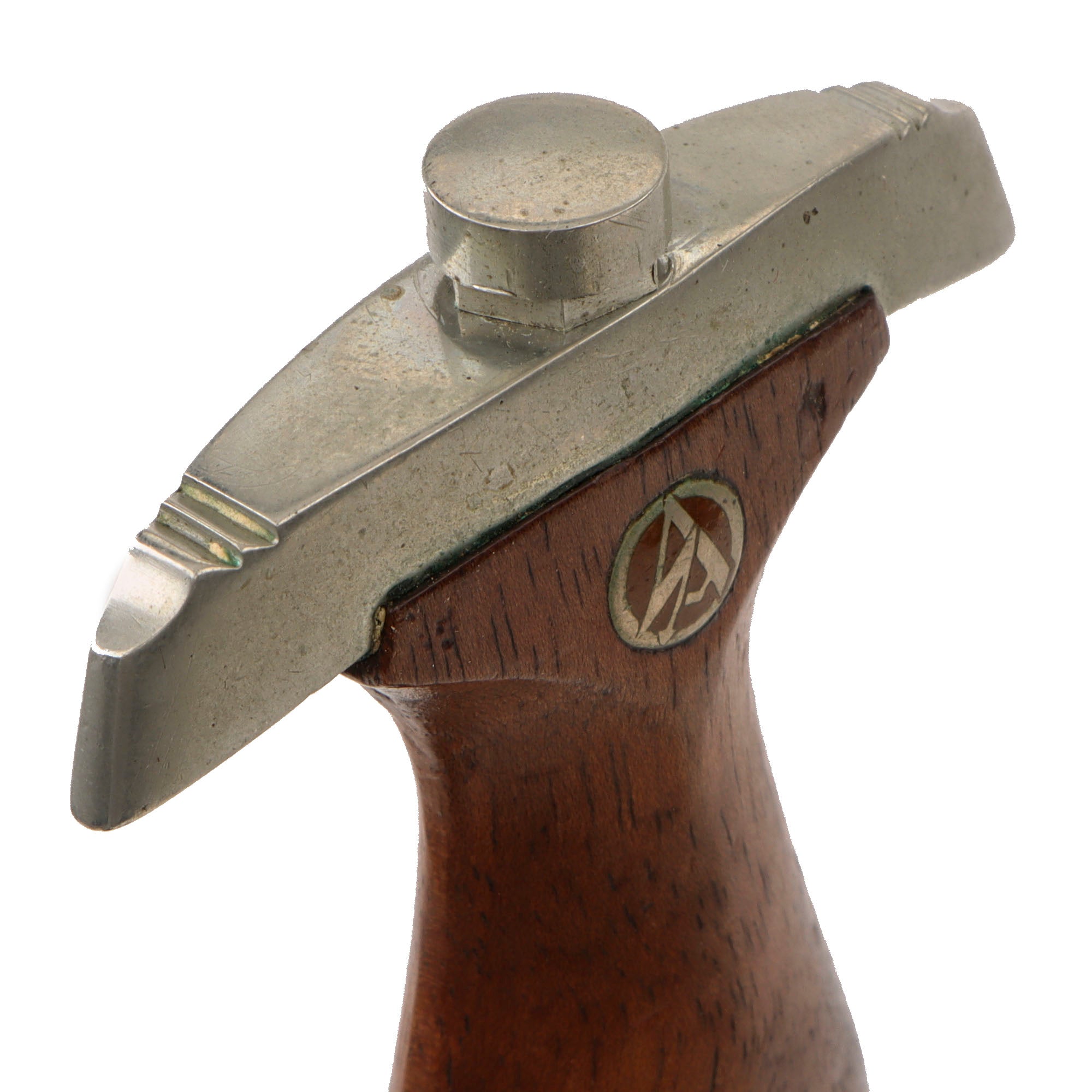 The grip is a fine product having a lovely brown color, with medium center ridge construction, showing only light wear with some denting and no cracks we can see. We have checked other examples of Sauer daggers, and they all have the same color and grain on the wood of their grips, which looks to be a different species than usually used. The SA symbol button is nicely set, with the translucent enamel is almost fully intact, though there definitely is some patination on the metal of the insignia. The grip eagle is a fine example being the style with beak that points straight. It has just a bit of verdigris on it, showing that it is solid nickel alloy, and it has patinated nicely. The details are still there to the eagle to include the beak, breast feathering, wing feathering, talons, wreath and mobile swas (hook cross). The pommel nut does show a bit of damage from turning on the outside, and the grip is still tightly secured, with no wiggle.
