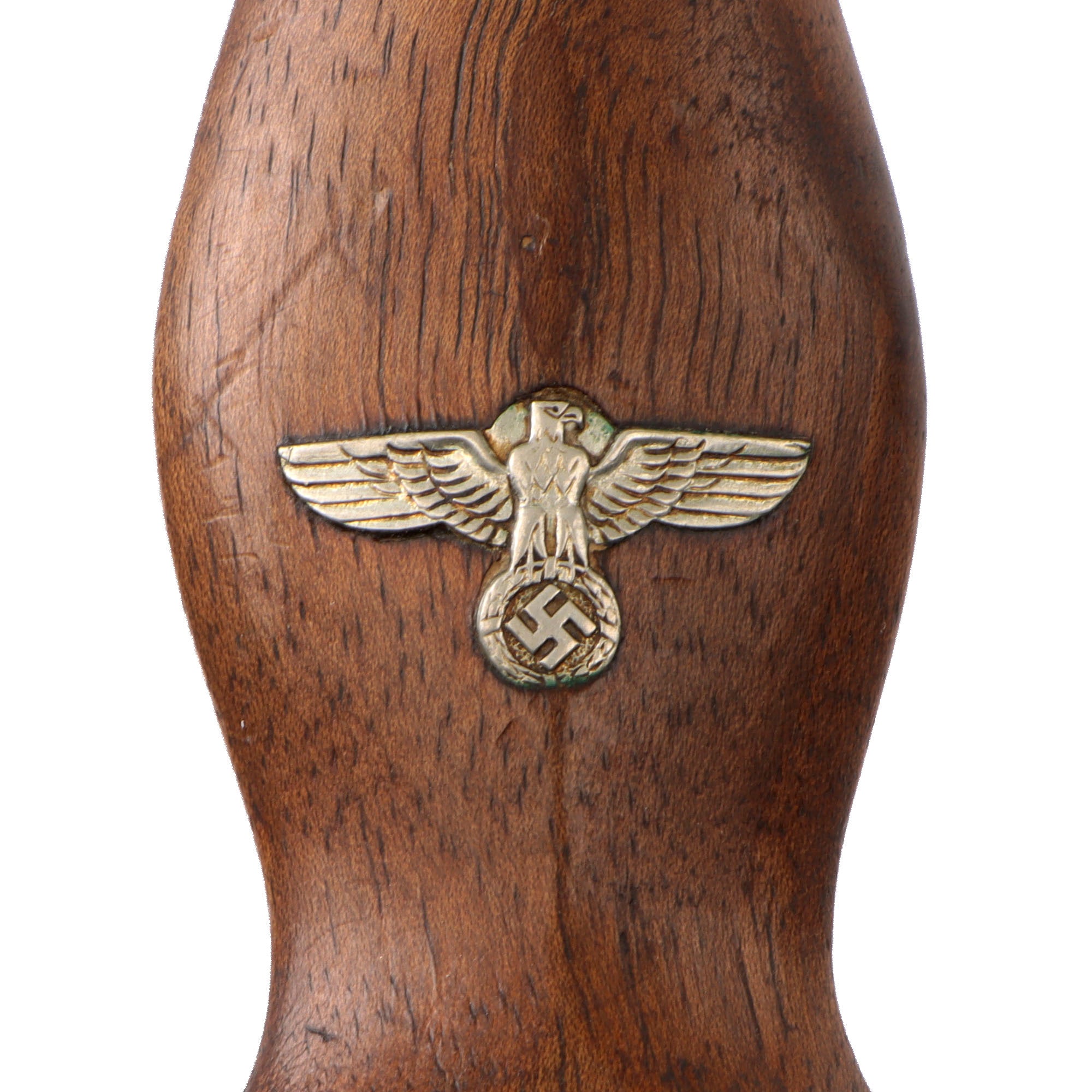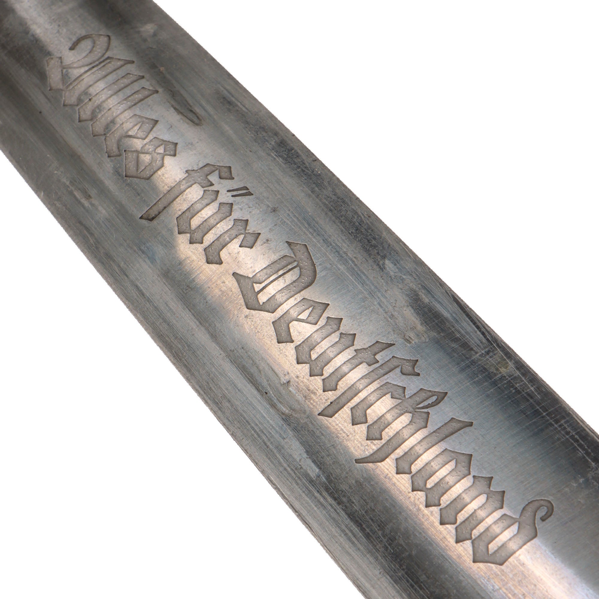 The blade was etched with the SA motto, Alles für Deutschland. Examples produced prior to 1935 were stamped with the German sector of the SA group on reverse lower crossguard. Later examples underwent standardization through the RZM ministry. These pieces were produced of cheaper plated zinc-base fittings and scabbards were simply painted brown.