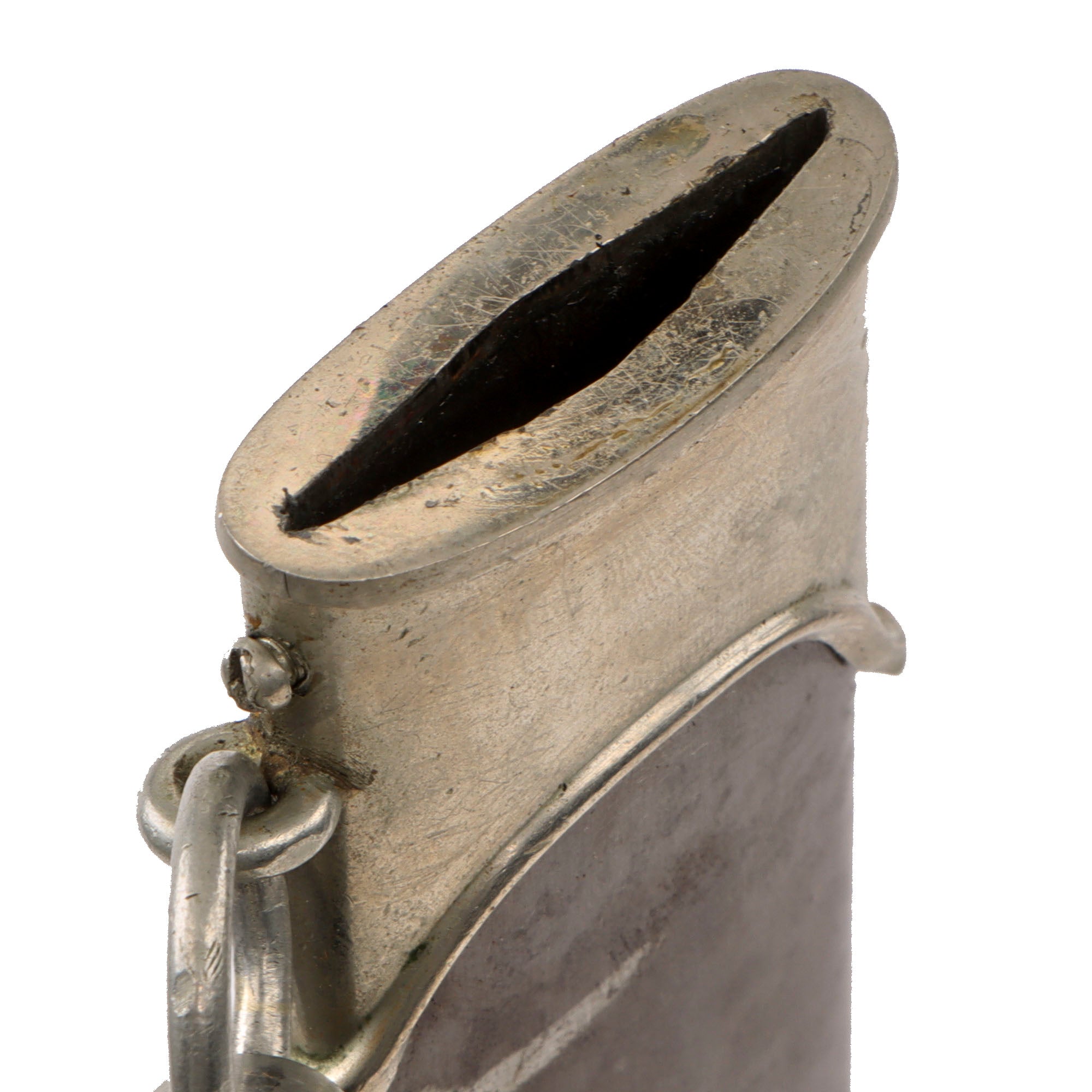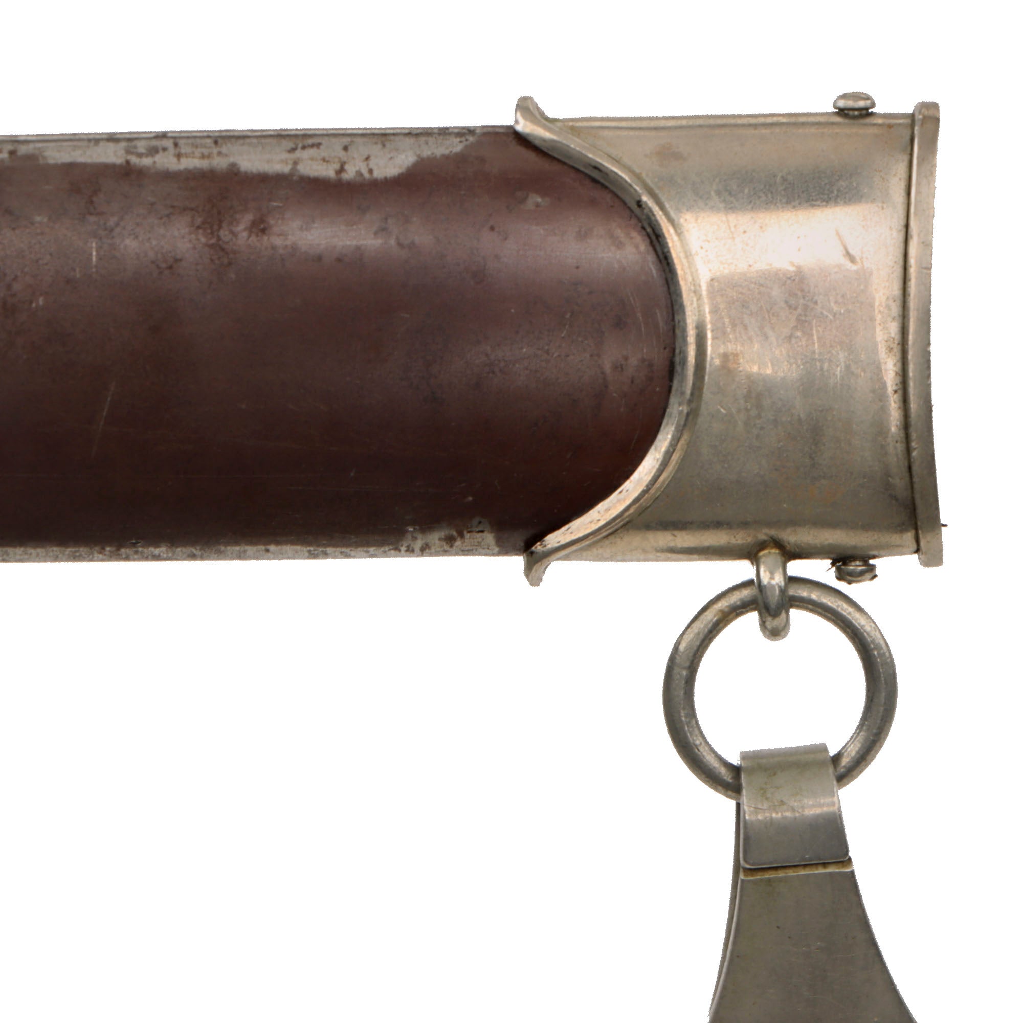 The scabbard shell is straight and dent free throughout, definitely a rarity for these early scabbards. It is the correct early-war style, produced with a brown "anodized" finish on the steel, which was then lacquered. Like most we see, the original lacquer coating is almost completely gone, however the anodized coating is very well retained on both sides, with just some speckled oxidation, as well as wear through on the "bottom" edge. The upper and lower fittings are solid nickel silver, with a great look and some dents and scratches showing typical wear. The chape is dented in some at the end, as the nickel alloy is somewhat soft, making this a common thing to see. The throat nicely matches the cross guards, and all fittings have their original dome headed screws. scabbard.
