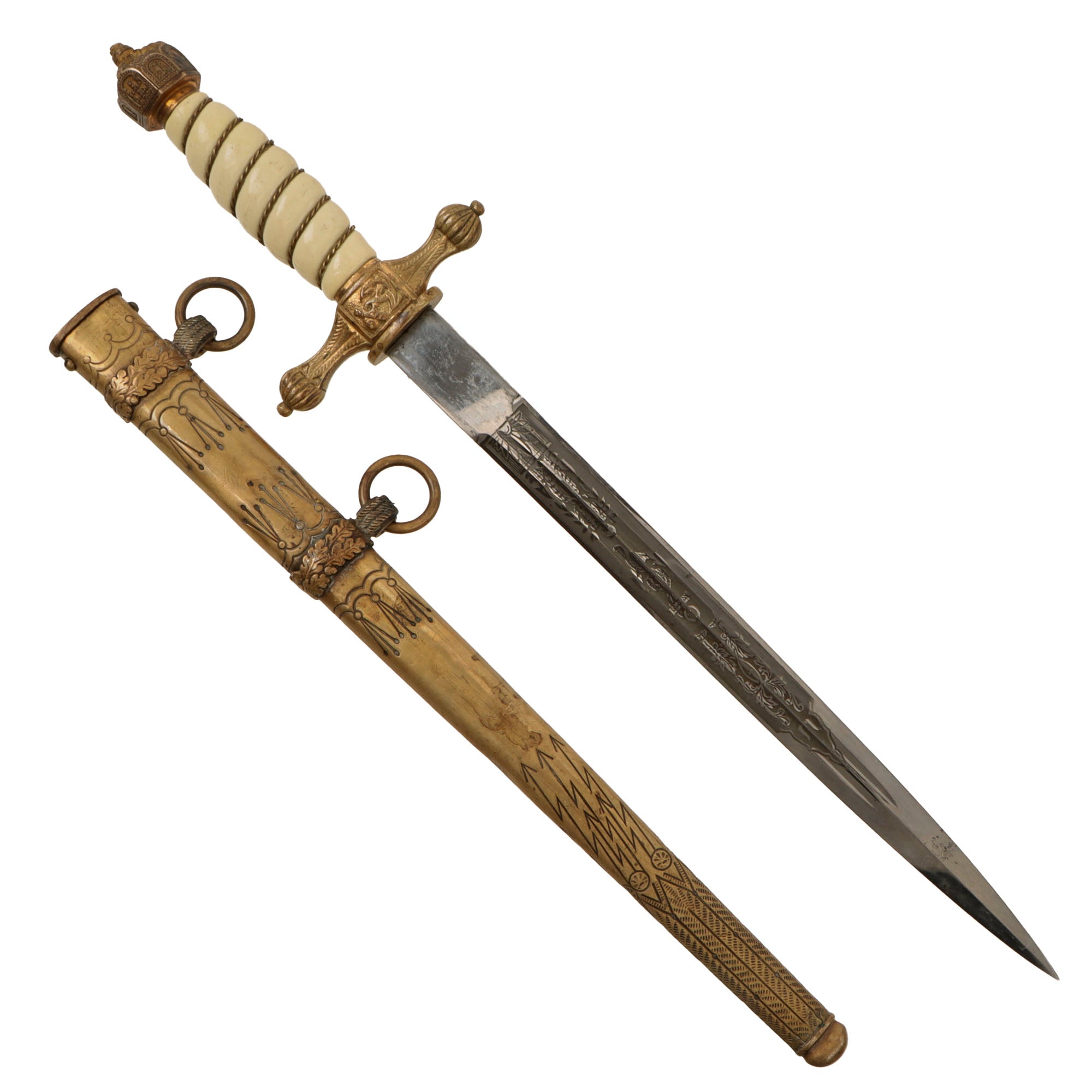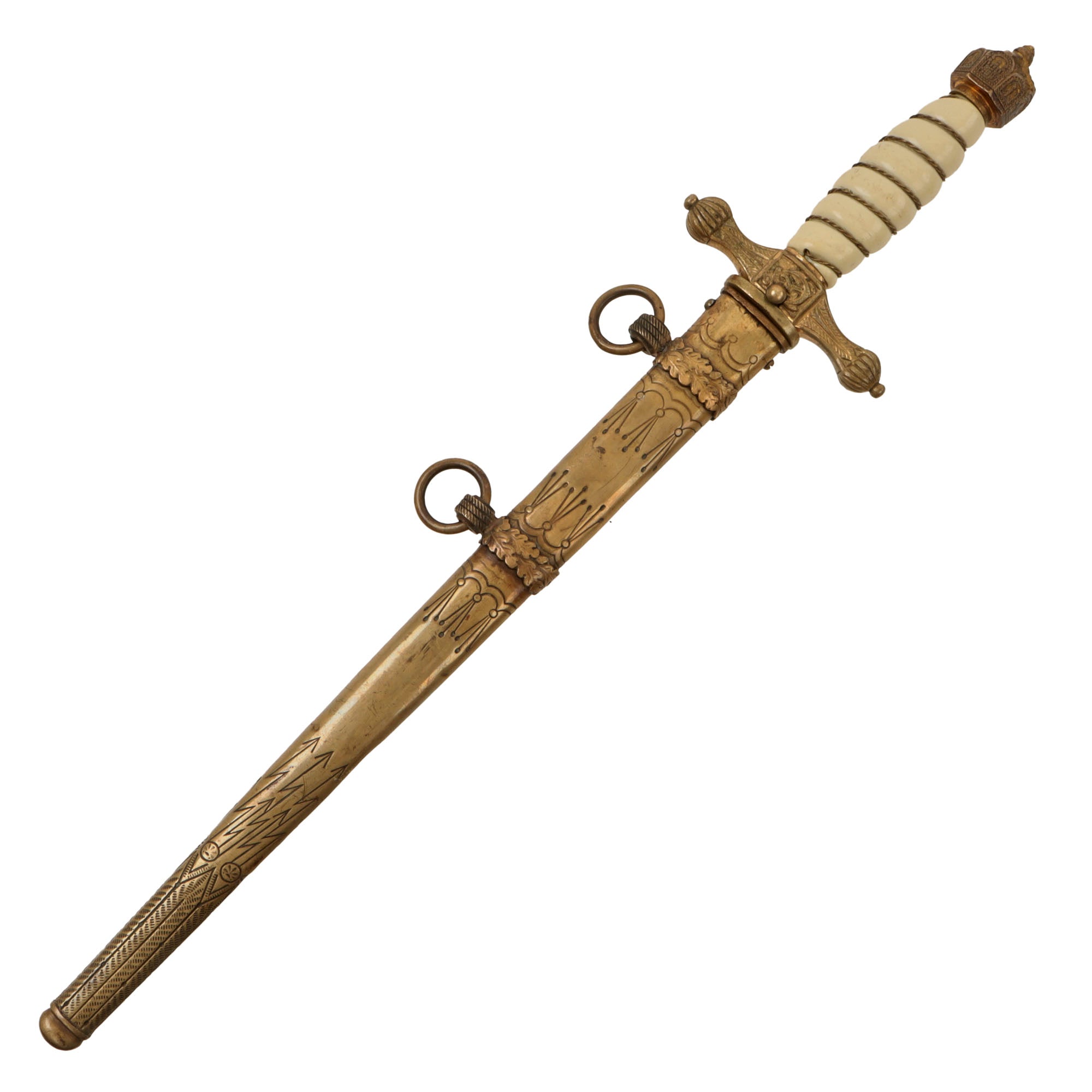 Original Item: Only One Available. This is a fine Solingen-Produced totally original WWII German 2nd Model Naval Dagger by the legendary firm Carl Eickhorn, complete with the original gold-plated "lightning bolt" style brass scabbard. This is a very nice example, showing light wear to the scabbard and blade, and it has a lovely "been there" look to it! This example also has an Imperial Crown pommel which appears to have been added to the dagger during the period. It is very understandable why a Kaiserliche Marine Officer who had served during World War I would want to keep the Imperial Crown on his dagger’s pommel. It’s well-known that members of the Kriegsmarine had much less respect for AH than the Army and Luftwaffe. It could also be that after the war, he took the pommel off and replaced it with the crown during the denazification process.