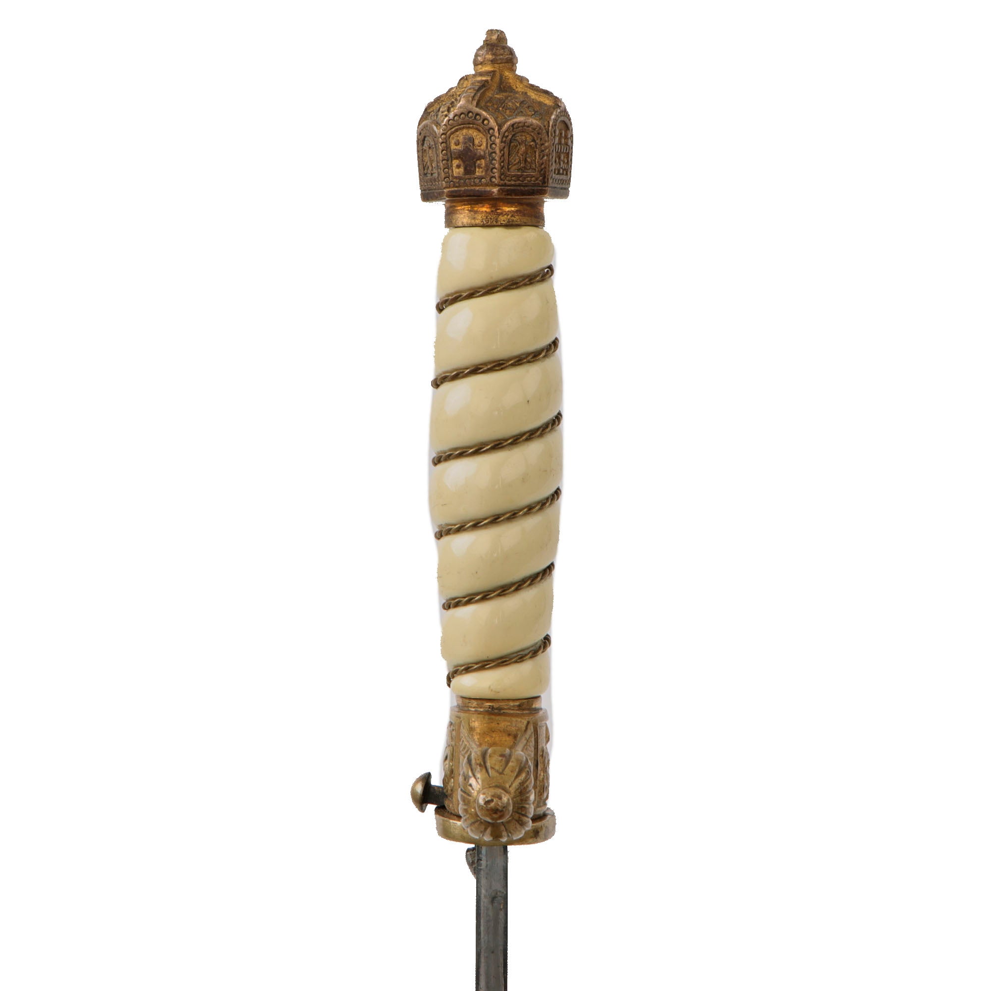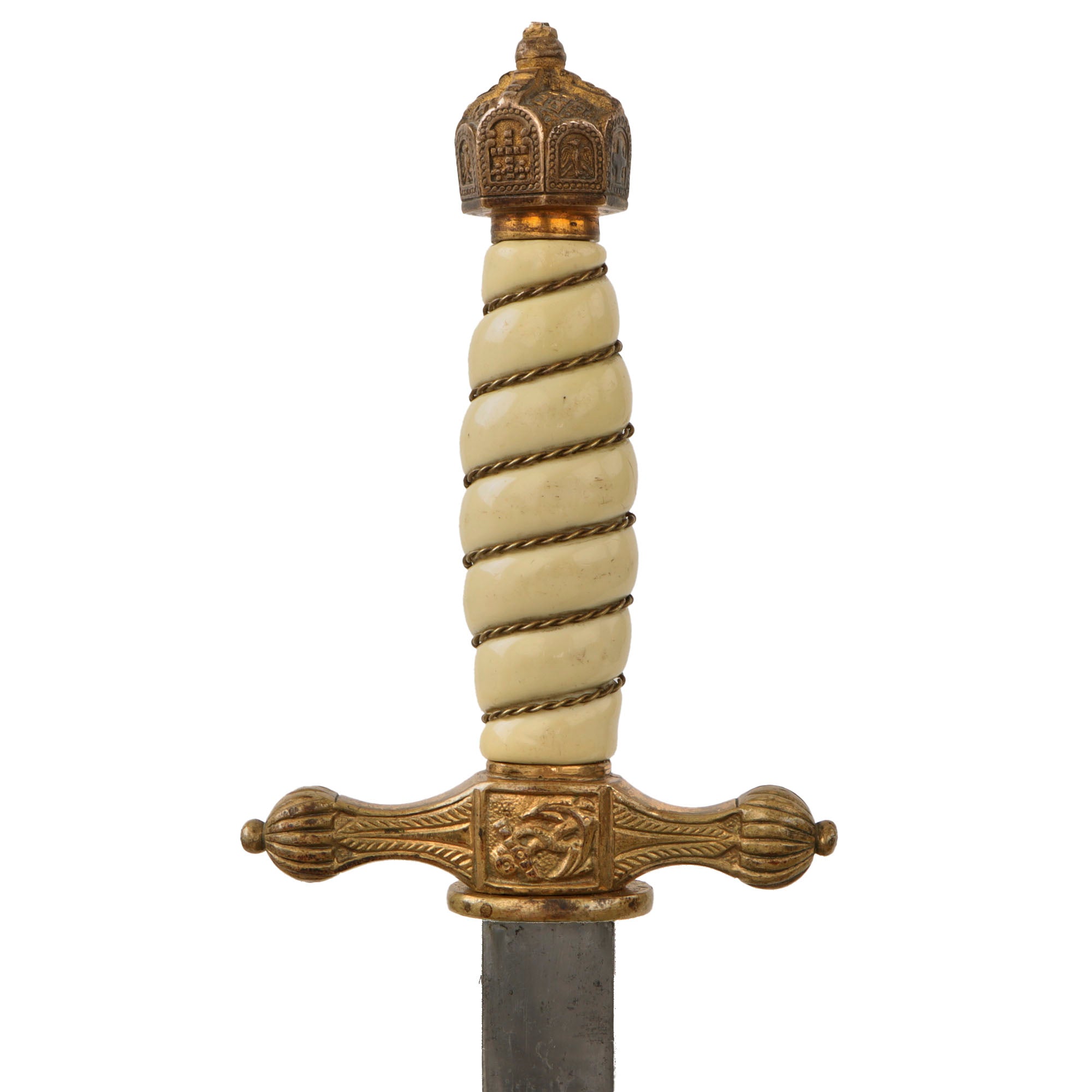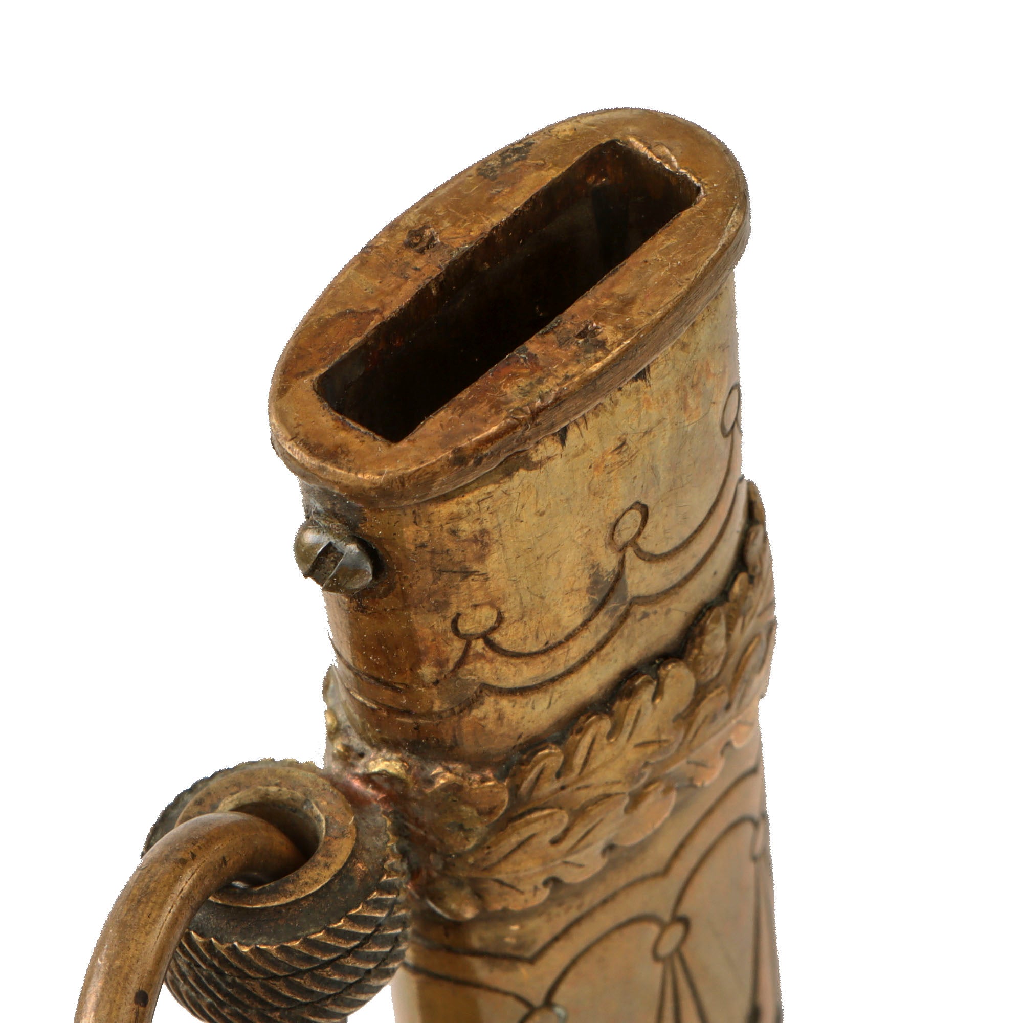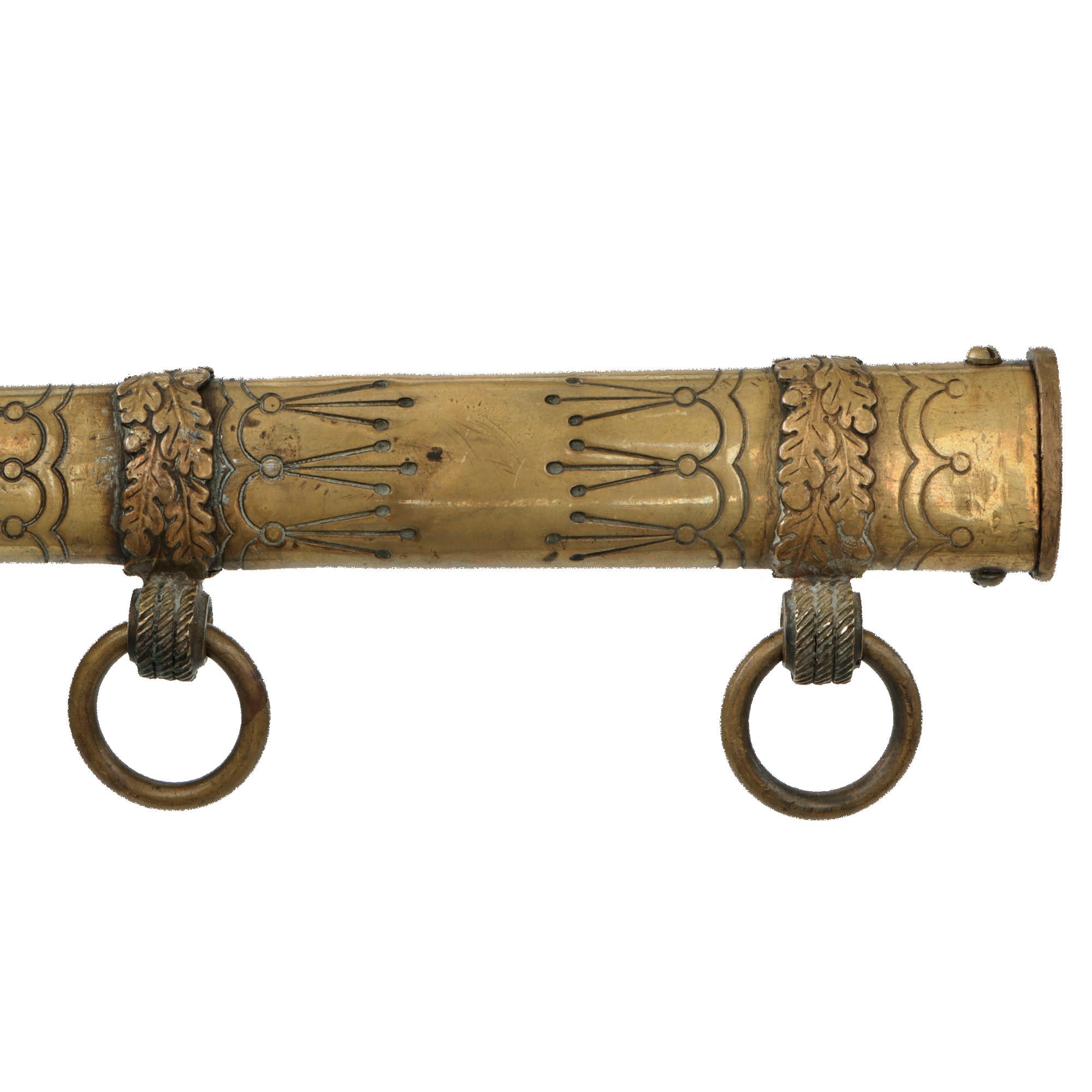 The lightning bolt scabbard is in very good condition, but does have some small dents above the throat. The original gold wash is now completely worn away, and there is some very minor verdigris accumulation in places. The scabbard is stamped with well-defined palmettes around the bands and lightning bolts, ermine feet and acanthus leaves down to the chape. The bands feature overlapping oak leaves and acorns. The ring ferrules are the type where only the center has serrations, and the rings are still present. The throat is retained by cheese headed screws on the narrow sides, and both are present. The finish overall is still very nice, with a lovely patina.