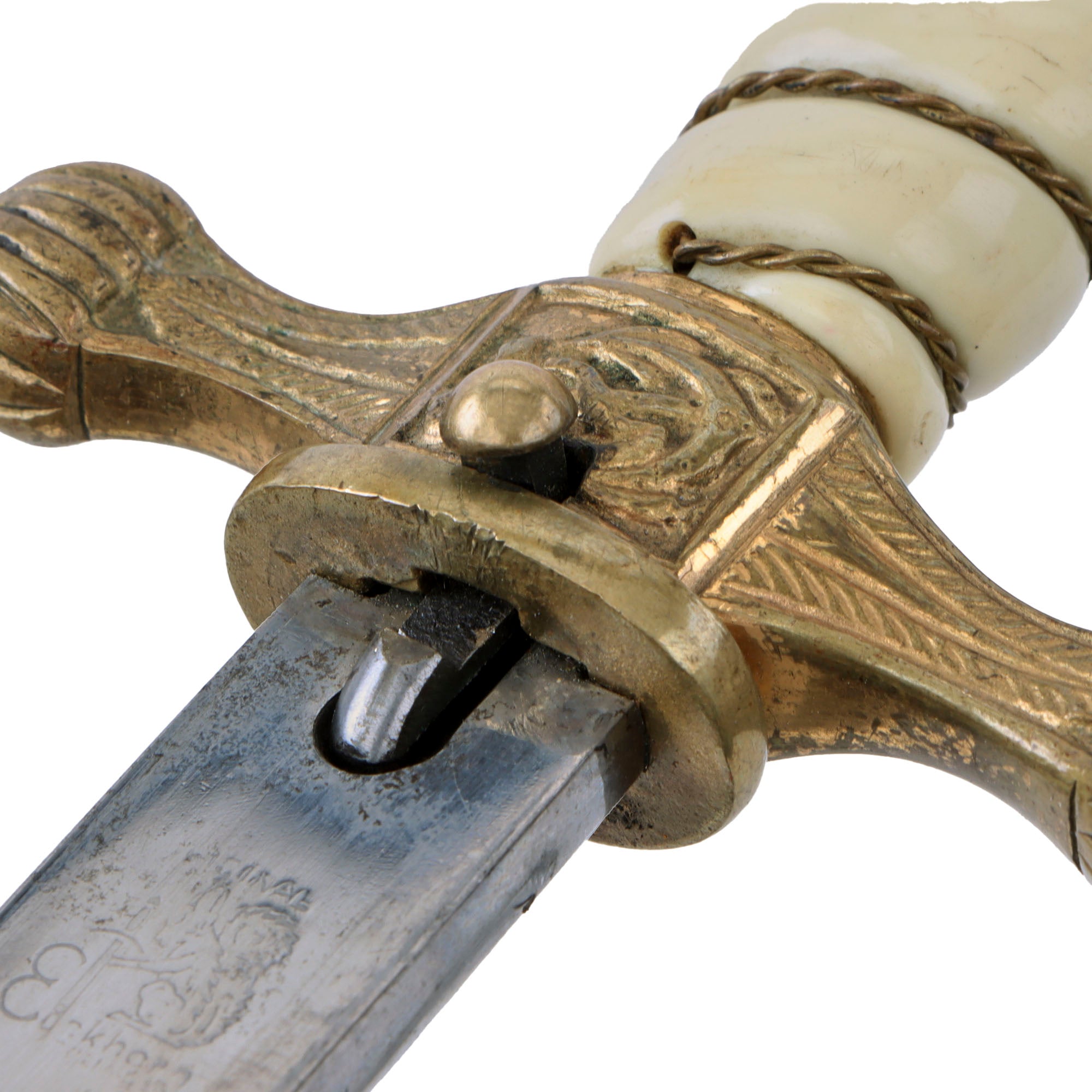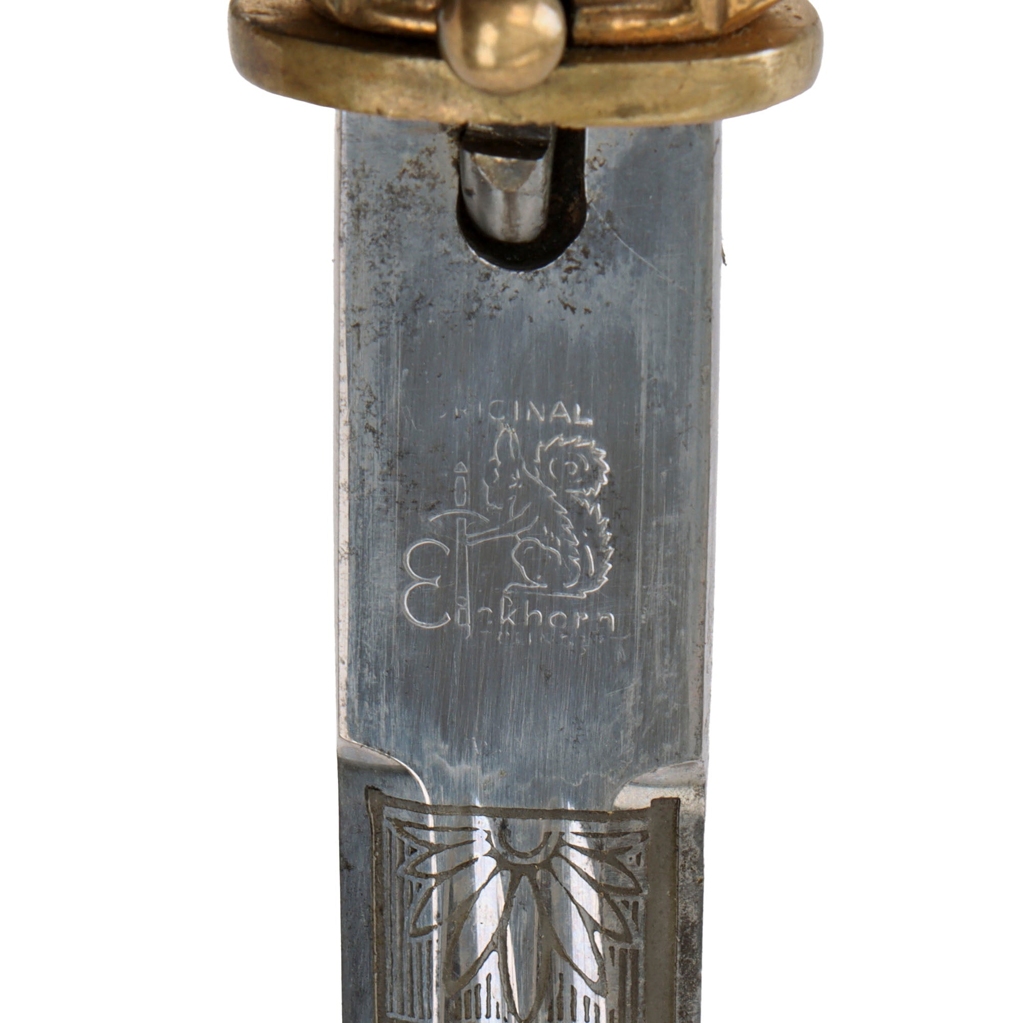 The reverse ricasso is stamped with the 1935-41 Eickhorn trademark: a seated squirrel holding a sword, with the word ORIGINAL above and the firm's name and location, Eickhorn / SOLINGEN below. The sword correctly has the letter "i" from the company name on the blade where it pierces the text. This company is a legendary producer of edged weapons, and were particularly desirable even among other Solingen producers. Their "Field Marshall" series of officer's swords are all highly collectible.