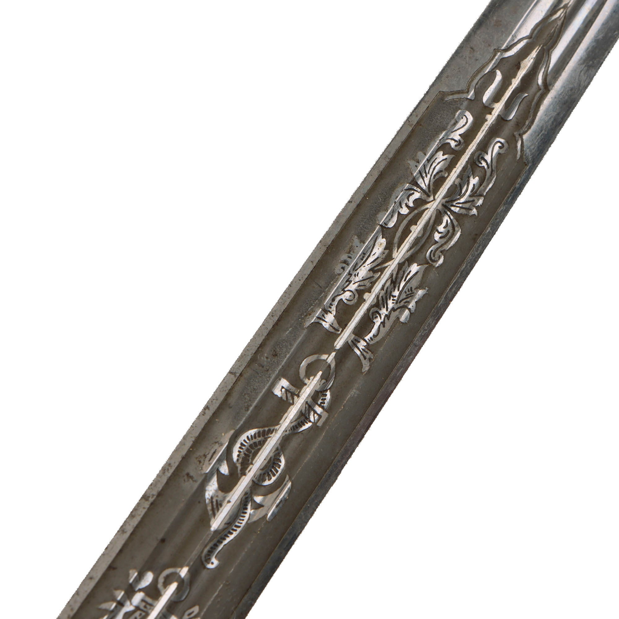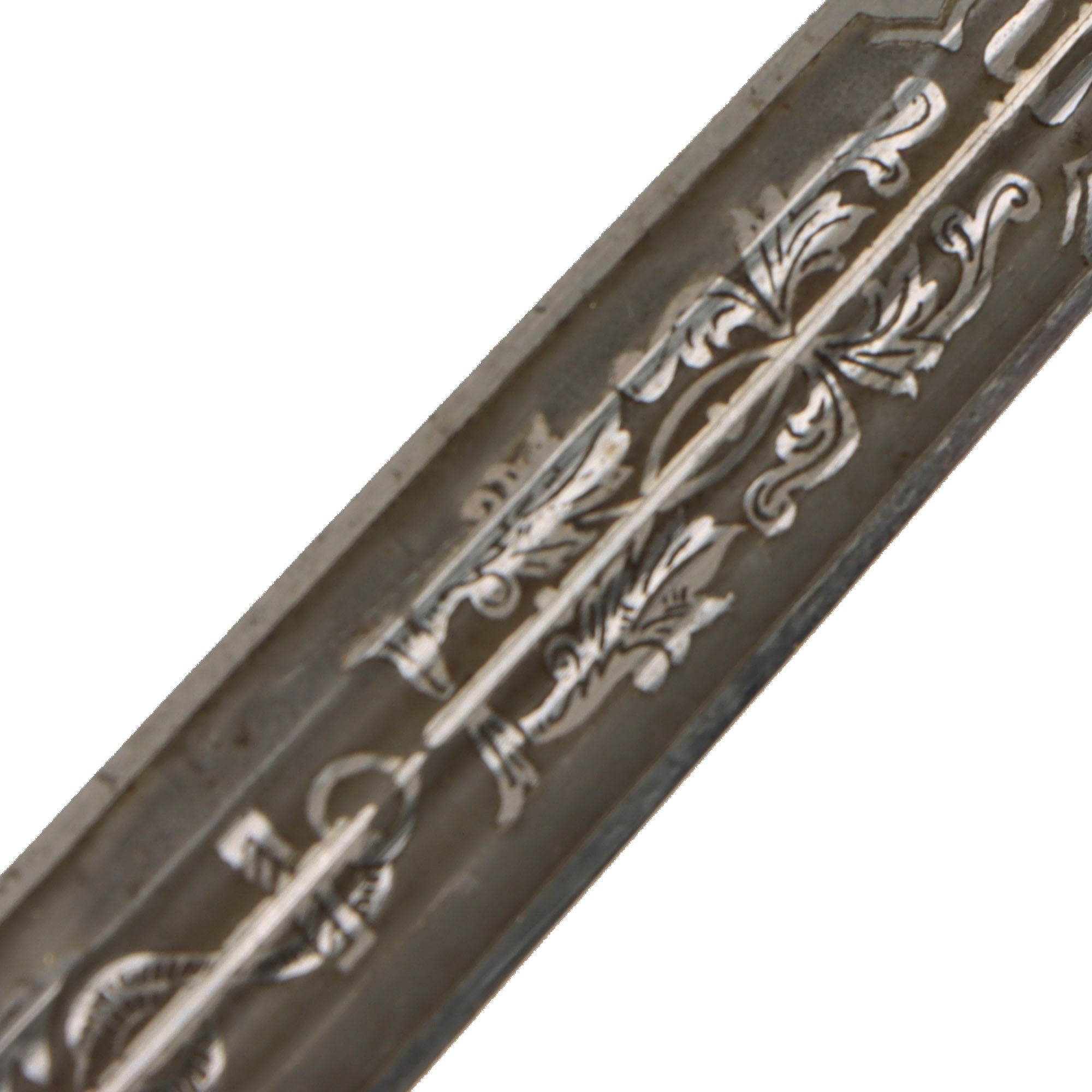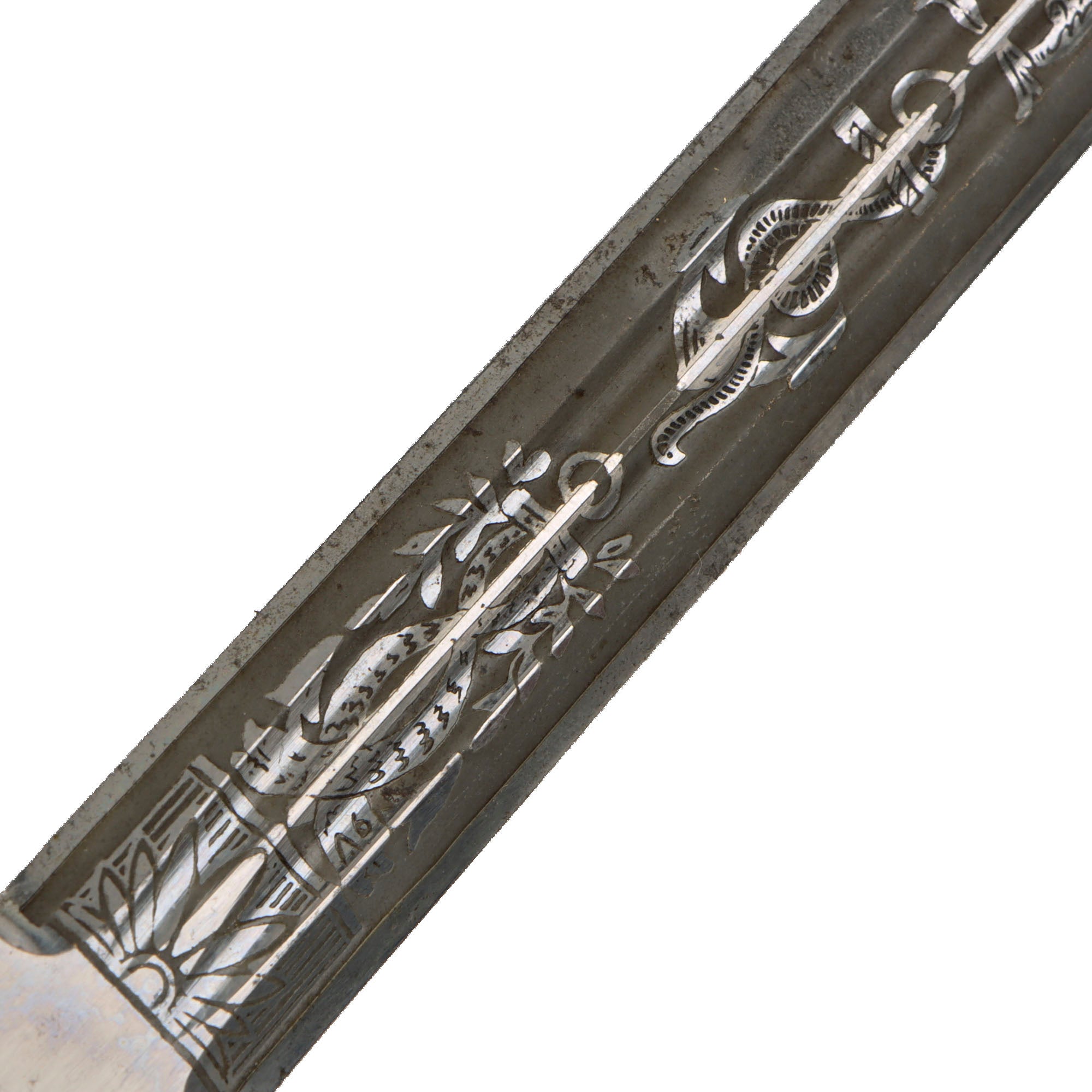 The blade is a typical unplated example, with an excellent fouled anchor etch on both sides of the carbon steel blade. It is in excellent condition, and we almost thought it was a nickel plated example, but there are a few spots of staining, so it is definitely carbon steel. There are some swirl marks from cleaning and the scabbard, but overall it's really in great shape, with a nick free edge and intact needle tip. There is a bit of fading to the dark background in the etching.