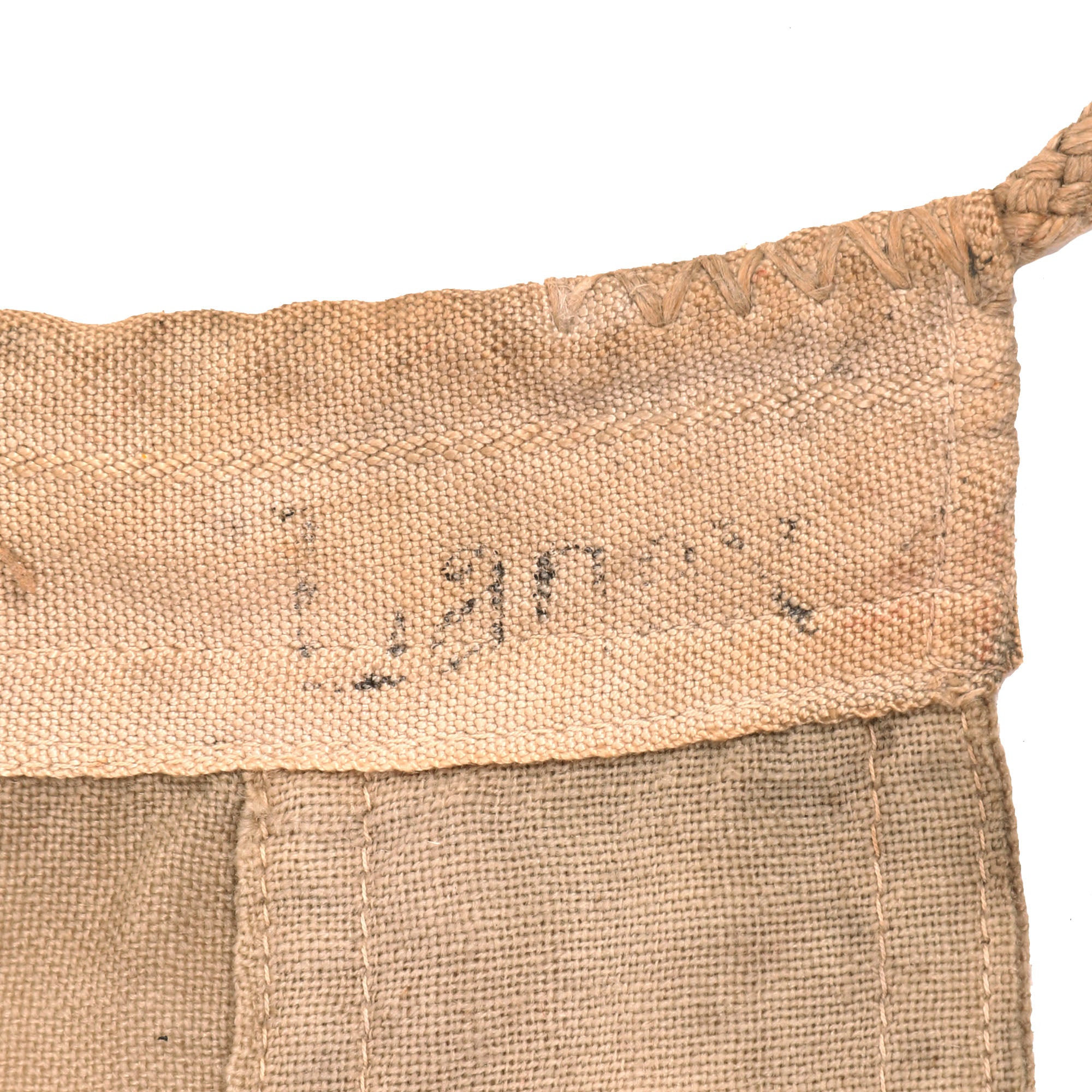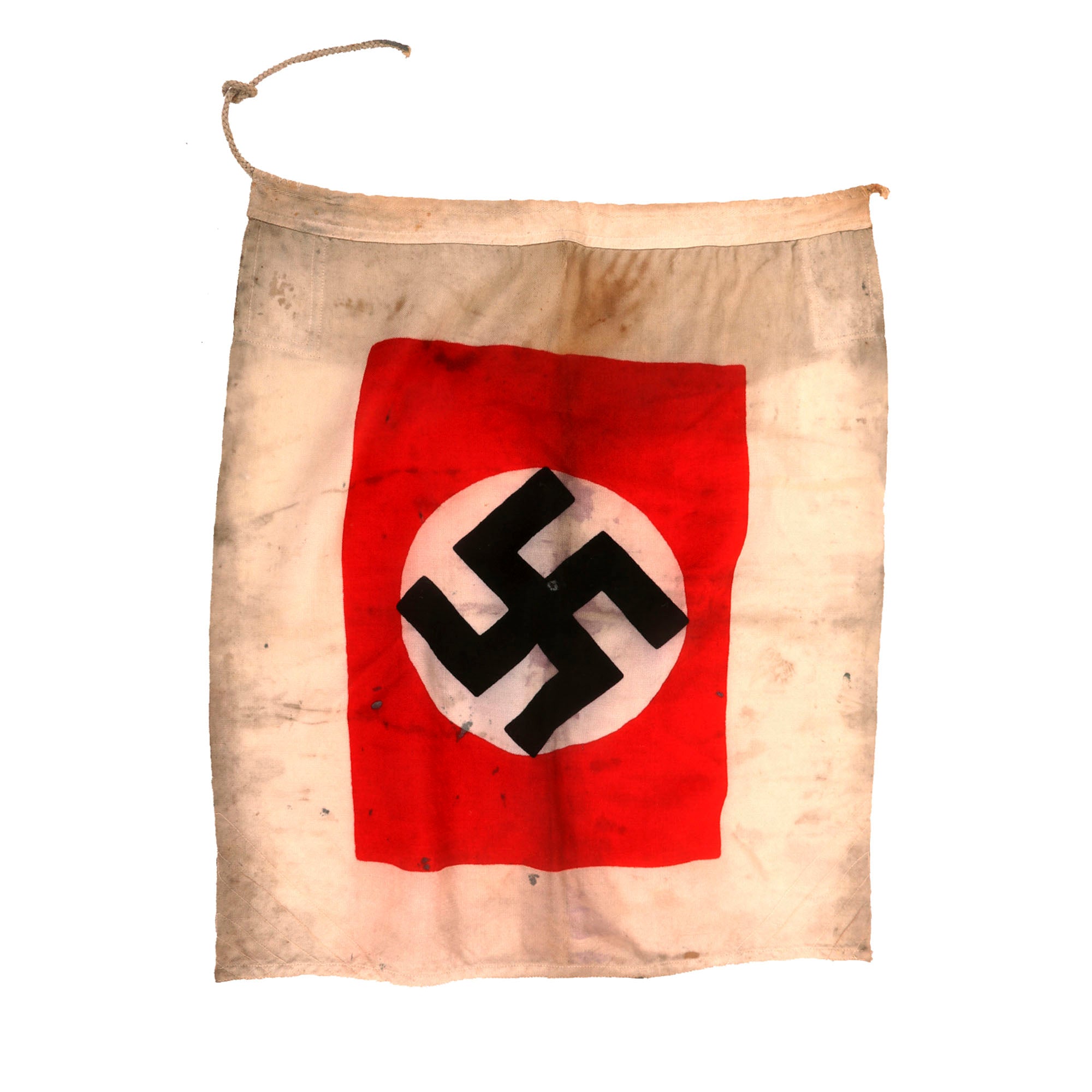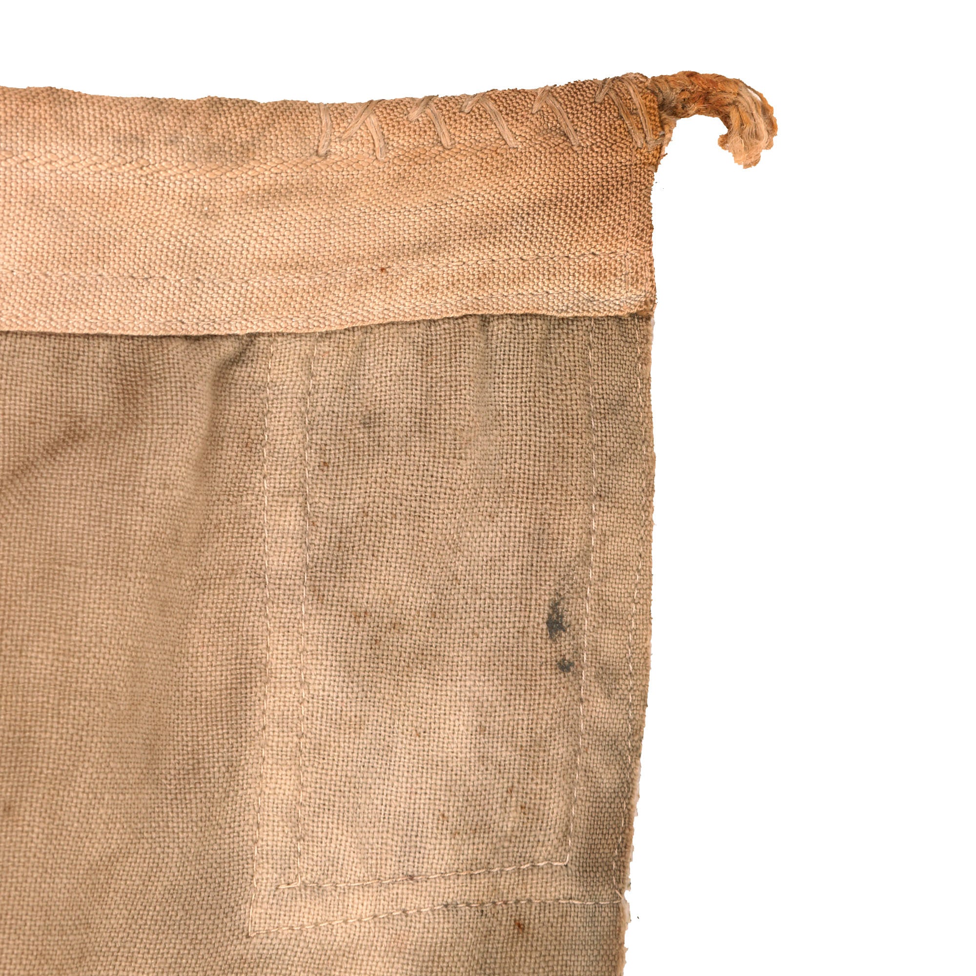 The design of the flag is basically the standard NSDAP National Flag in the center with a wide white border. This example is dyed into the fabric of the flag, which looks to be a wool / cotton blend. It has a canvas header with a halyard inside, forming loops at both ends that originally had metal hooks, but they are now gone. The flag shows that it definitely saw service in the field, and now has numerous holes and tears from deterioration of the fabric. We usually see these rare flags in nearly unissued condition, so finding one that really saw use at a German controlled harbor is a real treat!