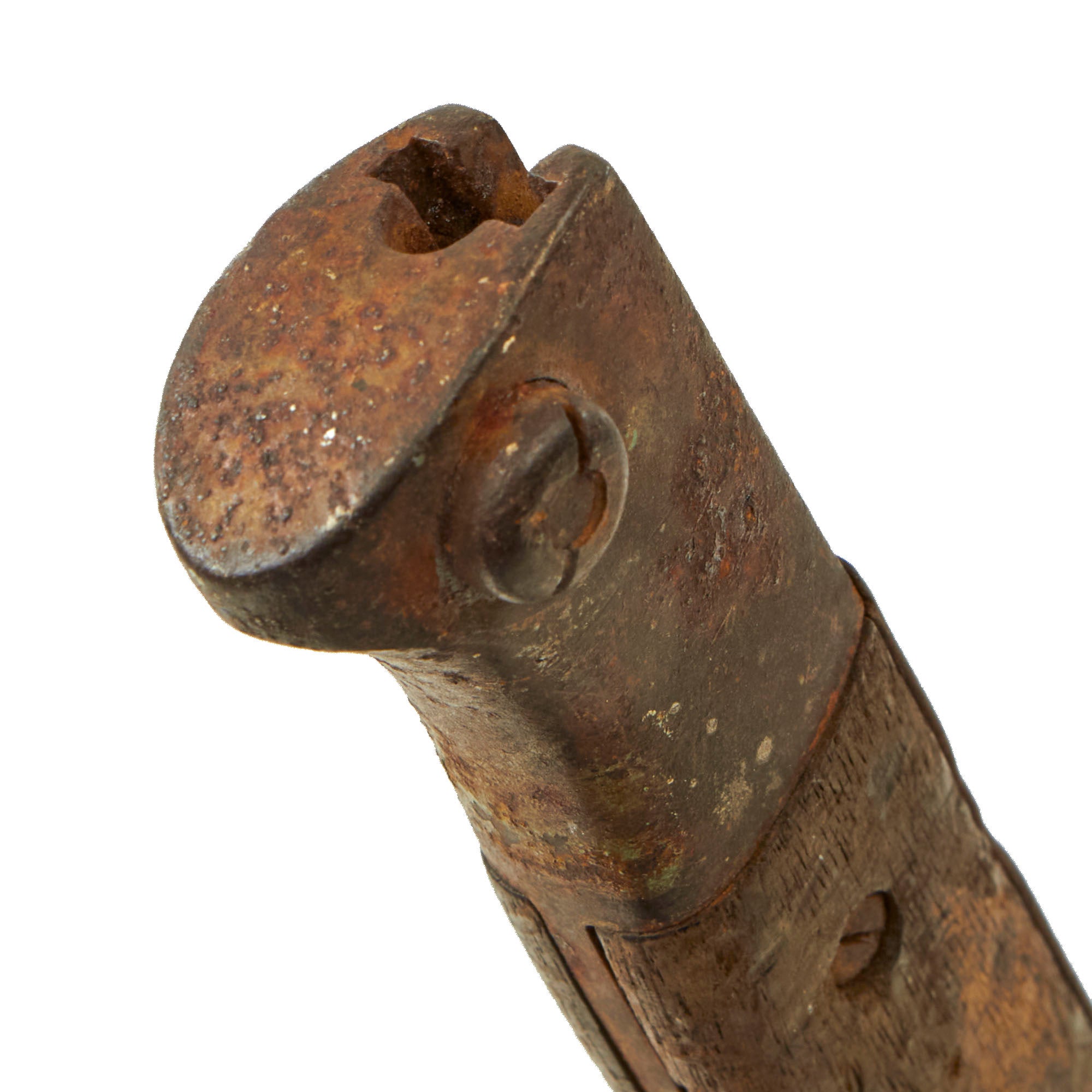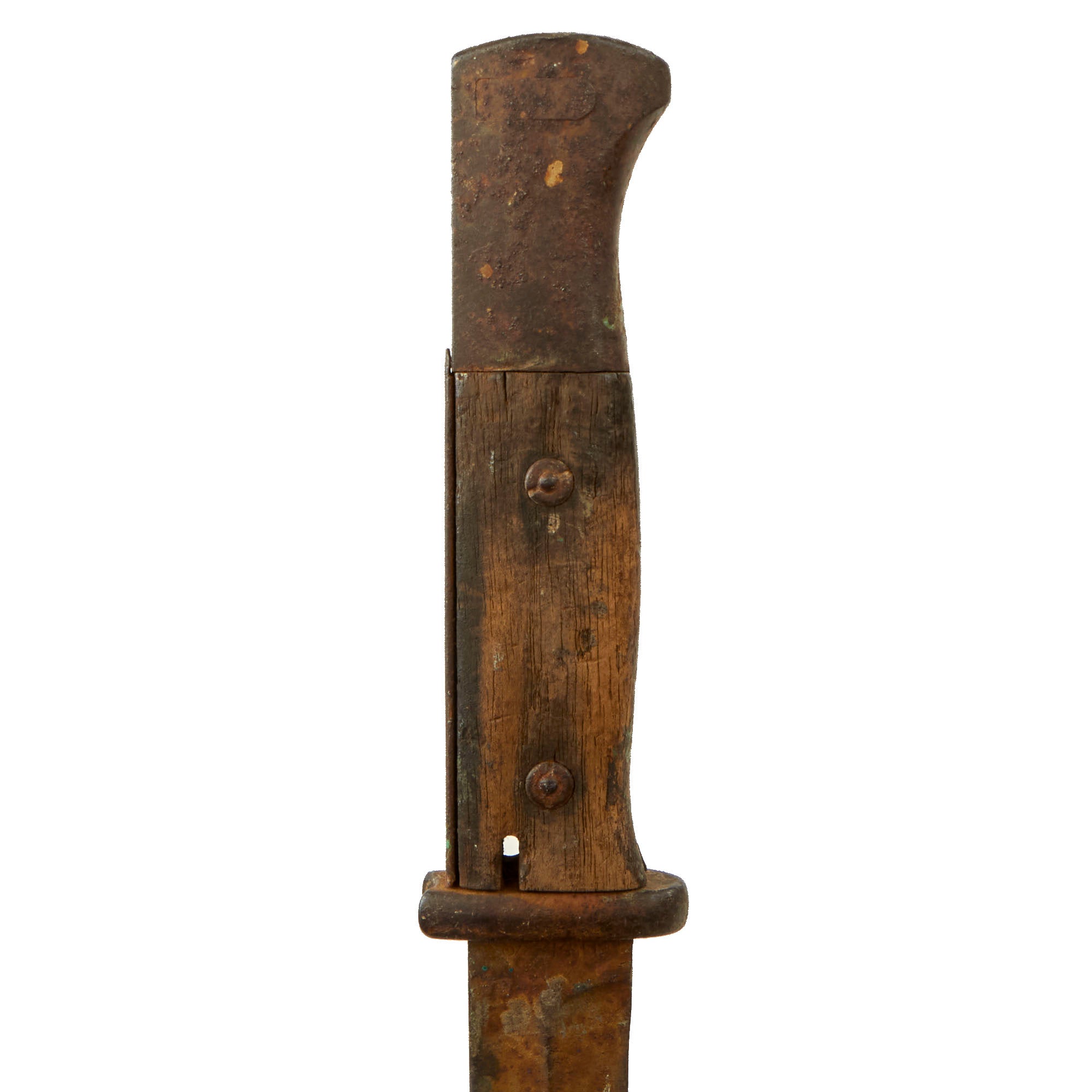 The K98 bayonet is in similar condition with a heavily worn blade that shows evidence of paint being applied and wearing away at one point. The blade ricasso retains a very faint marking, S/244G. There are no other markings we could find.