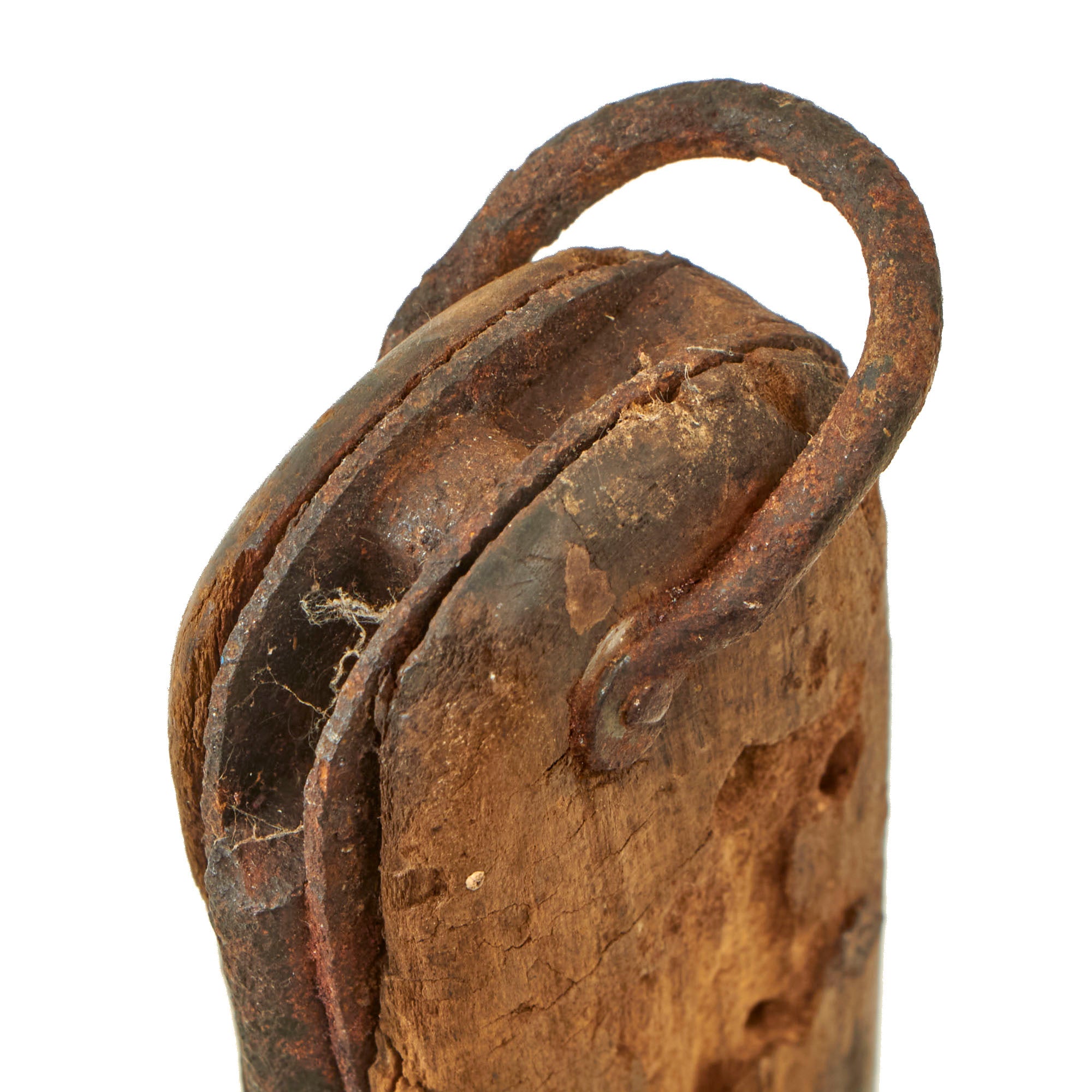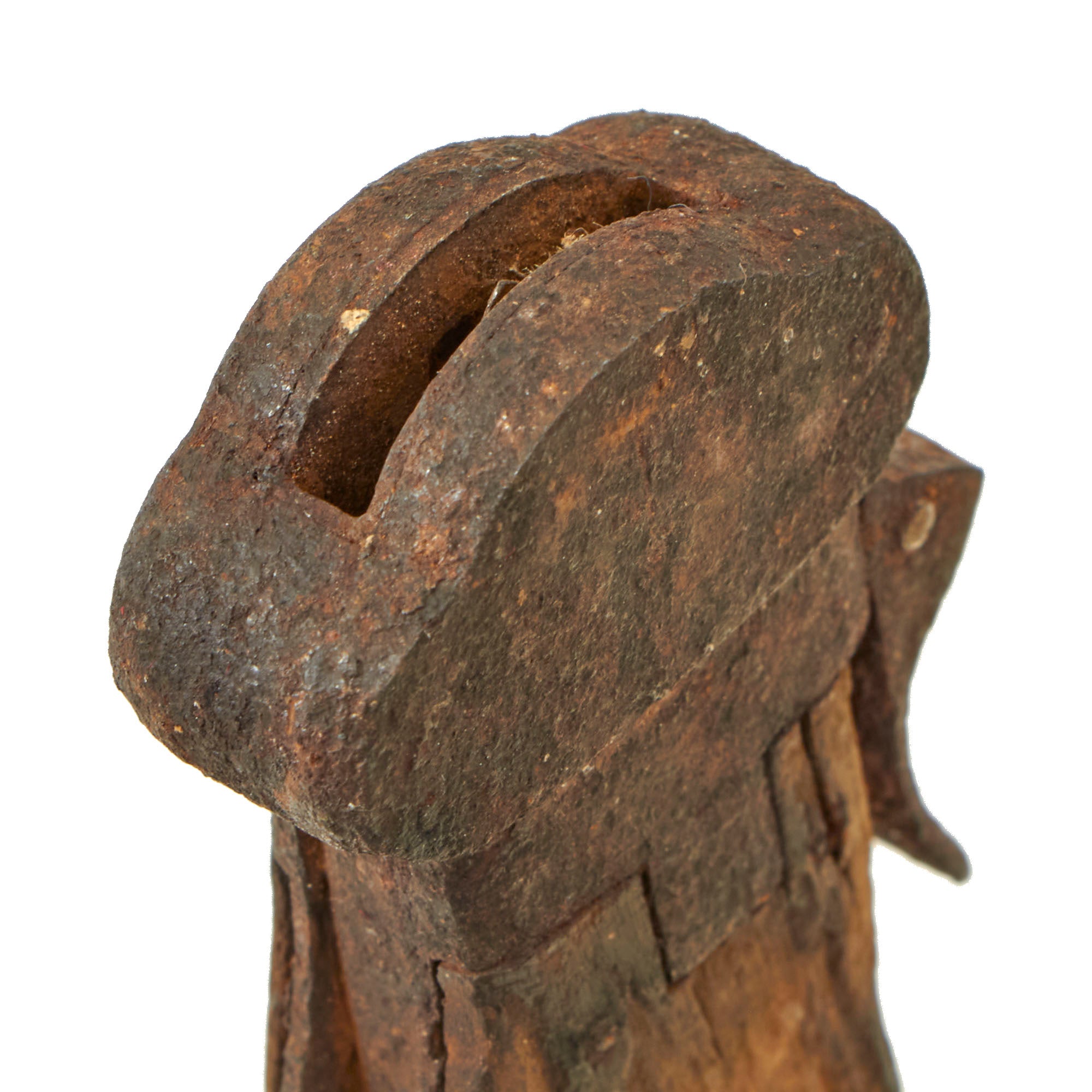 The Gravity Knife shows heavy woodworm damage on both grips, and is entirely seized in place. The blade will not come out of the knife, nor will the operating lever budge at all. The marlin spike and lanyard ring are both seized in place as well. Of note, the small stainless steel rivets on the side of the knife are still bright!