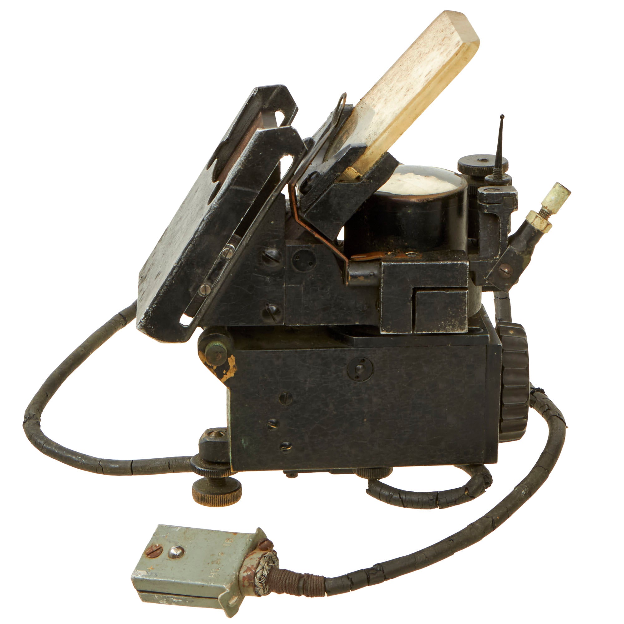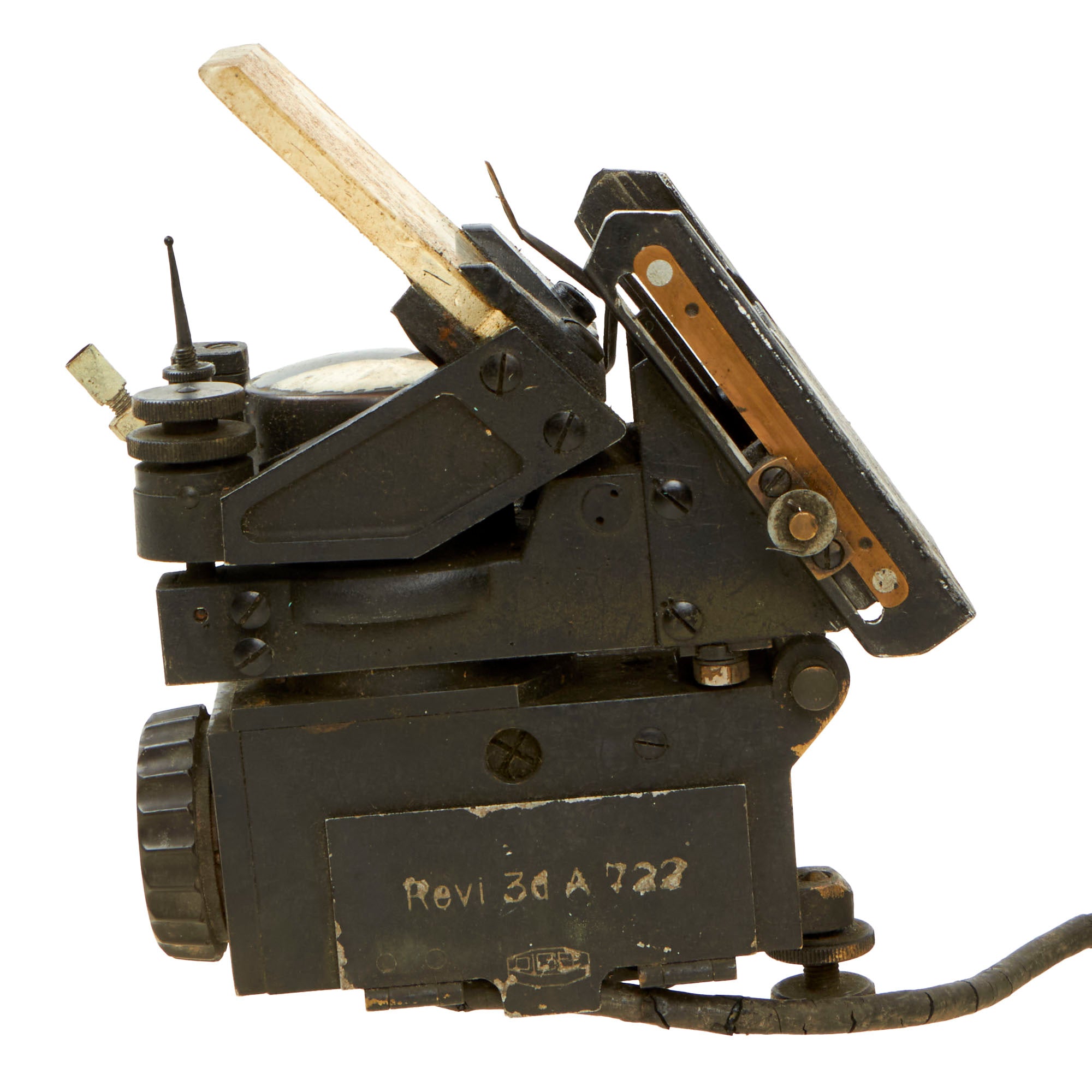 The gunsight fits snug into its spot in the case, with the small data plate on the side reading Revi 3d A722. This plate is on hinges and is the door for the bulb, which is still intact inside. The finish on the gunsight itself shows heavy cracking from age. The original electrical cord is intact but very rough, with the HL-P 16 plug still intact at the end. The end connected to the sight is very rough but still connected. The box also contains the small wrench which is kept in its corner by a small metal bracket. The original brackets for the sight are also in the box.