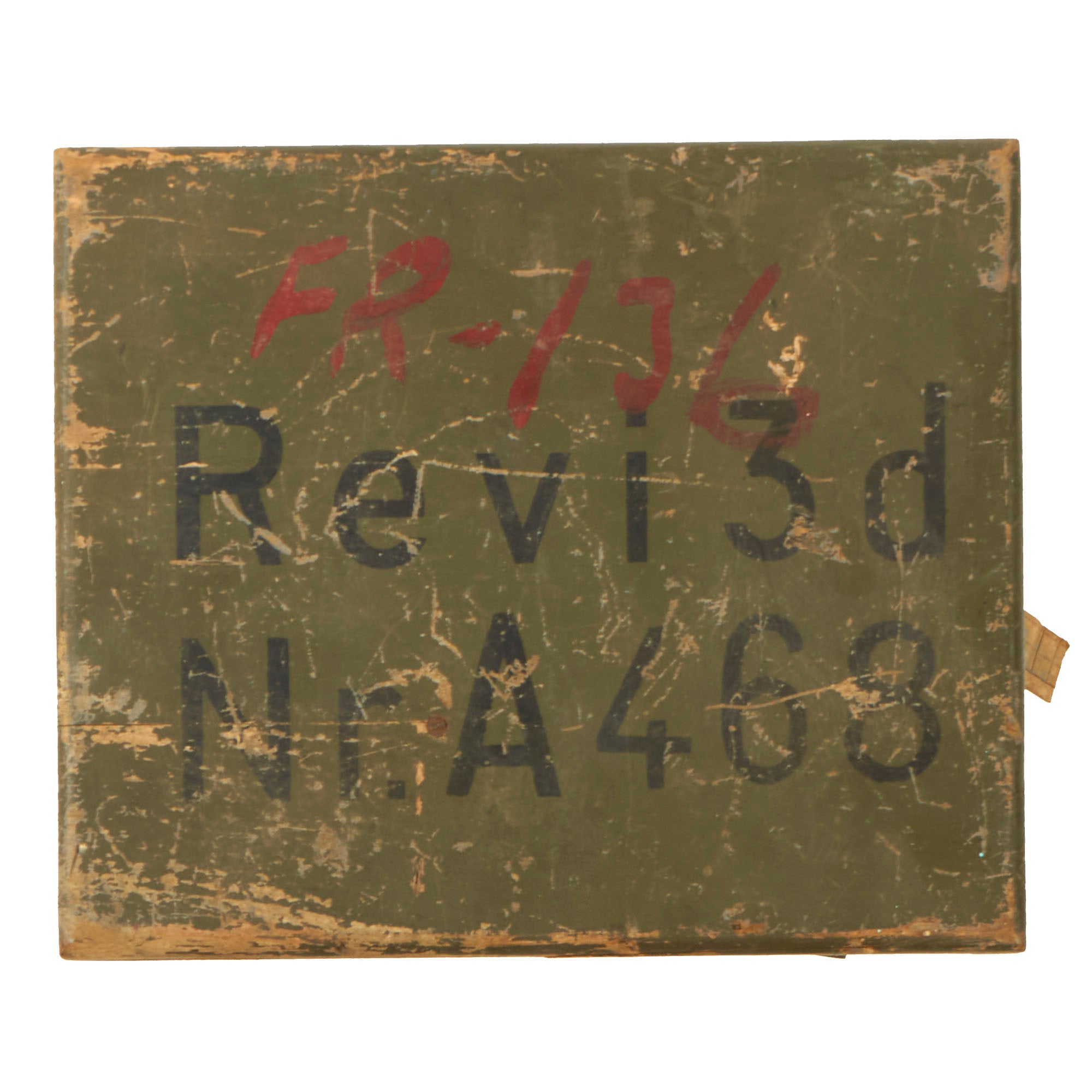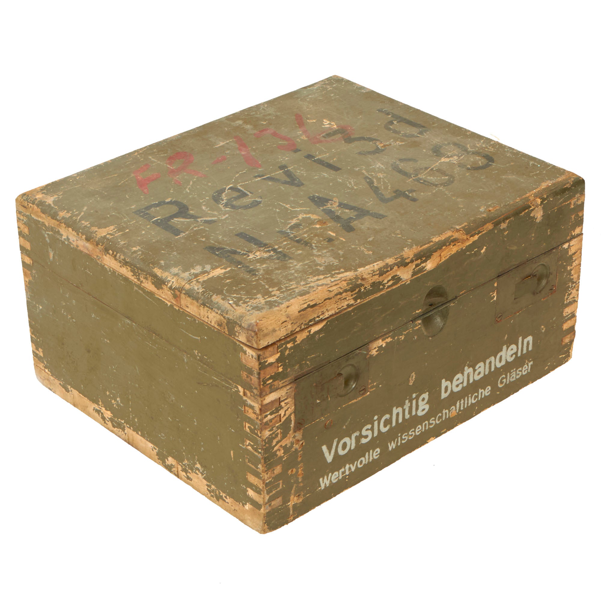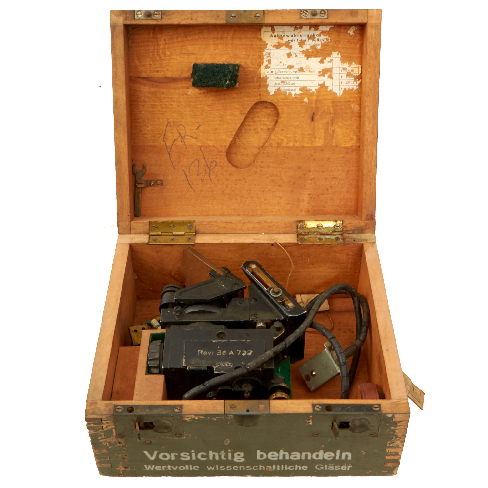 This is an extremely scarce gunsight, REVI 3d, for use in the ME-109 aircraft, the backbone of the Luftwaffe’s fighter force. The sight is in its original transit crate, which measures 11 ¼" x 9 ⅜" x 5 ¾”. The code FR-136 has been painted in red on the top of the crate, and written in pencil on the interior. This was likely an inventory number. The top of the crate reads: