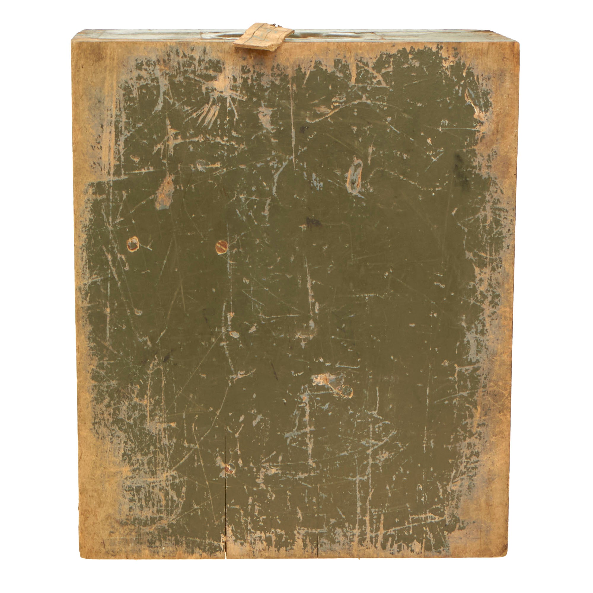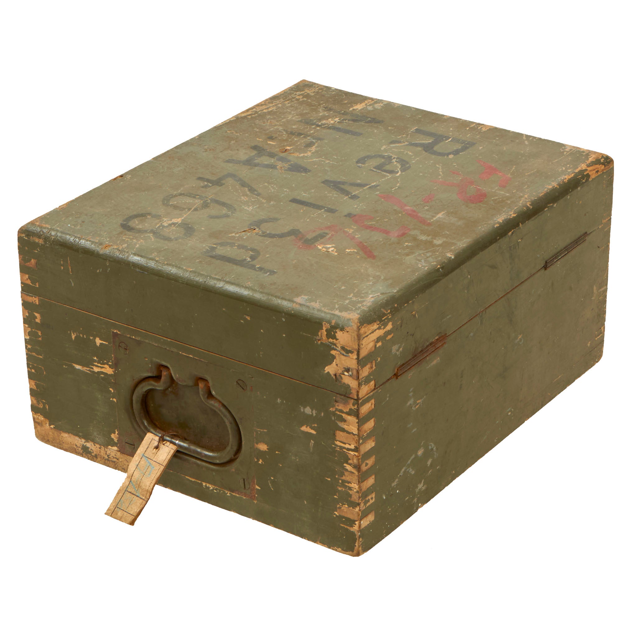 The crate has a handle on the right side for carrying. The crate retains roughly 90% of its original paint job. The two latches still work to secure the crate shut. On the interior, there is still remnants of the original data label on the lid.