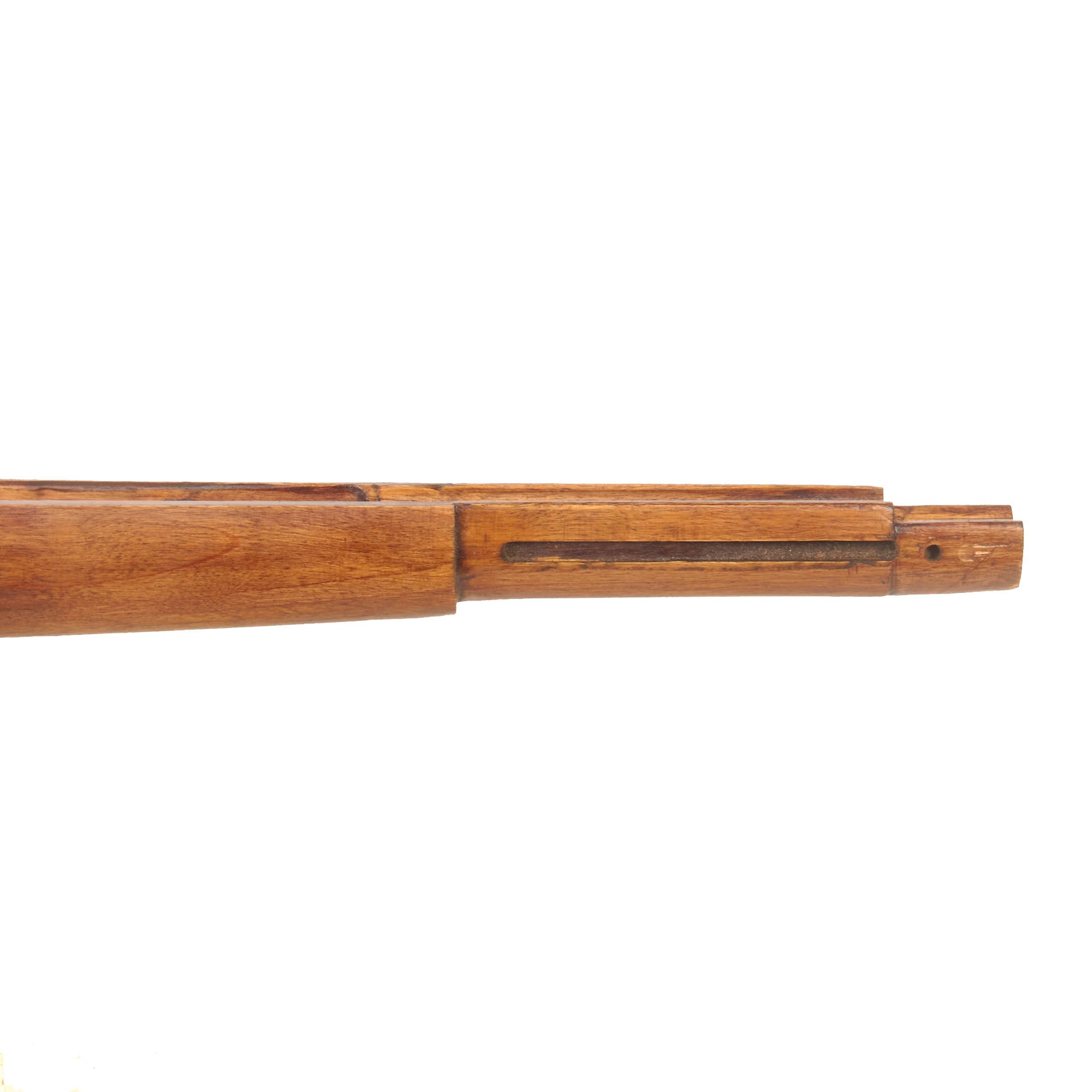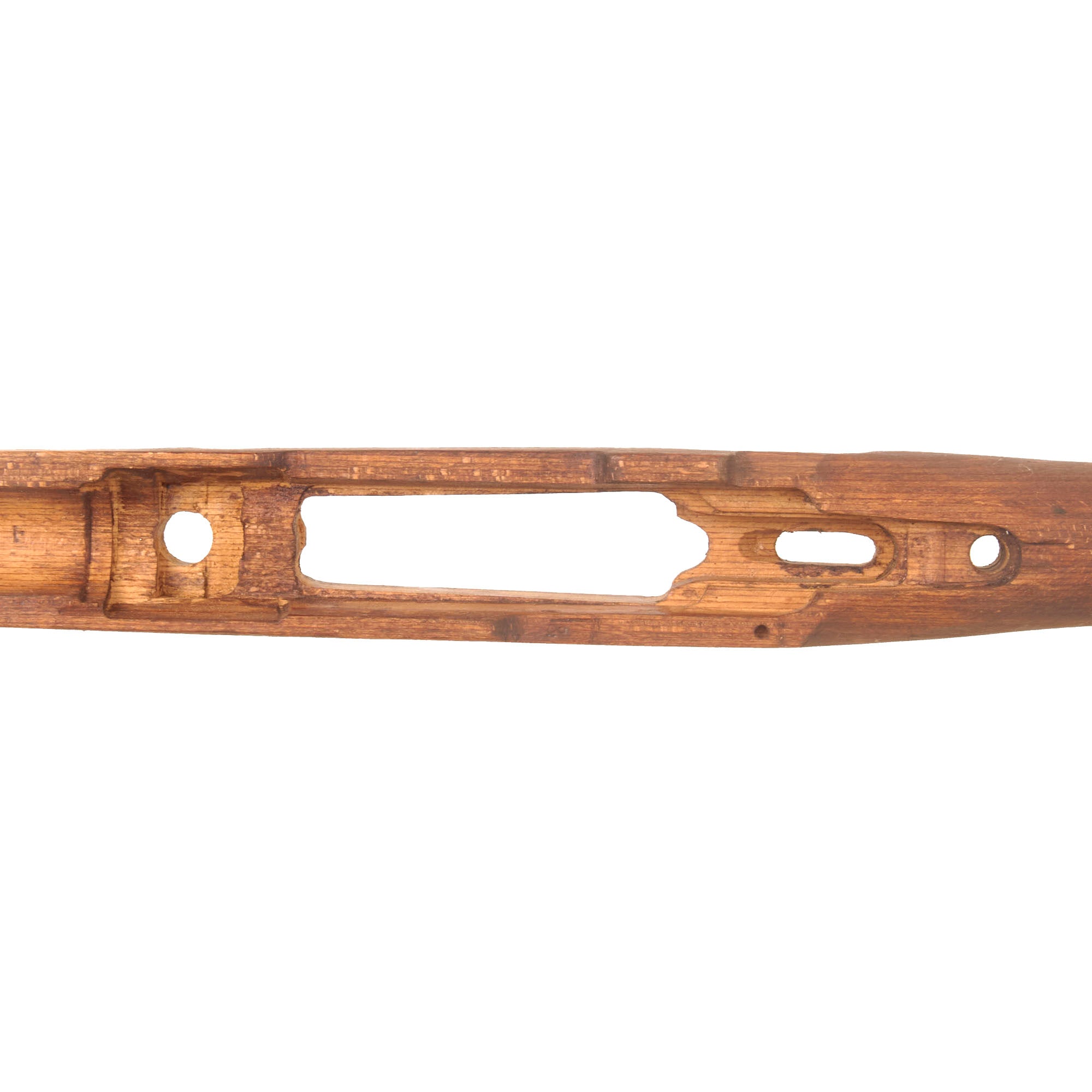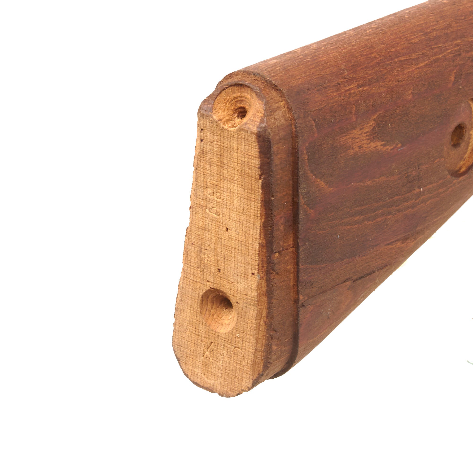 This stock is in good overall condition and has an interesting period arsenal repair near the front, which was possibly not completed, as the cleaning rod channel is plugged. This example is inlet for the larger 30mm metal fitting through the butt stock that aided in bolt disassembly in the field during cleaning (not included). There are some markings on the butt including 39 and ovx, which would indicate manufacture by Weser Sperrholzwerk GmbH, Holzminden, a supplier of plywood to the boat-building industry.