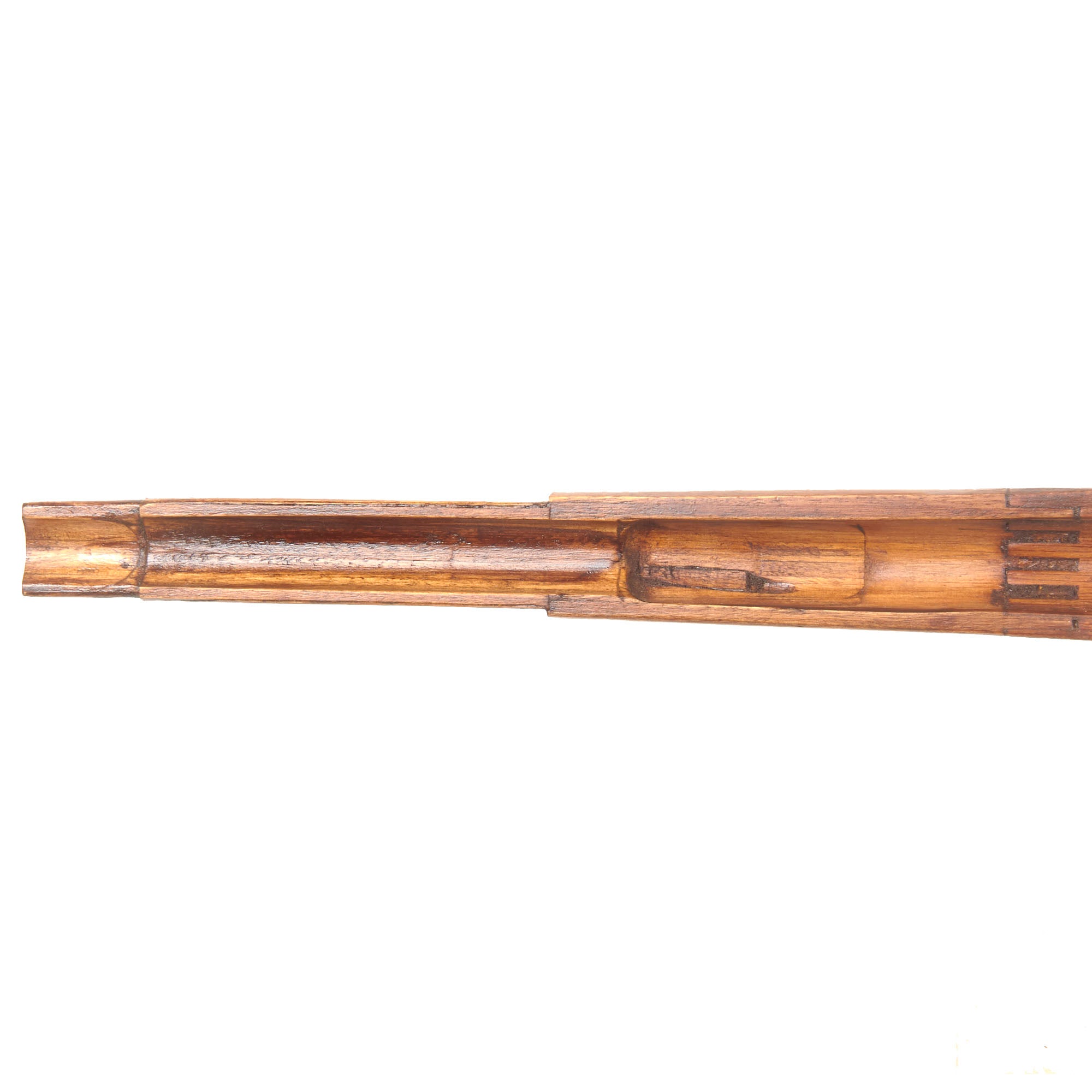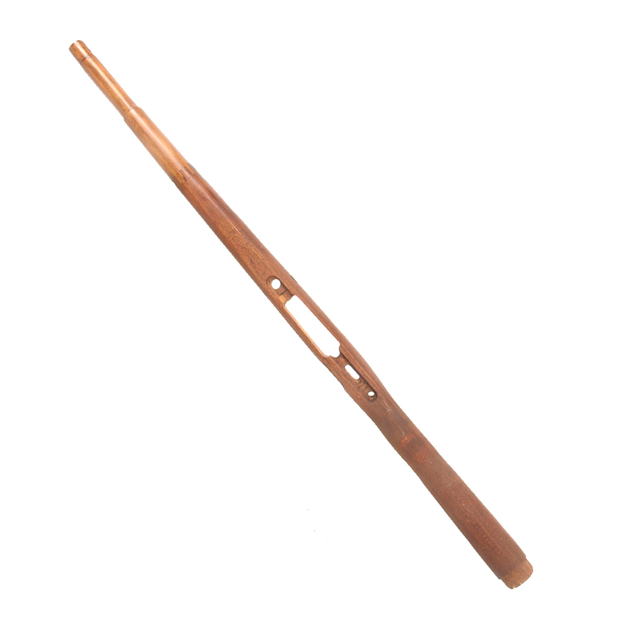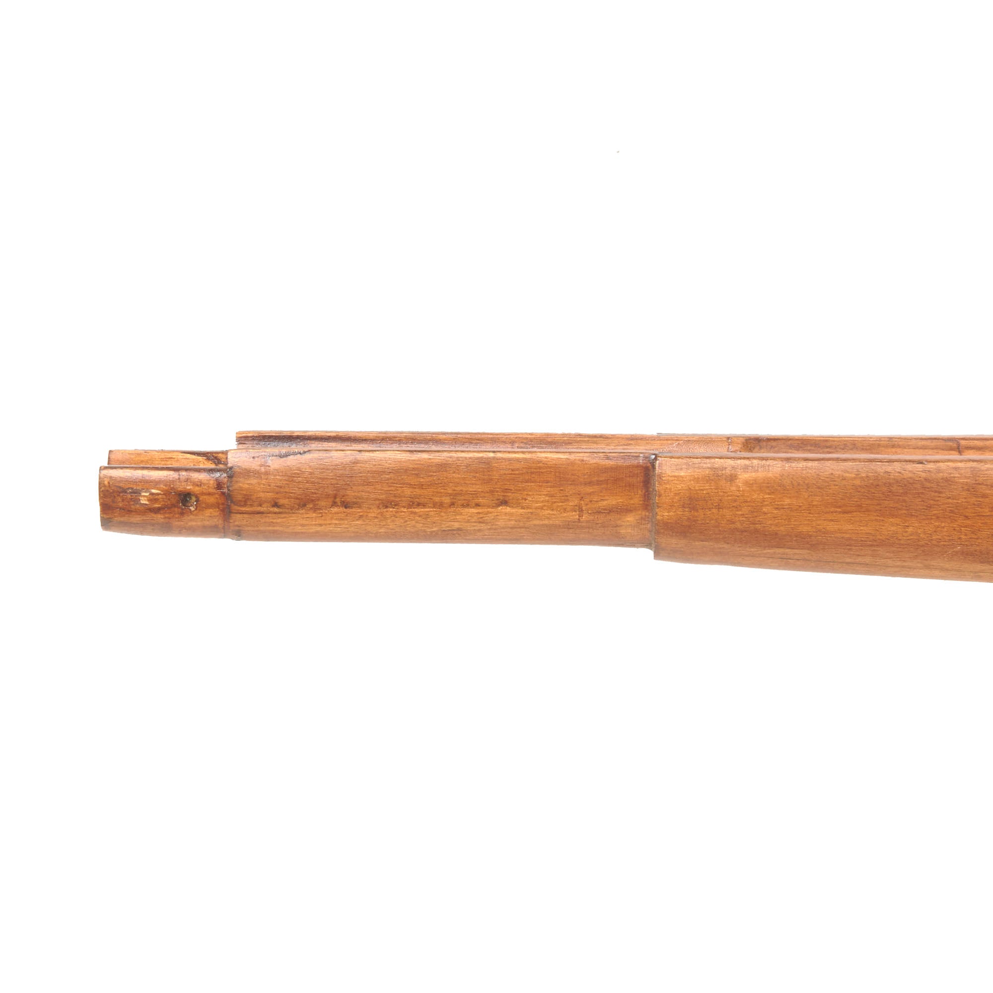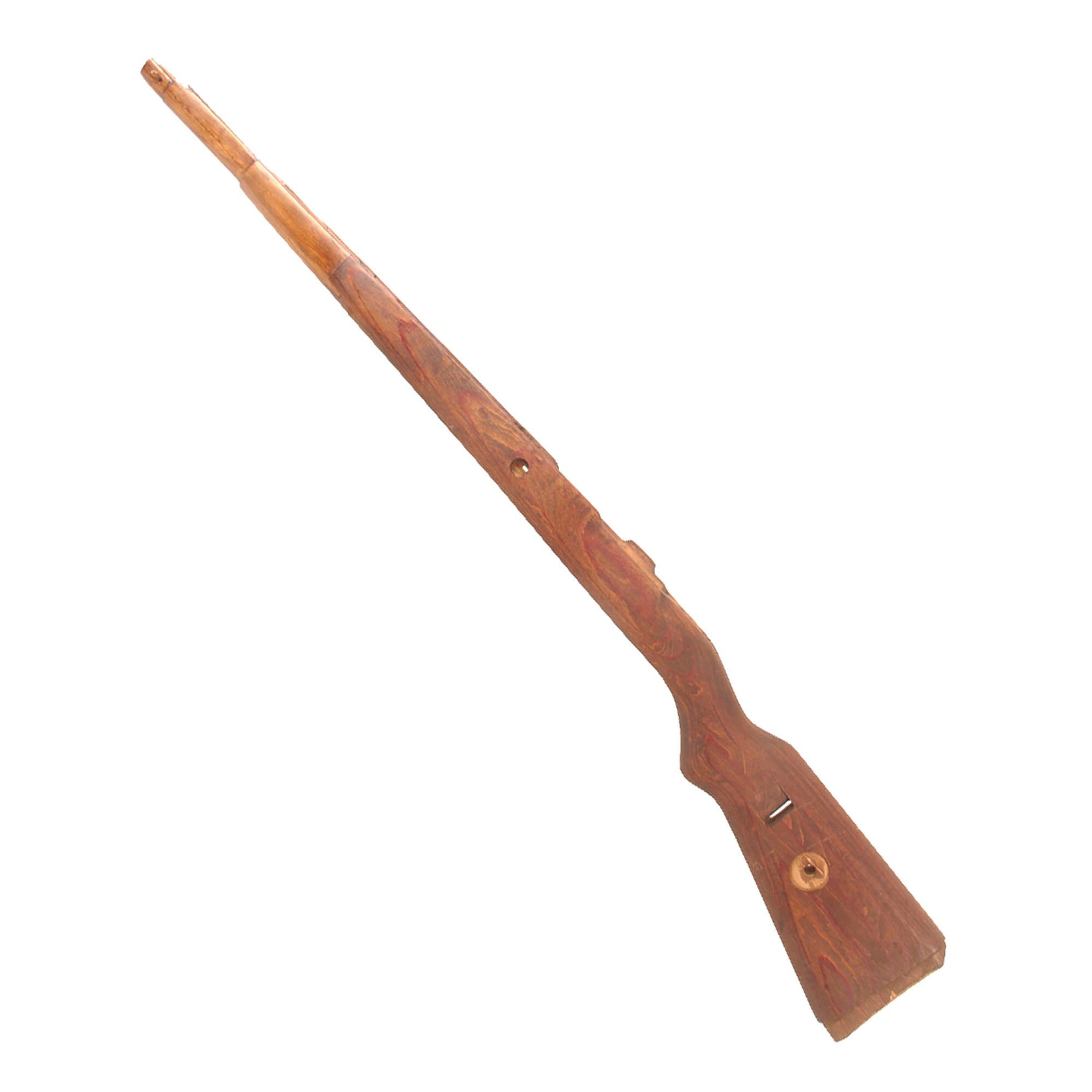 This stock is in good overall condition and has an interesting period arsenal repair near the front, which was possibly not completed, as the cleaning rod channel is plugged. This example is inlet for the larger 30mm metal fitting through the butt stock that aided in bolt disassembly in the field during cleaning (not included). There are some markings on the butt including 39 and ovx, which would indicate manufacture by Weser Sperrholzwerk GmbH, Holzminden, a supplier of plywood to the boat-building industry.