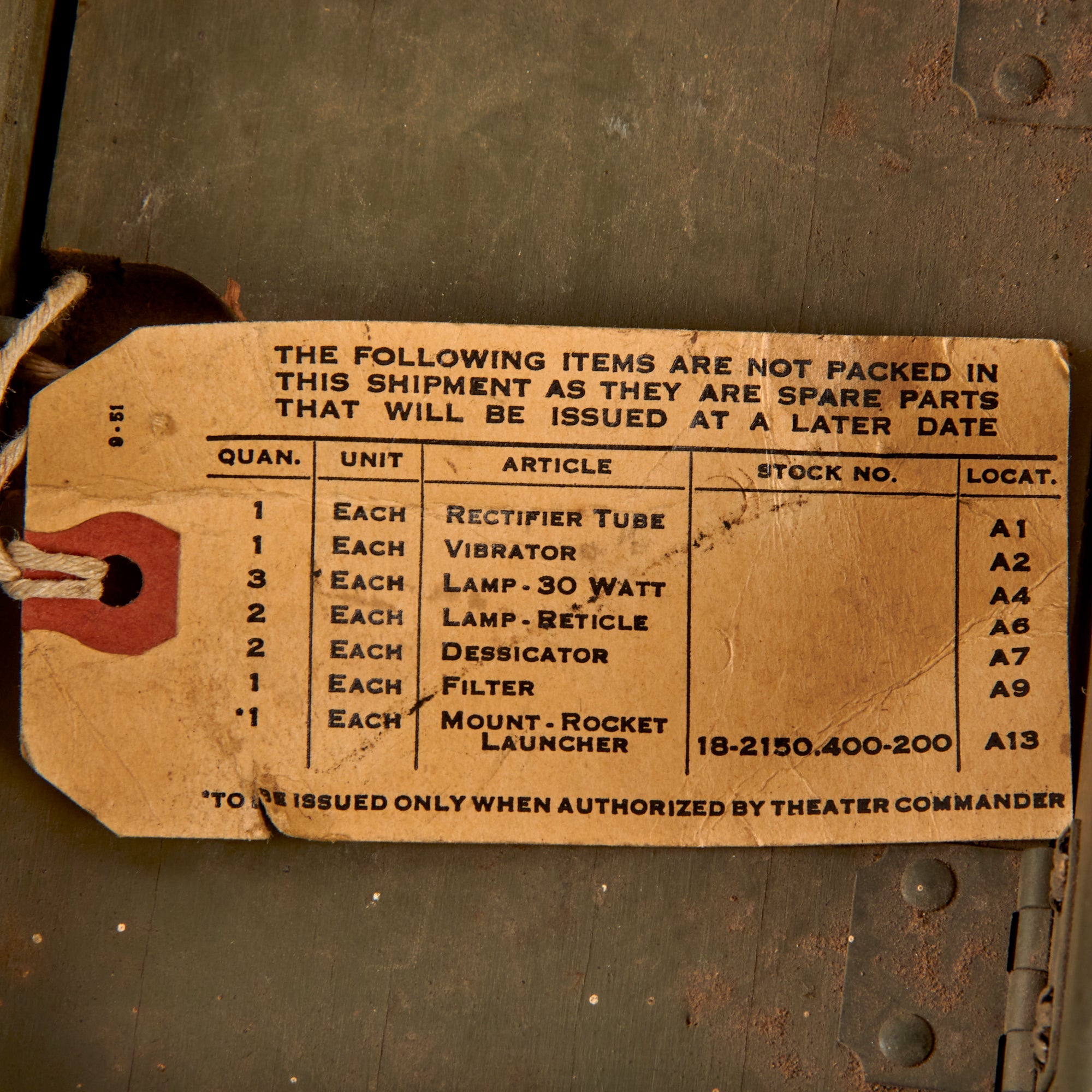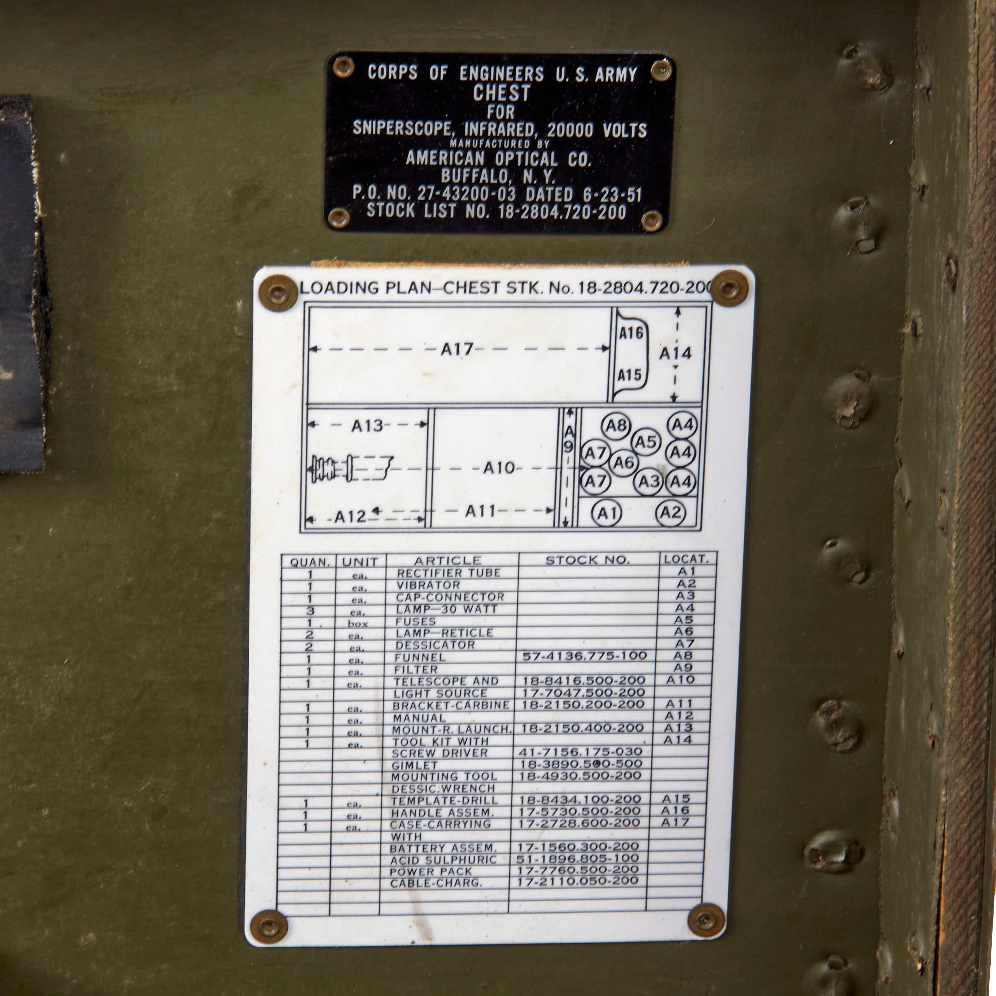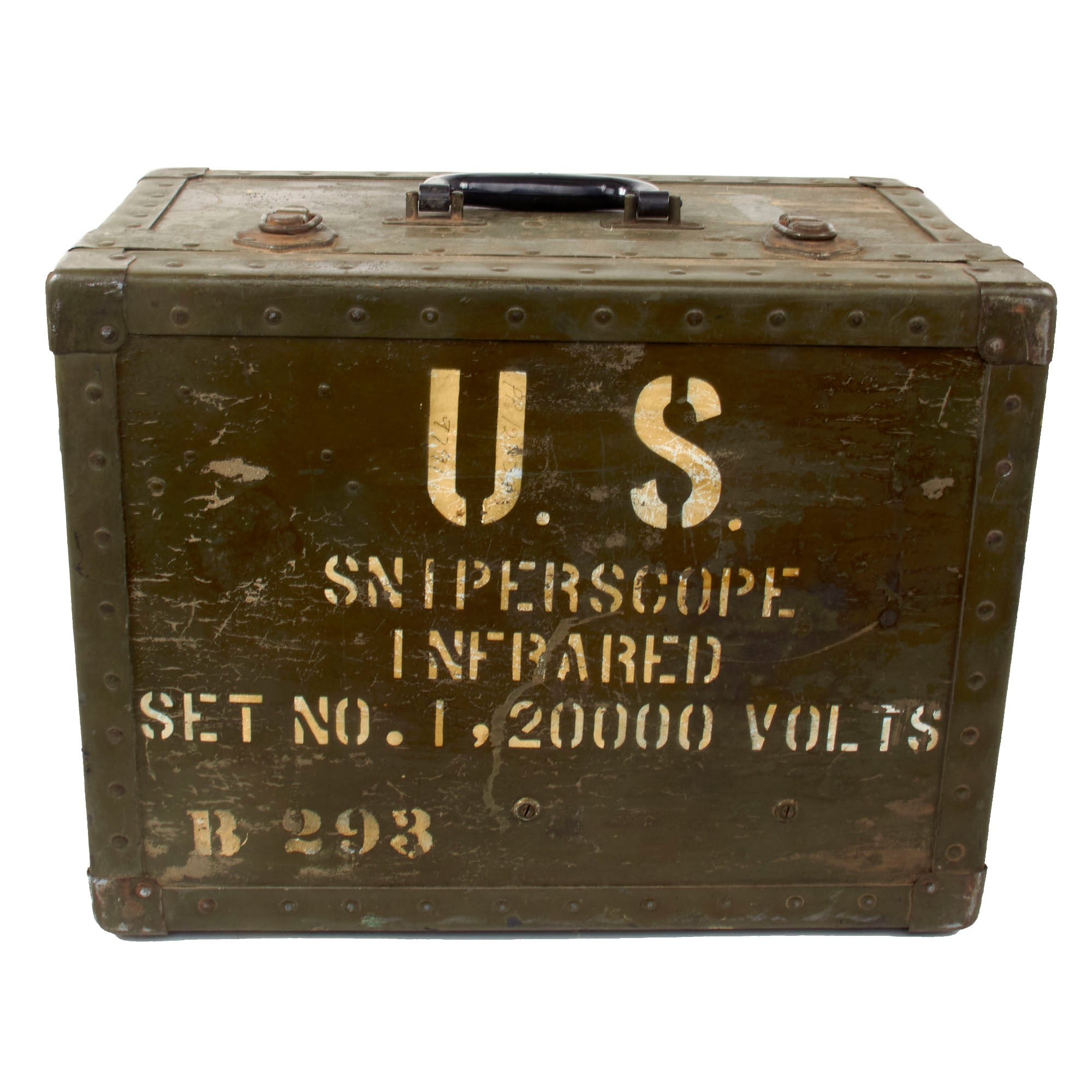 Original Item: Only One Set Available. This is a rare, mostly complete infrared sniper scope for the M3 Carbine. The set comes complete with the sight, wood transit chest, battery, rubberized carry case, spare bulb, and other parts. There are no manuals in the set. We are not sure about the functionality of the set. There are some pieces that may be broken, but the spare bulb is in great shape, and looking through the scope, you can see a faint red light. The small compartment with all the small accessory pieces is empty. This is a set that requires some work.
