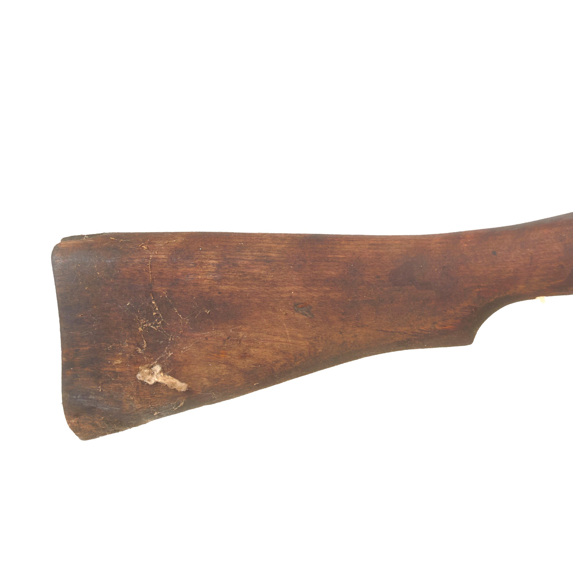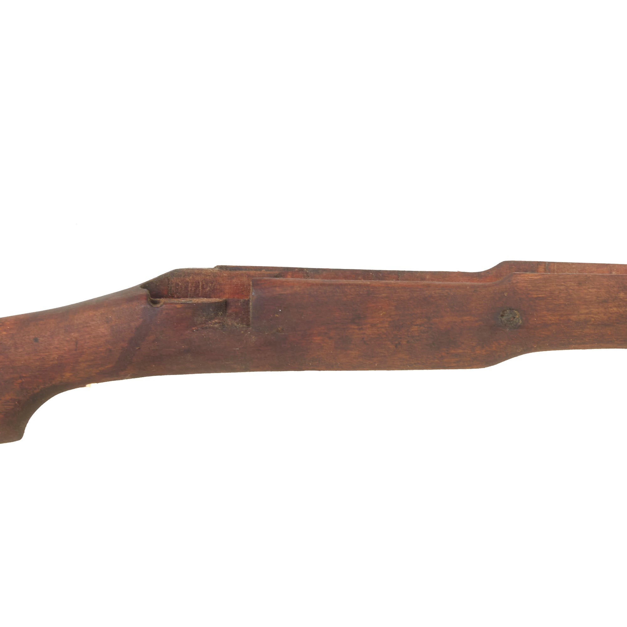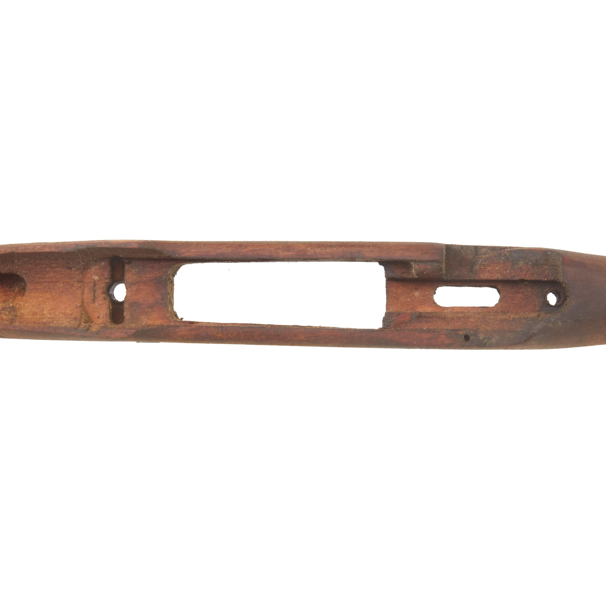 This is a very nice lower stock for a U.S. M1917 Enfield rifle, offered in good surplus condition. It has been stripped of all metal components and fittings except for the trigger guard screw sleeves, cross screw and slotted nut in front of the receiver, and the two cross pins, one by the barrel band, and one at the rear of the receiver area. The only marking we can see is what appears to be a letter E on the front of the nose.