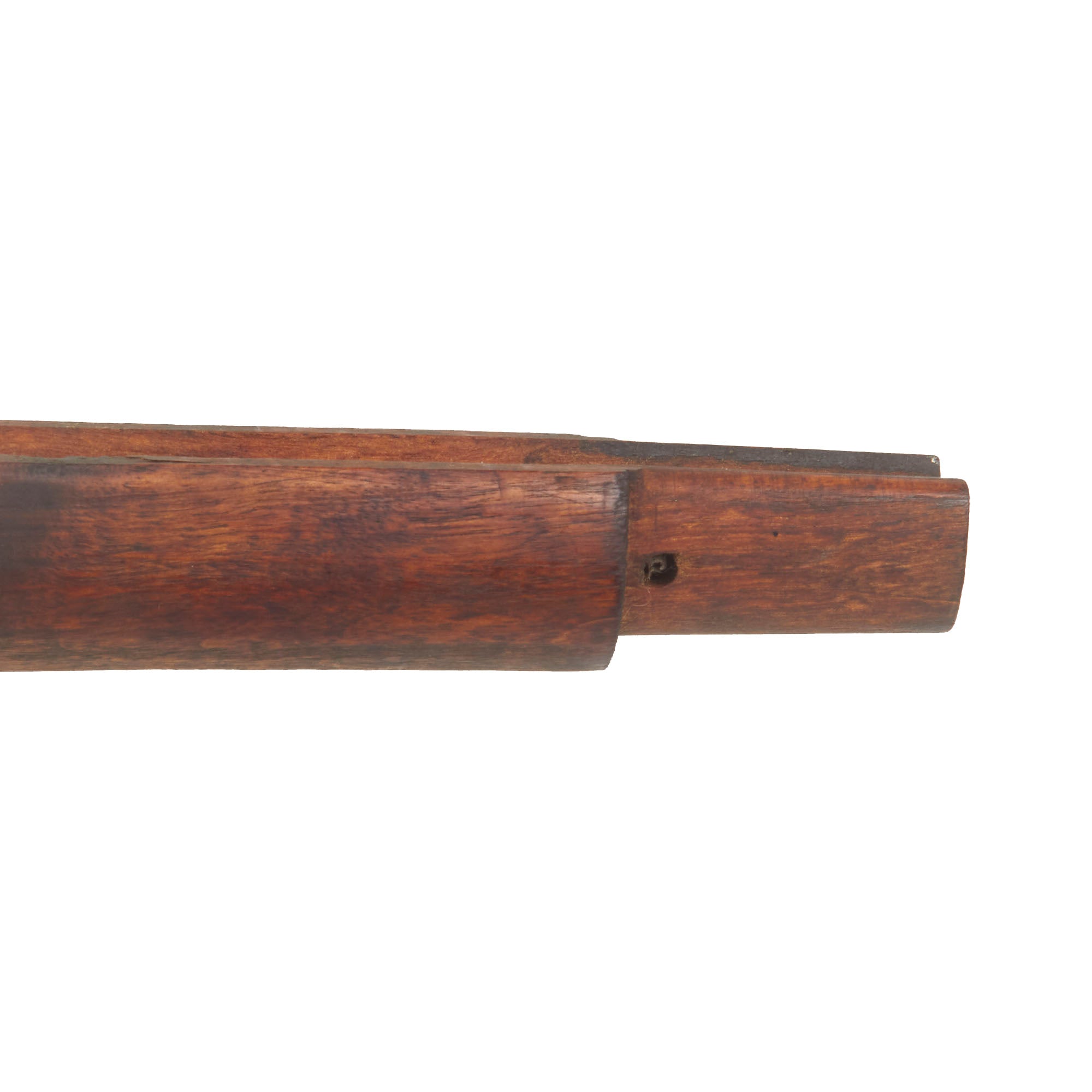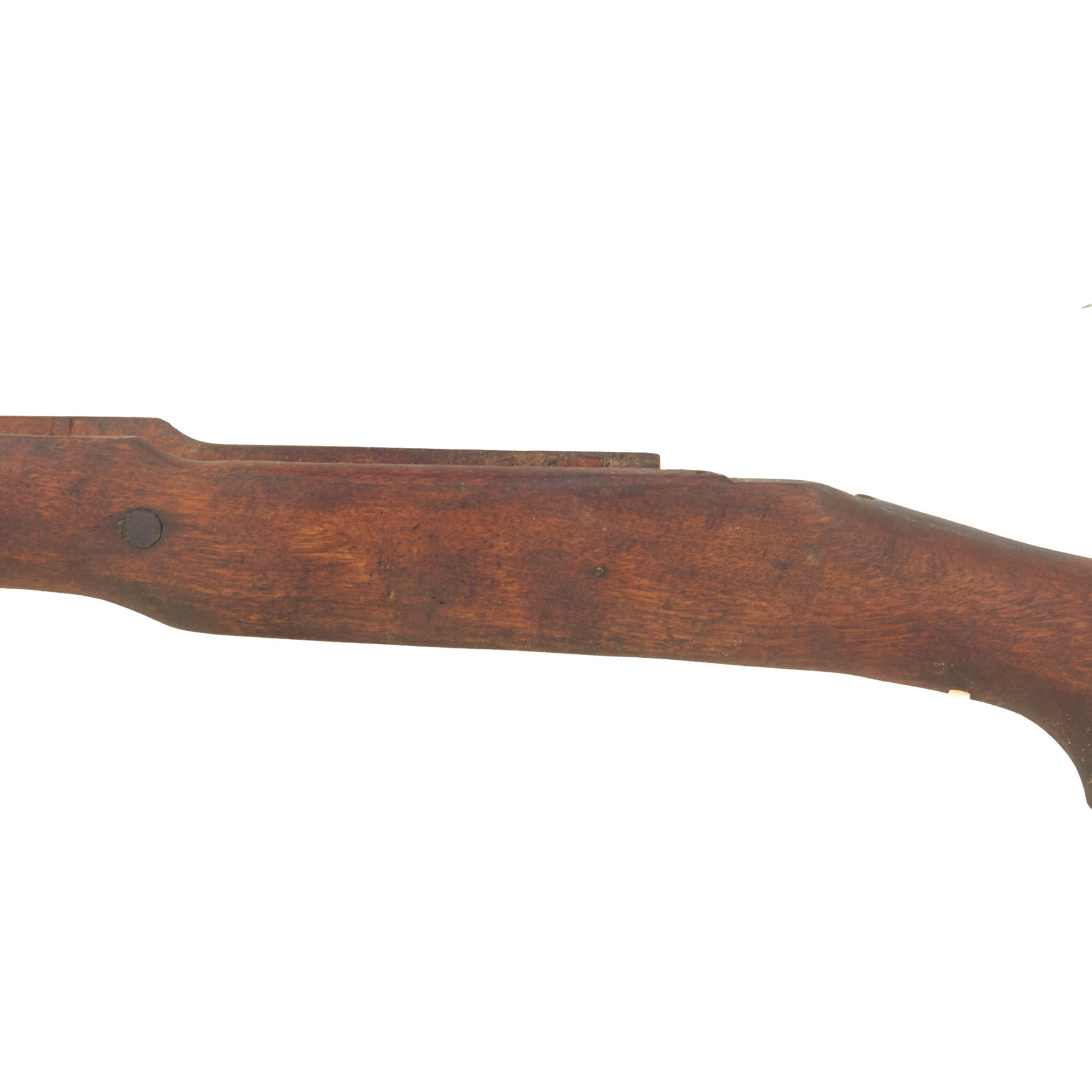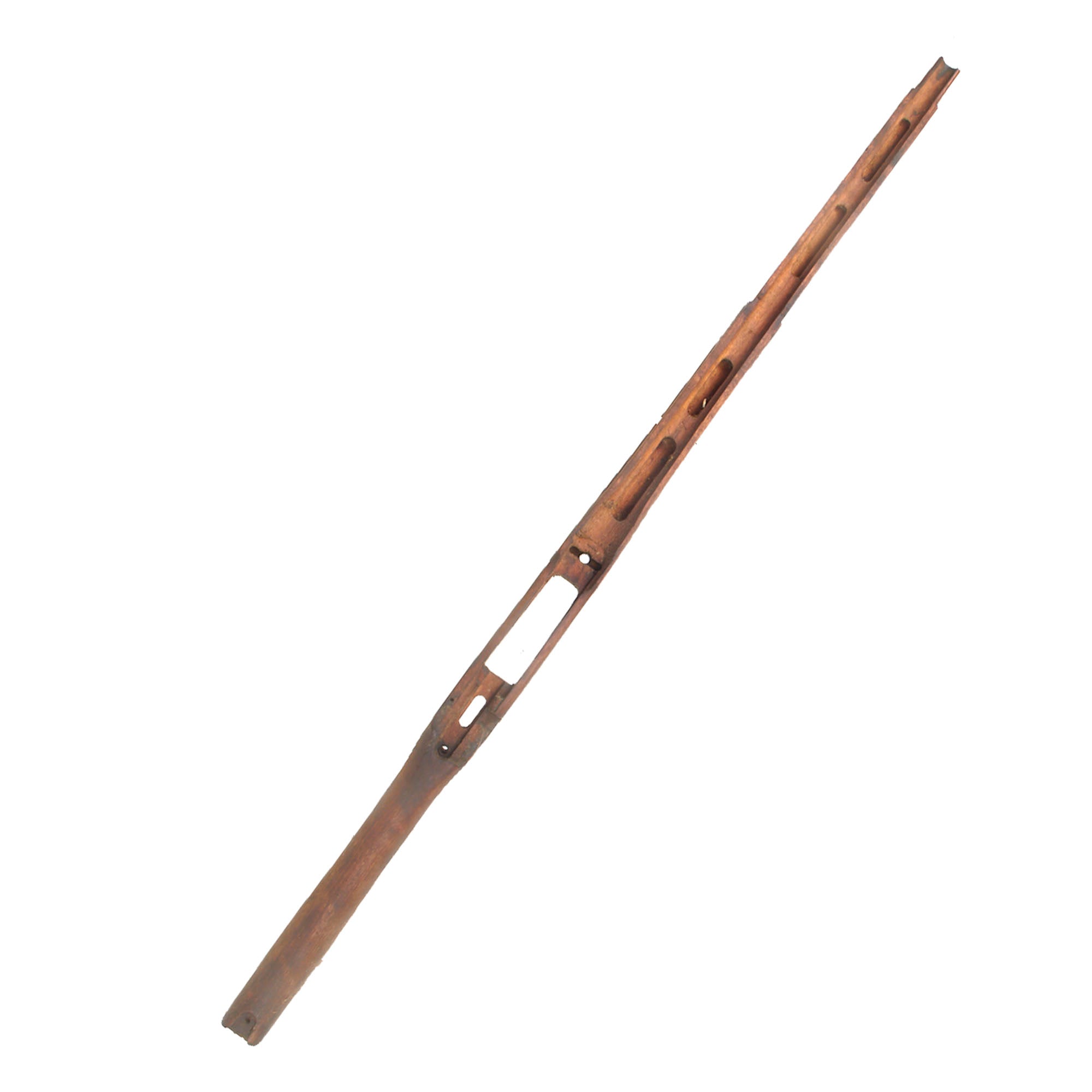 This is a very nice lower stock for a U.S. M1917 Enfield rifle, offered in good surplus condition. It has been stripped of all metal components and fittings except for the trigger guard screw sleeves, cross screw and slotted nut in front of the receiver, and the two cross pins, one by the barrel band, and one at the rear of the receiver area. The only marking we can see is what appears to be a letter E on the front of the nose.