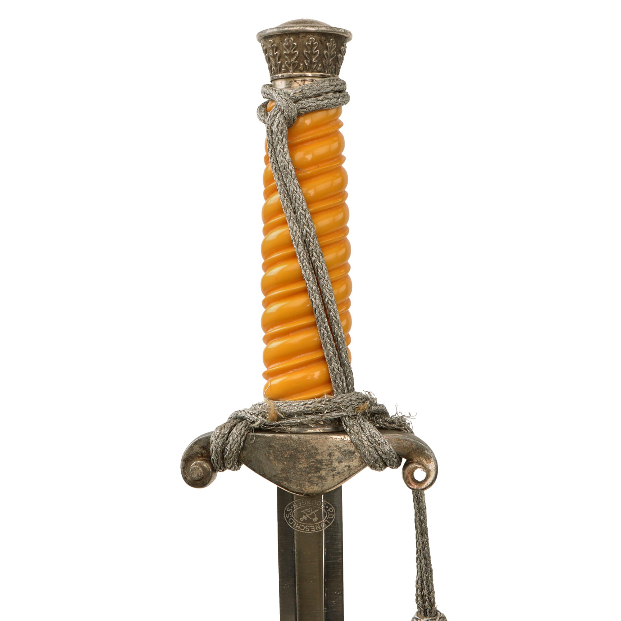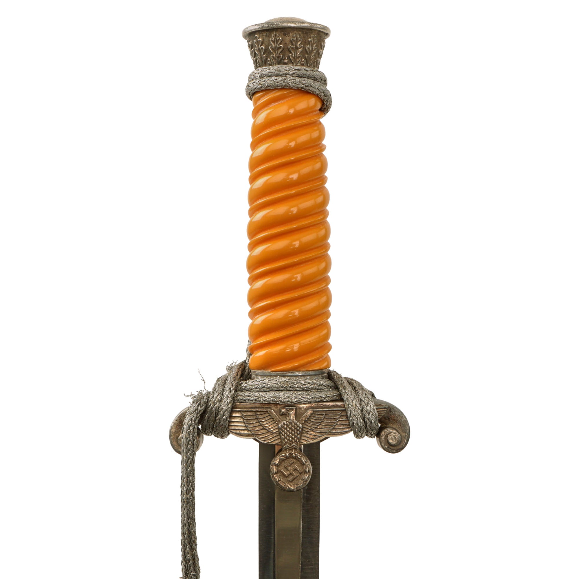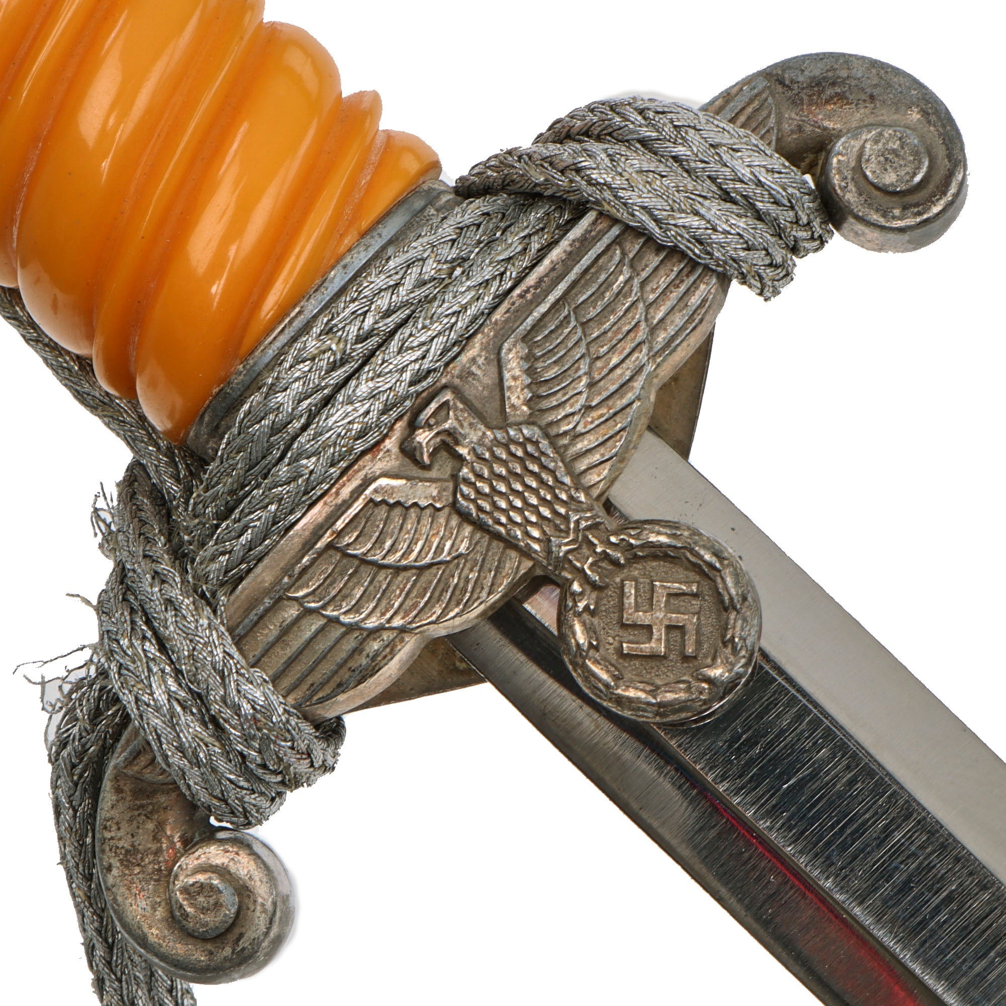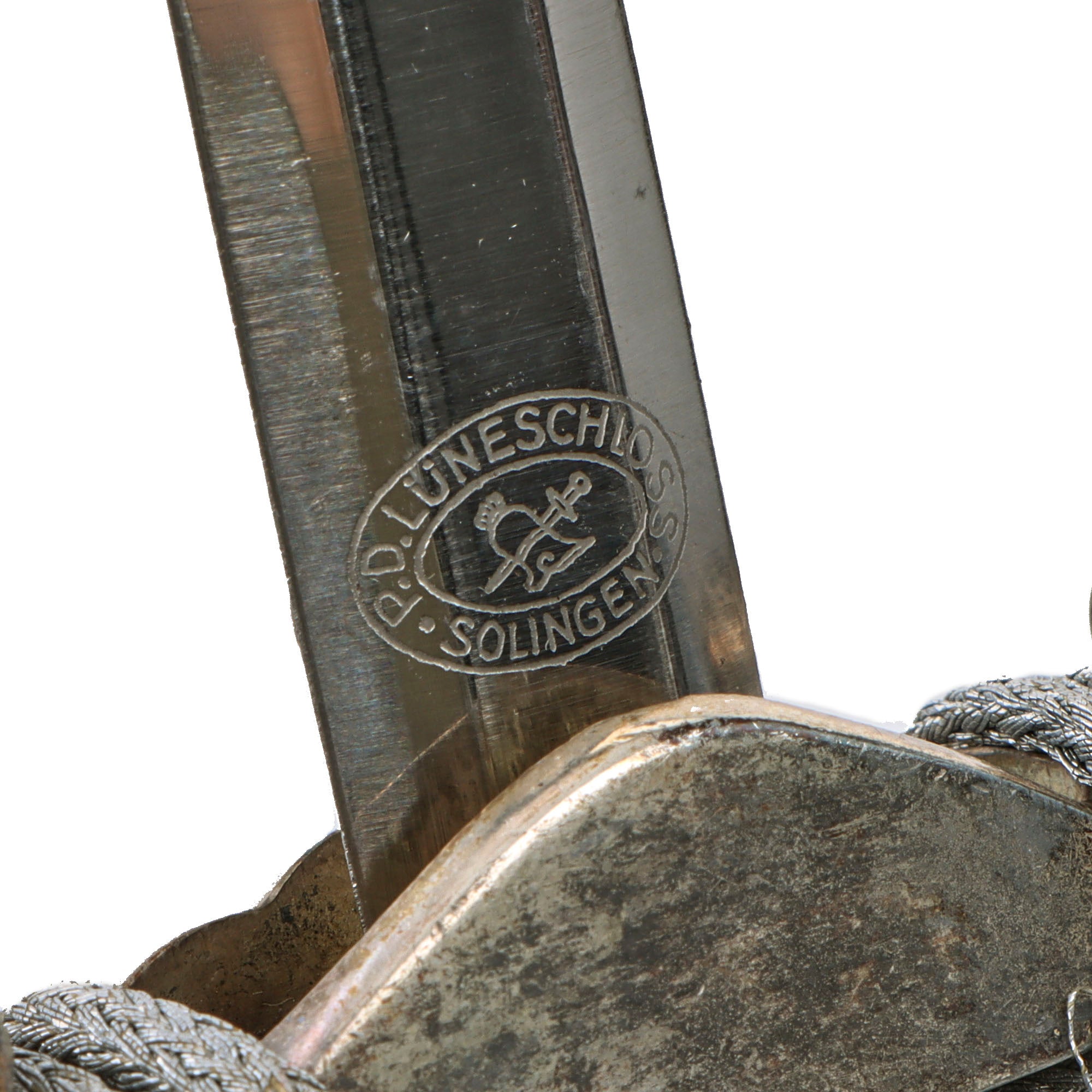 • Original Item: Only One Available. This is a beautiful condition Army Officer's Dagger, produced by the well-known Solingen-based firm P.D. Lüneschloss. complete with its original scabbard, hanger, and portepee knot. The fittings on this dagger look to be plated alloy, probably zinc or aluminum, and the finish is very well retained, so we cannot say for certain their composition.