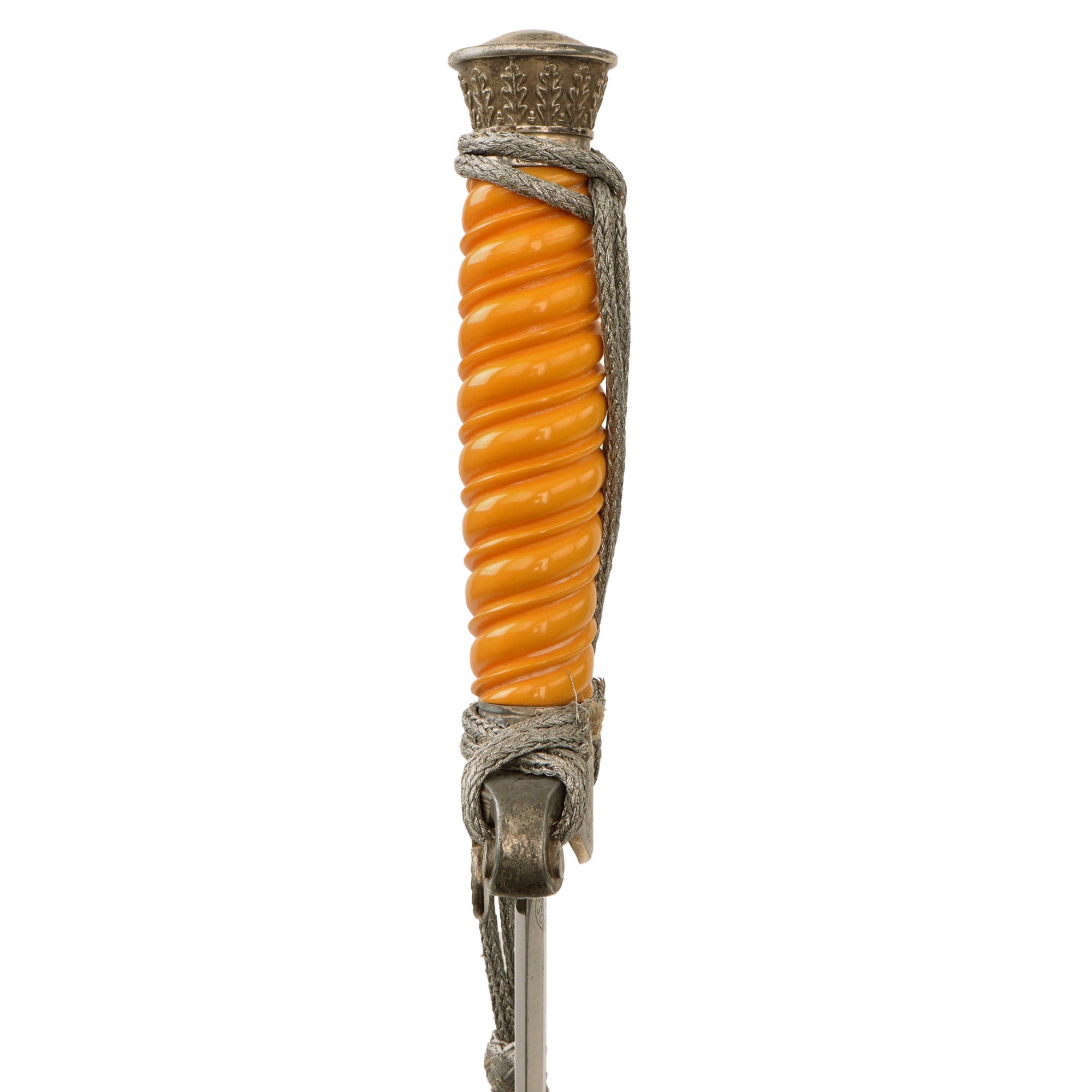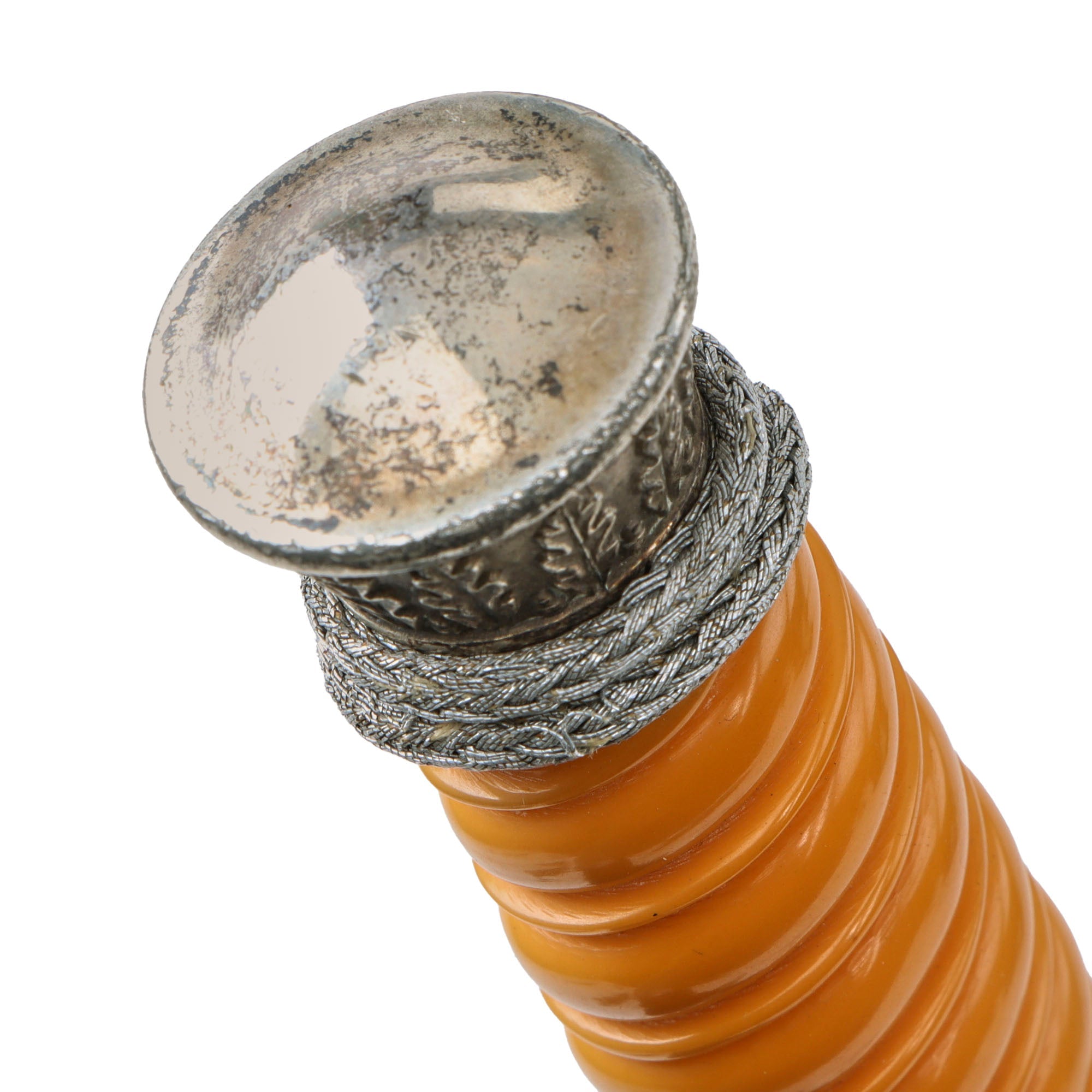 The crossguard looks to be made in the same way, with plating over the alloy, which is still very well retained, but showing just a bit of wear on the sharp edges. The details throughout the characteristic eagle are exceptional throughout the head, breast and wing feathering, talons and wreathed mobile swas. The back of the guard does show some more advanced oxidation and plating loss. The plated steel grip ferrule looks great, with all the details still present, has had some of the plating wear off. The grip on this example is celluloid over a wood base, and has faded to a lovely amber color due to light exposure. It shows just a bit of antiquing in the grooves, and there are no dents, chips, cracks, or other damage. Really a great grip here!