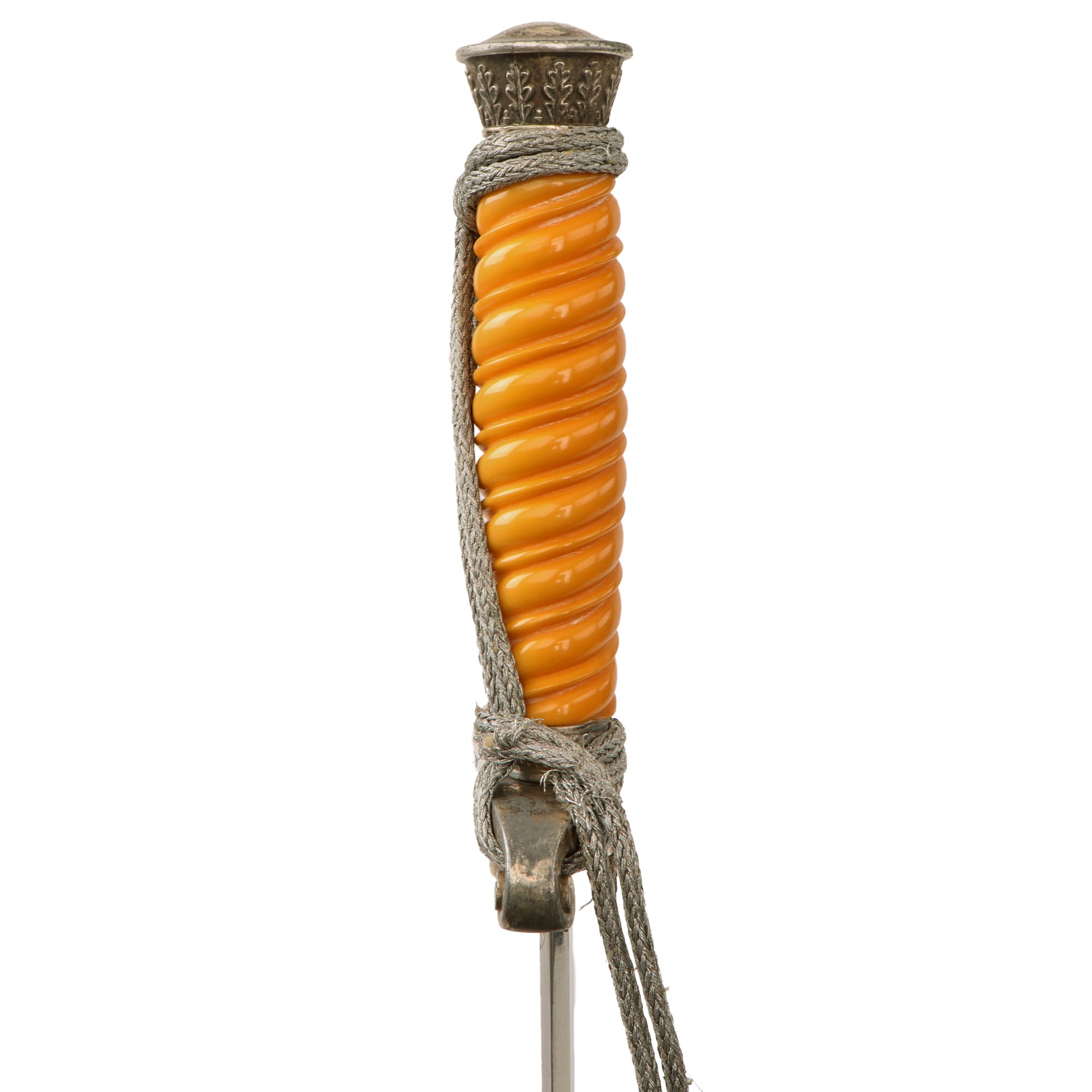 Wrapped around the grip and cross guard is an original aluminum bullion thread portepee (sword knot), tied in the Heer fashion. It shows a bit of light wear and fraying to the cord, but overall is in very good condition.
