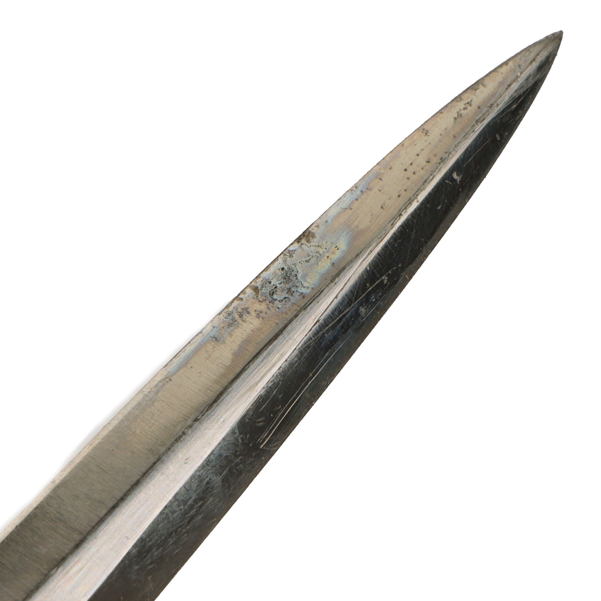 The blade on this example is in excellent condition, still showing the factory final polish grind cross grain strongly throughout the blade. This texture is iconic, and is the definitive identifying characteristic for a real WWII German Blade. Aside from the usual runner wear, there is very little wear on the blade, though it does show spots of past oxidation staining on both sides close to the tip. The needle-like tip is still intact, with no bending, and the edge is still nice, with no chips or sharpening. The leather blade buffer is still present in the recesses of the guard.