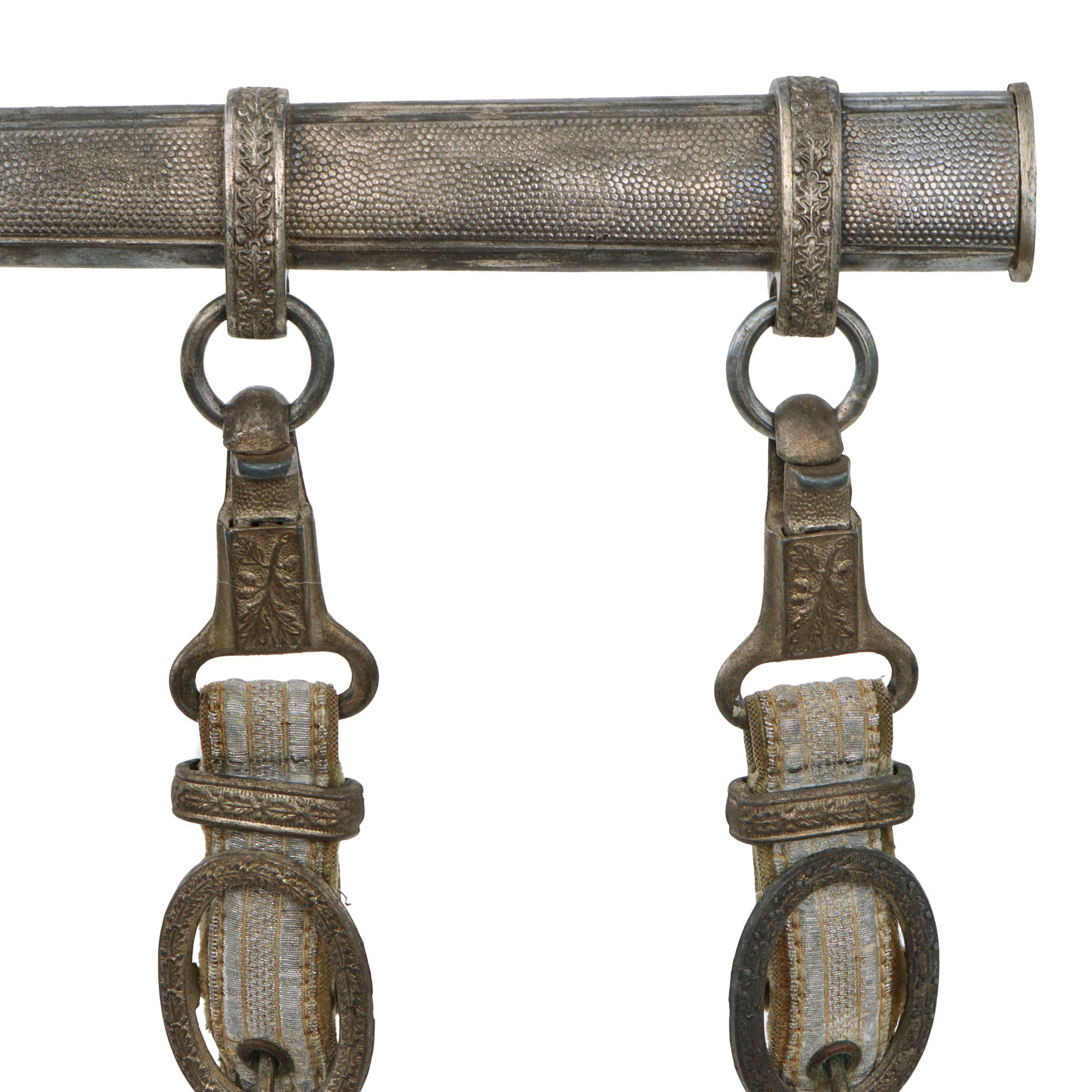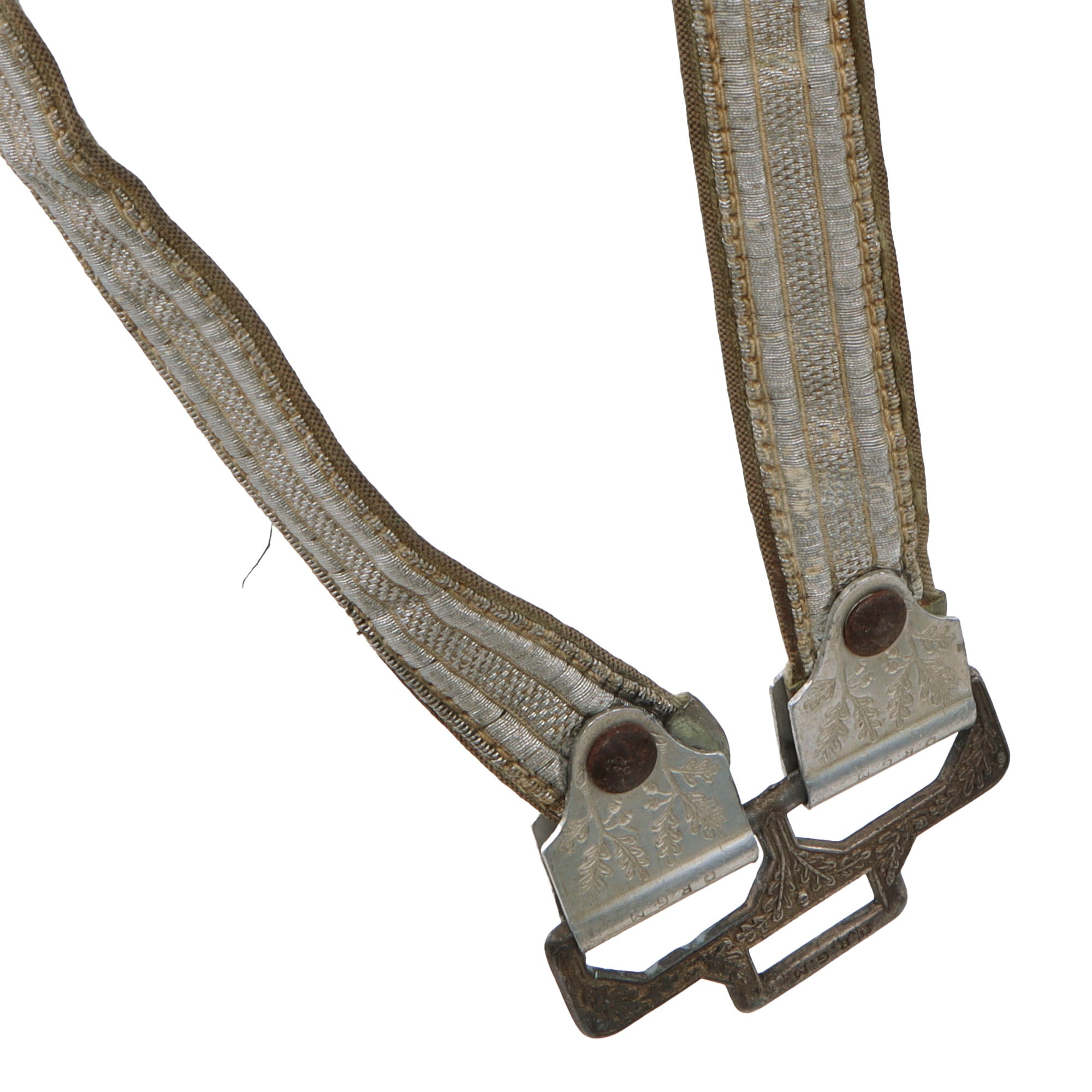 Attached to the scabbard is a very good condition belt hanger, with functional pebbled spring clips with a great patina. The buckles and keepers are engraved with the same oak and acorn motif seen throughout the dagger. The clips are the more desirable "sliding" type, both marked D.R.G.M. on the back, indicating it is a trademarked design. The original plating on the zinc alloy fittings is still partly retained, with some remaining bright, while other areas have tarnished. The straps are in very good condition, showing the bullion on the front well, and the velvet plush material on the reverse is well retained, showing light wear. There is some age to wear and fraying to the edges of the straps.