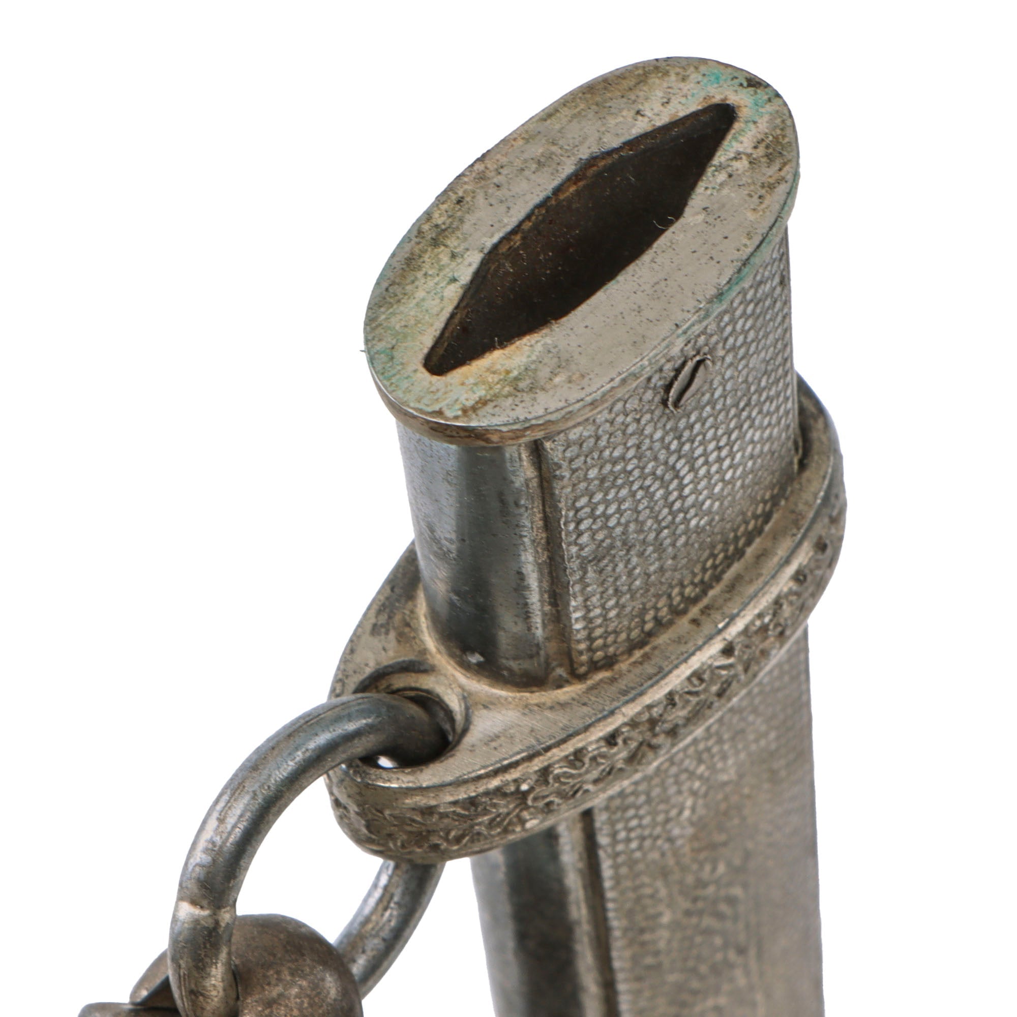 The scabbard is a very good example, made from high quality nickel plated steel, and showing no dents or bends to the body. There is now oxidation and wear to the plating, particularly on the sides, which now show the steel base metal. This scabbard has very crisp, finely pebble grained panels, and the carrying bands have a very nice overlapping oak and acorn motif, a common design seen on German edged weapons. They look to be made from tombak alloy, only used on early examples, and they have lost some of their original plating and also show wear to the acorn design. The throat is the thinner style, and was originally secured with a single flush-mount screw on the rear of the scabbard.