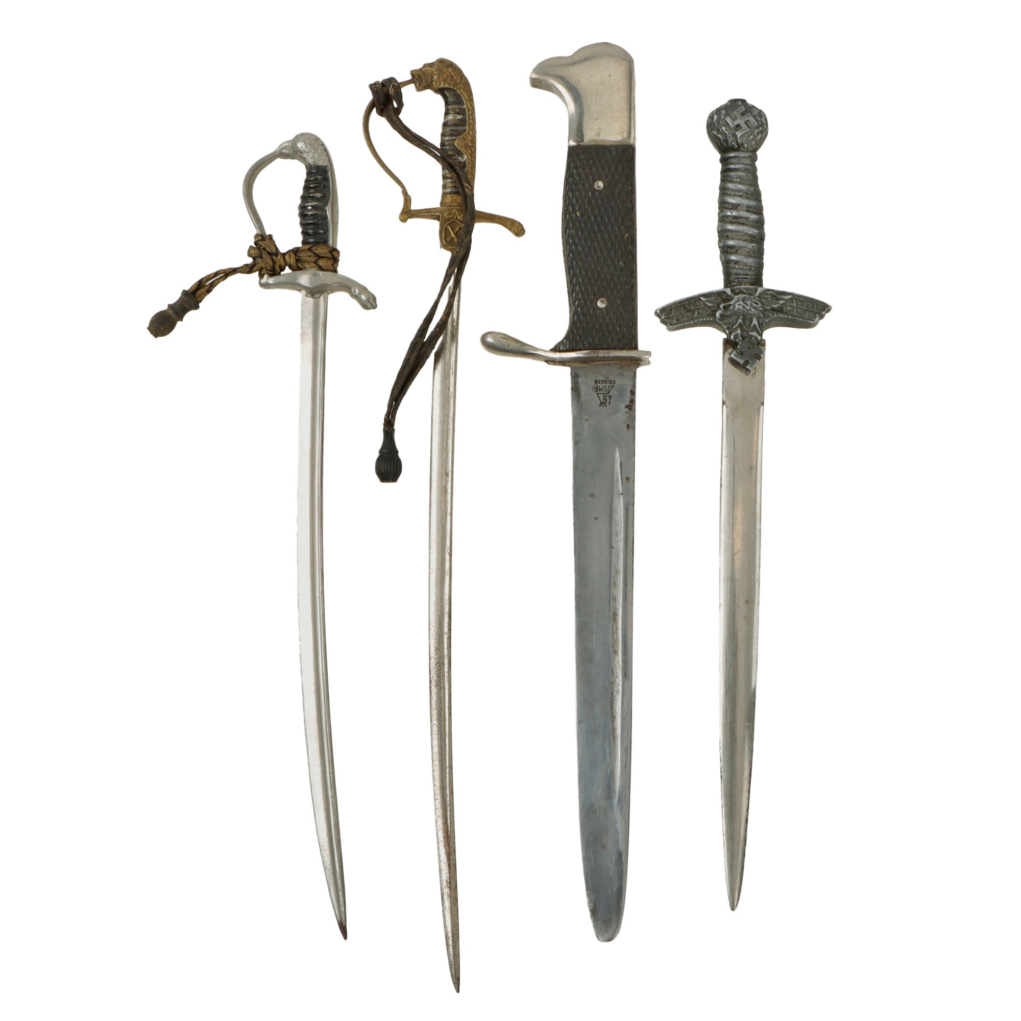 The miniature edged weapons are all nickel plated with steel blades cast into alloy hilts. Definitely a great little set of small German edged weapon items.